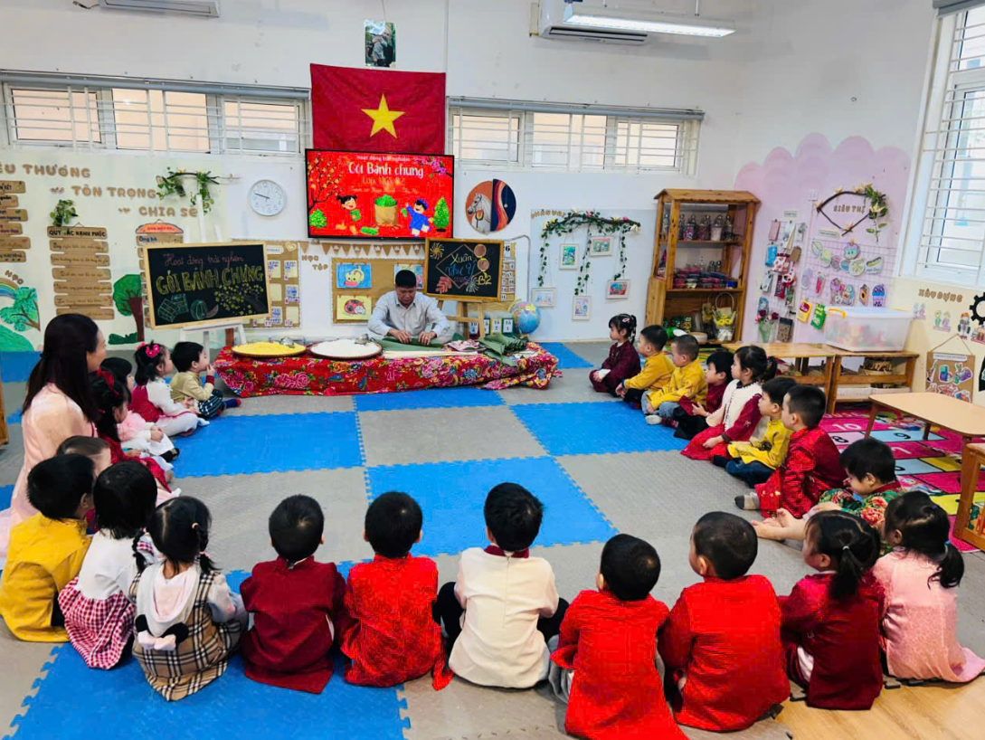Trong không gian được trang trí đậm sắc xuân các bé vô cùng háo hức khi được cô giáo giới thiệu về ý nghĩa của bánh chưng trong ngày Tết cổ truyền.