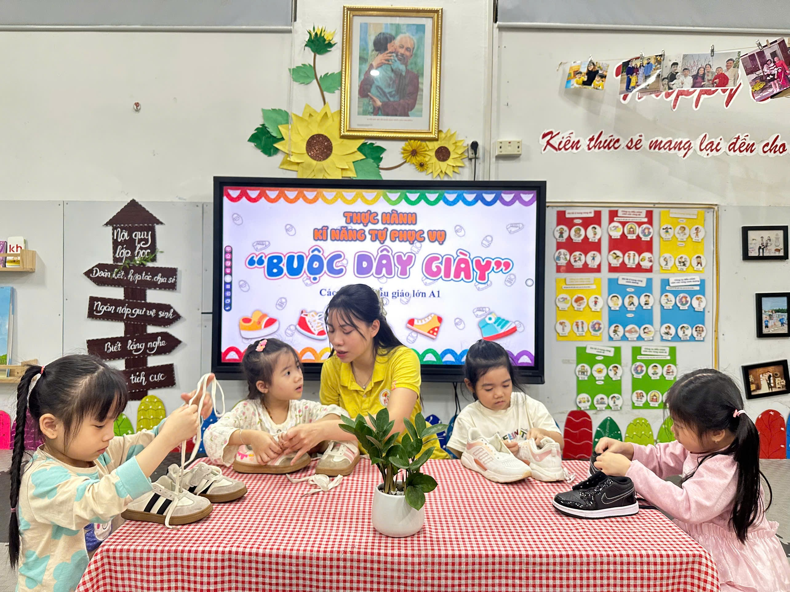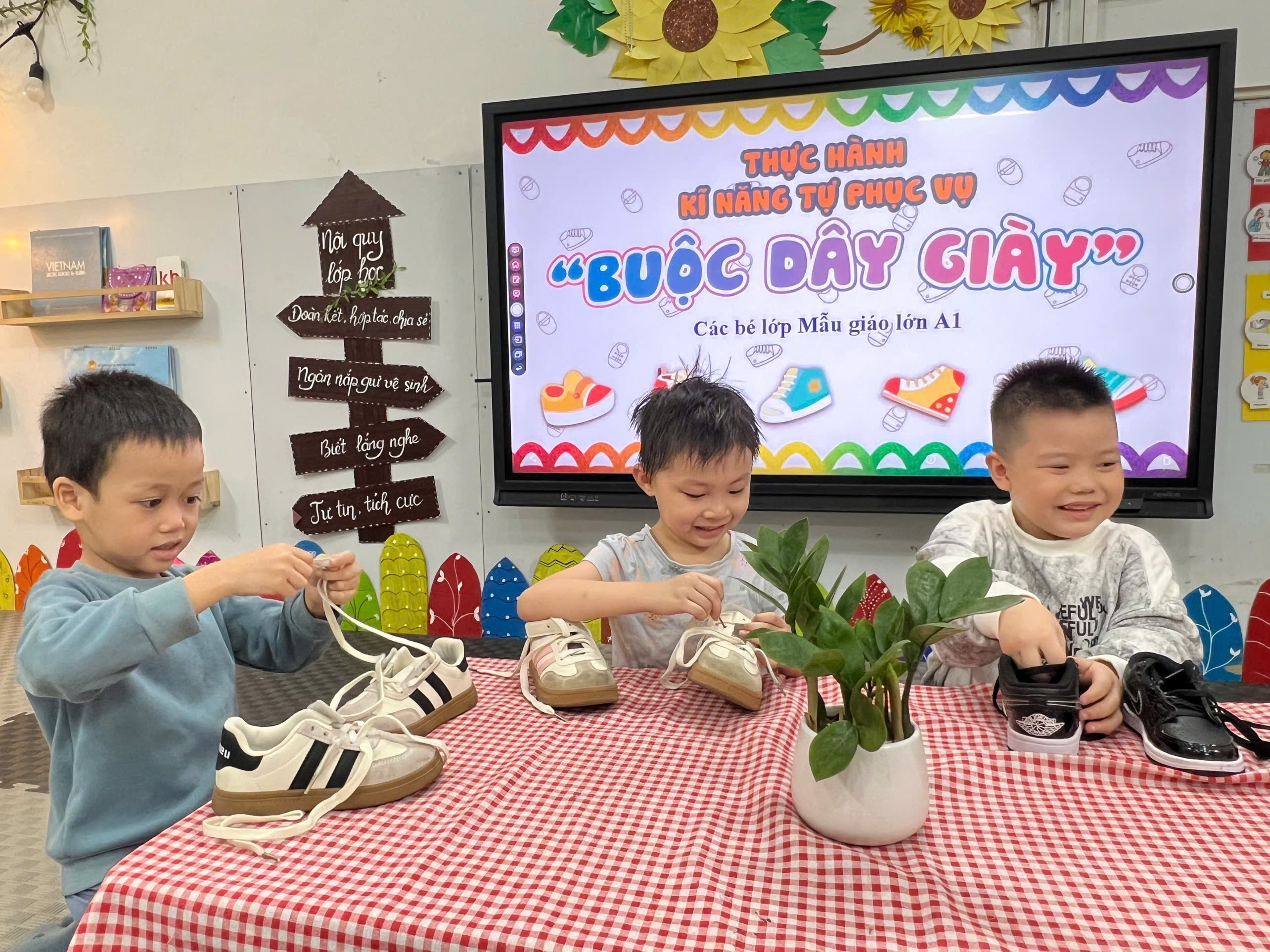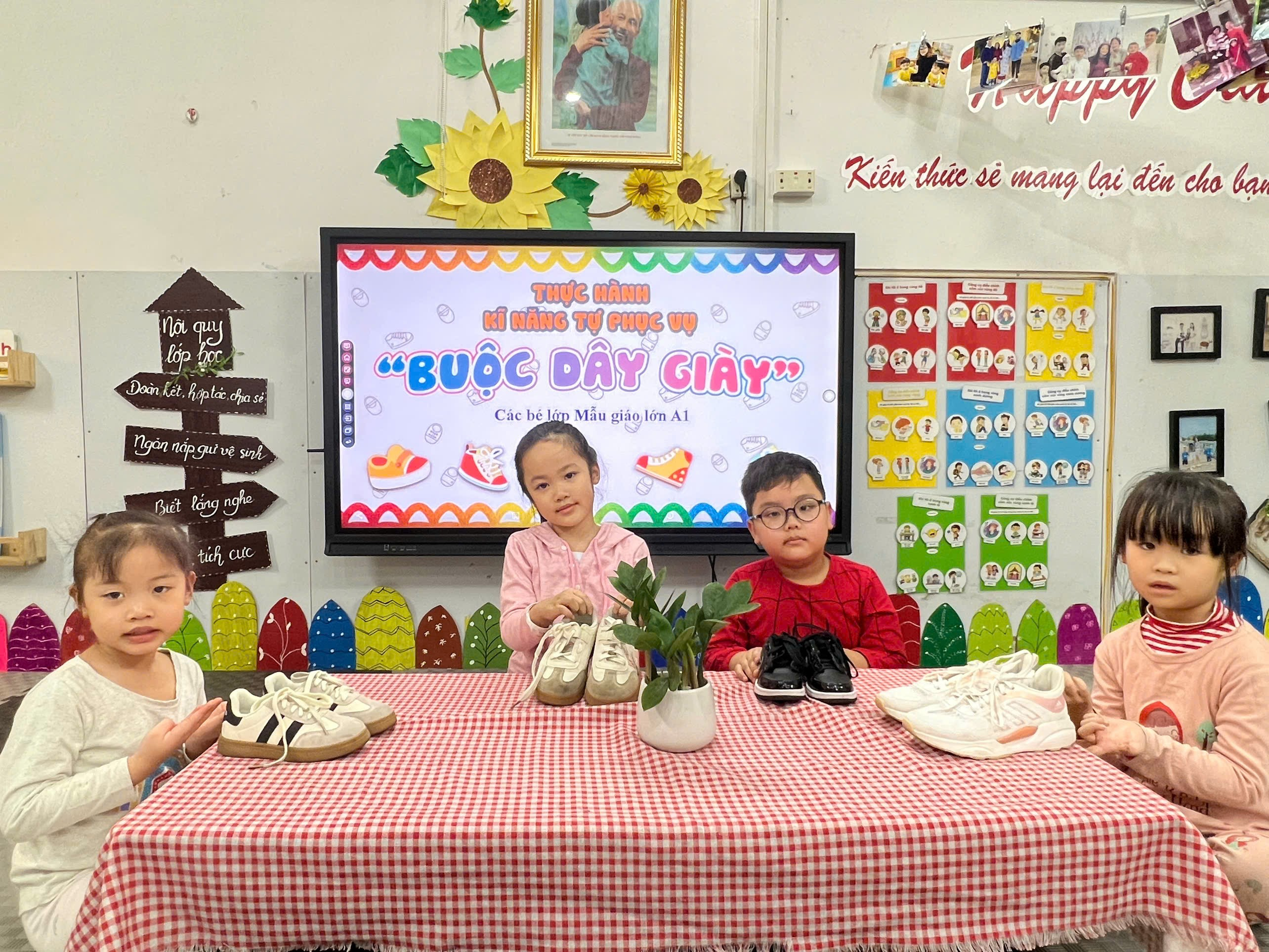 Các bé lớp A1 đã có một buổi học thật ý nghĩa khi thực hành kỹ năng buộc dây giày. Dưới sự hướng dẫn tận tình của cô giáo, từng đôi tay nhỏ nhắn bắt đầu học cách luồn dây, kéo dây và thắt thành chiếc nơ xinh xắn. Hoạt động không chỉ nâng cao khả năng tự phục vụ mà còn rèn cho trẻ sự kiên trì và tập trung. Bé nào cũng vô cùng tự hào khi khoe đôi giày được buộc ngay ngắn do chính mình hoàn thành. Cô giáo và nhà trường hy vọng mỗi trải nghiệm nhỏ như vậy sẽ giúp các con ngày càng trưởng thành hơn. Sau đây là các hình ảnh đáng yêu của các bé:
