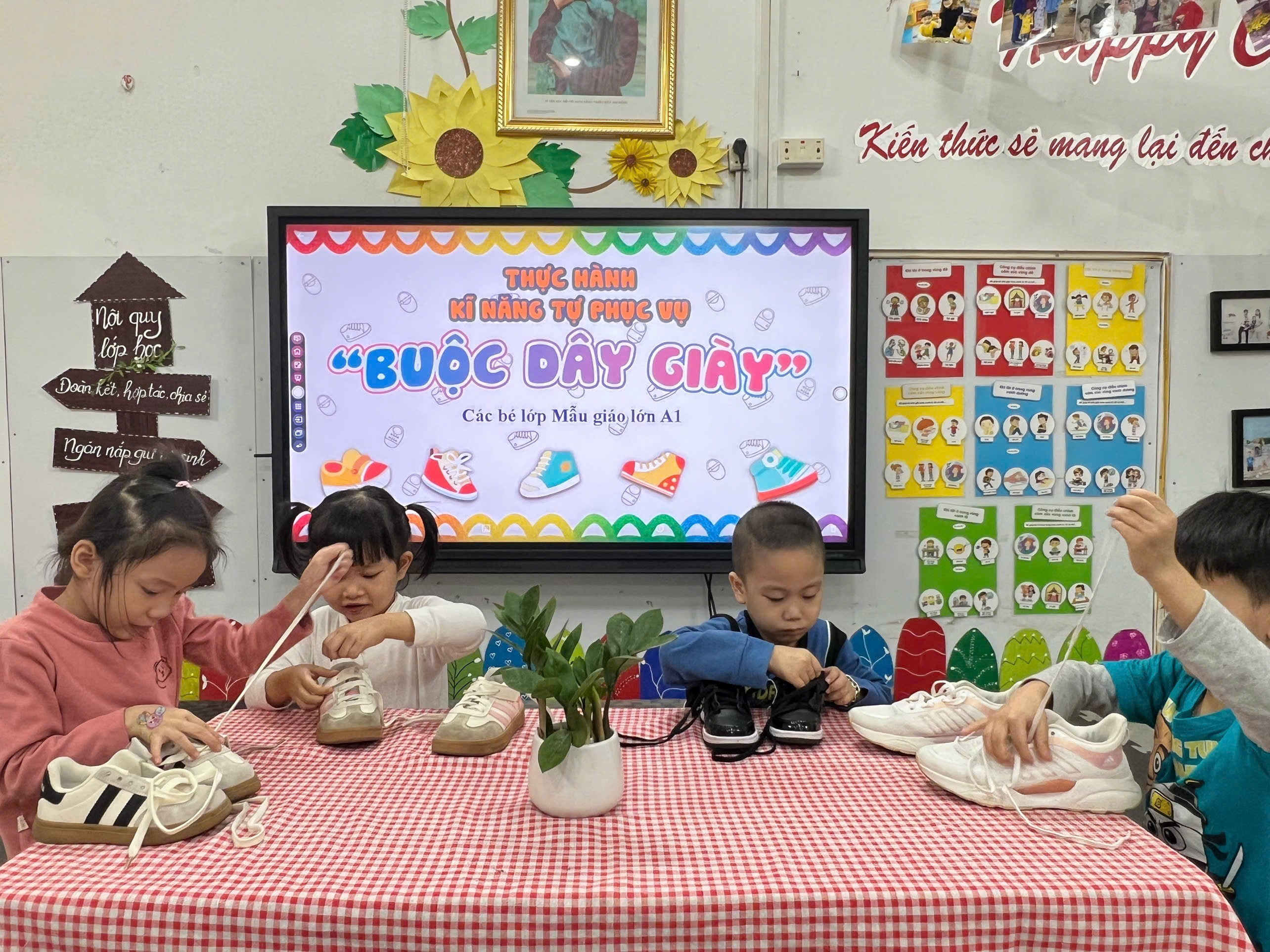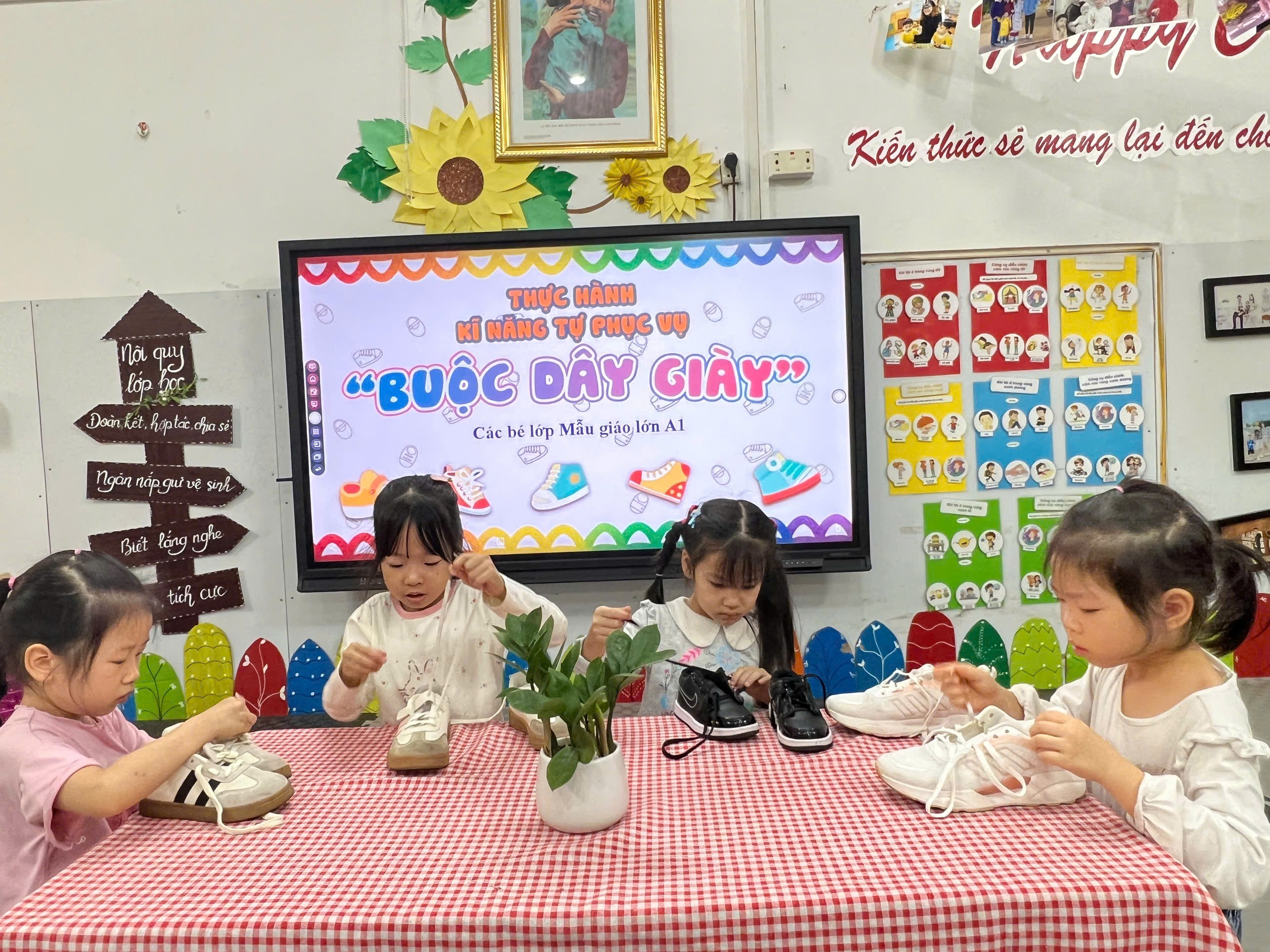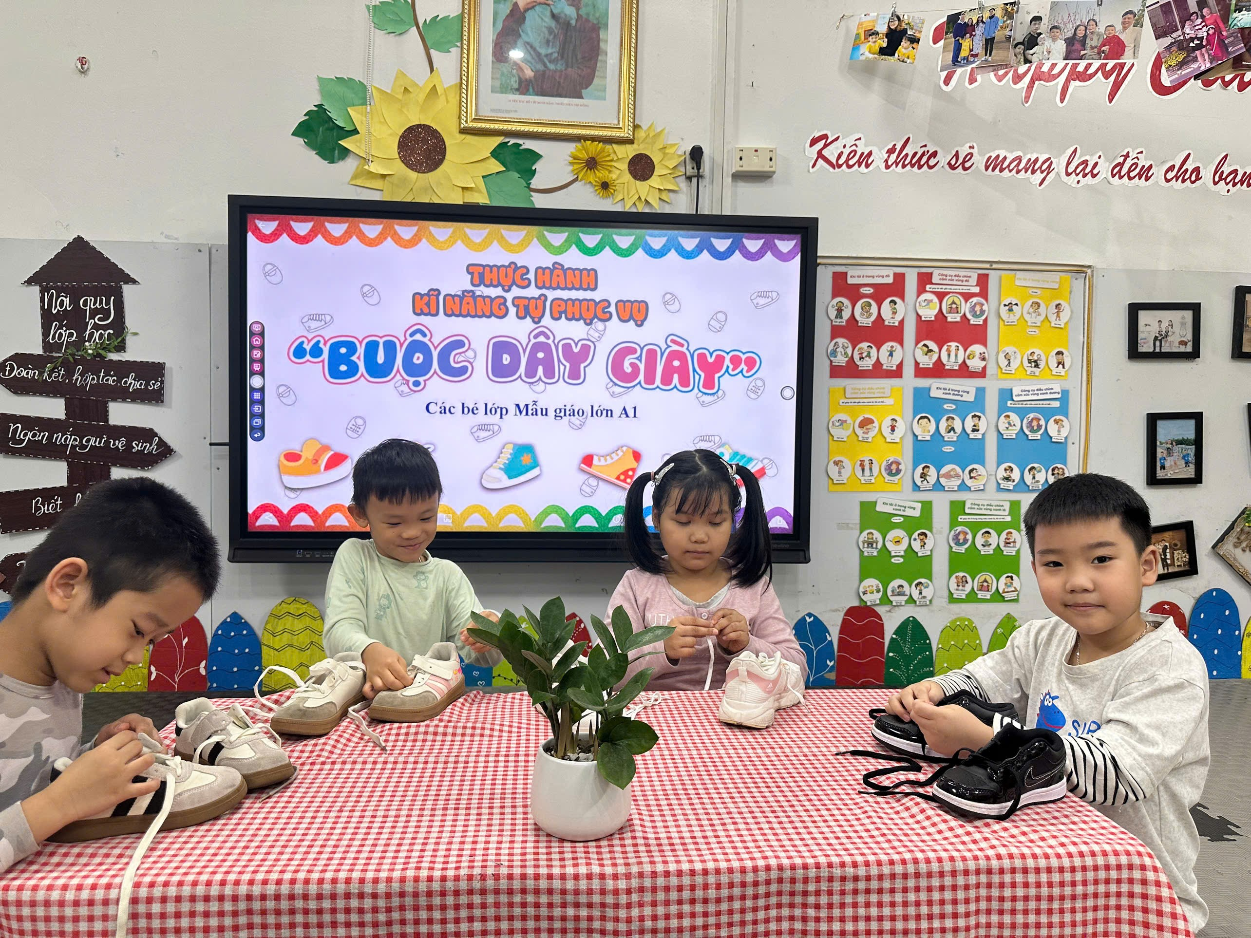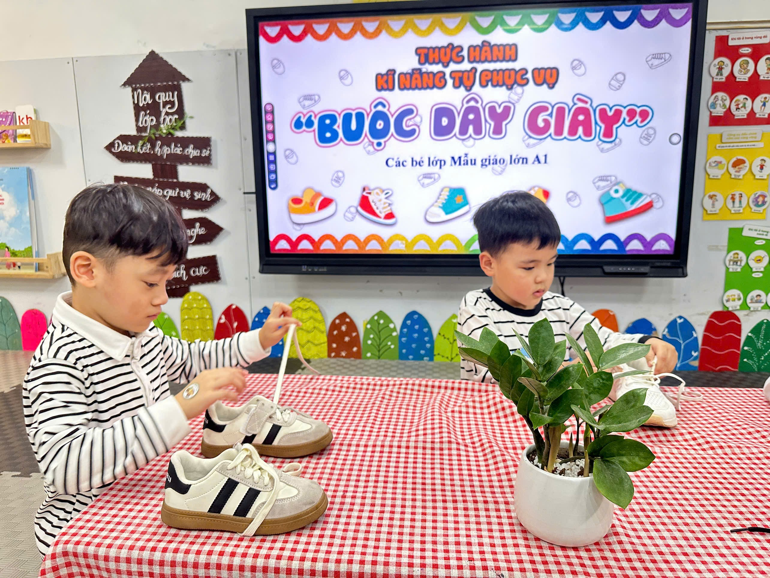 Các bé lớp A1 đã có một buổi học thật ý nghĩa khi thực hành kỹ năng buộc dây giày. Dưới sự hướng dẫn tận tình của cô giáo, từng đôi tay nhỏ nhắn bắt đầu học cách luồn dây, kéo dây và thắt thành chiếc nơ xinh xắn. Hoạt động không chỉ nâng cao khả năng tự phục vụ mà còn rèn cho trẻ sự kiên trì và tập trung. Bé nào cũng vô cùng tự hào khi khoe đôi giày được buộc ngay ngắn do chính mình hoàn thành. Cô giáo và nhà trường hy vọng mỗi trải nghiệm nhỏ như vậy sẽ giúp các con ngày càng trưởng thành hơn. Sau đây là các hình ảnh đáng yêu của các bé: