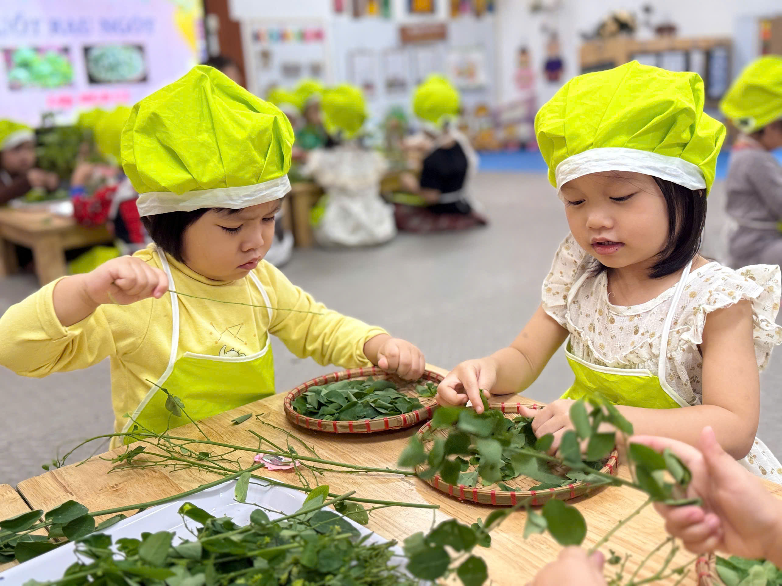 Những bó rau ngót xanh mướt được cô giáo chuẩn bị sẵn, từng rổ lá được đặt ngay ngắn trên bàn. Dưới sự hướng dẫn tỉ mỉ của cô, các bé hào hứng ngồi quây quần bên nhau, bắt đầu học cách tuốt từng chiếc lá rau.