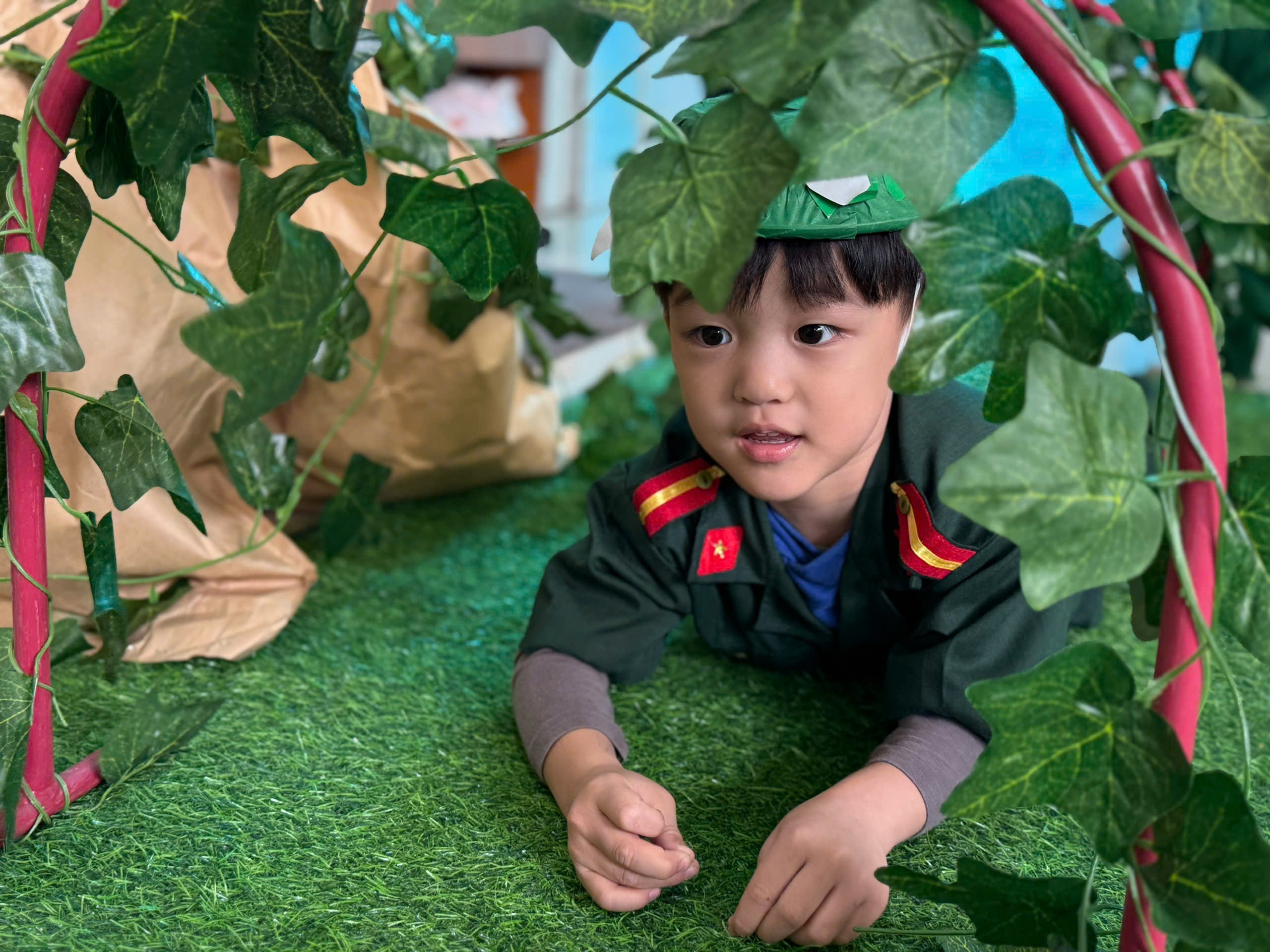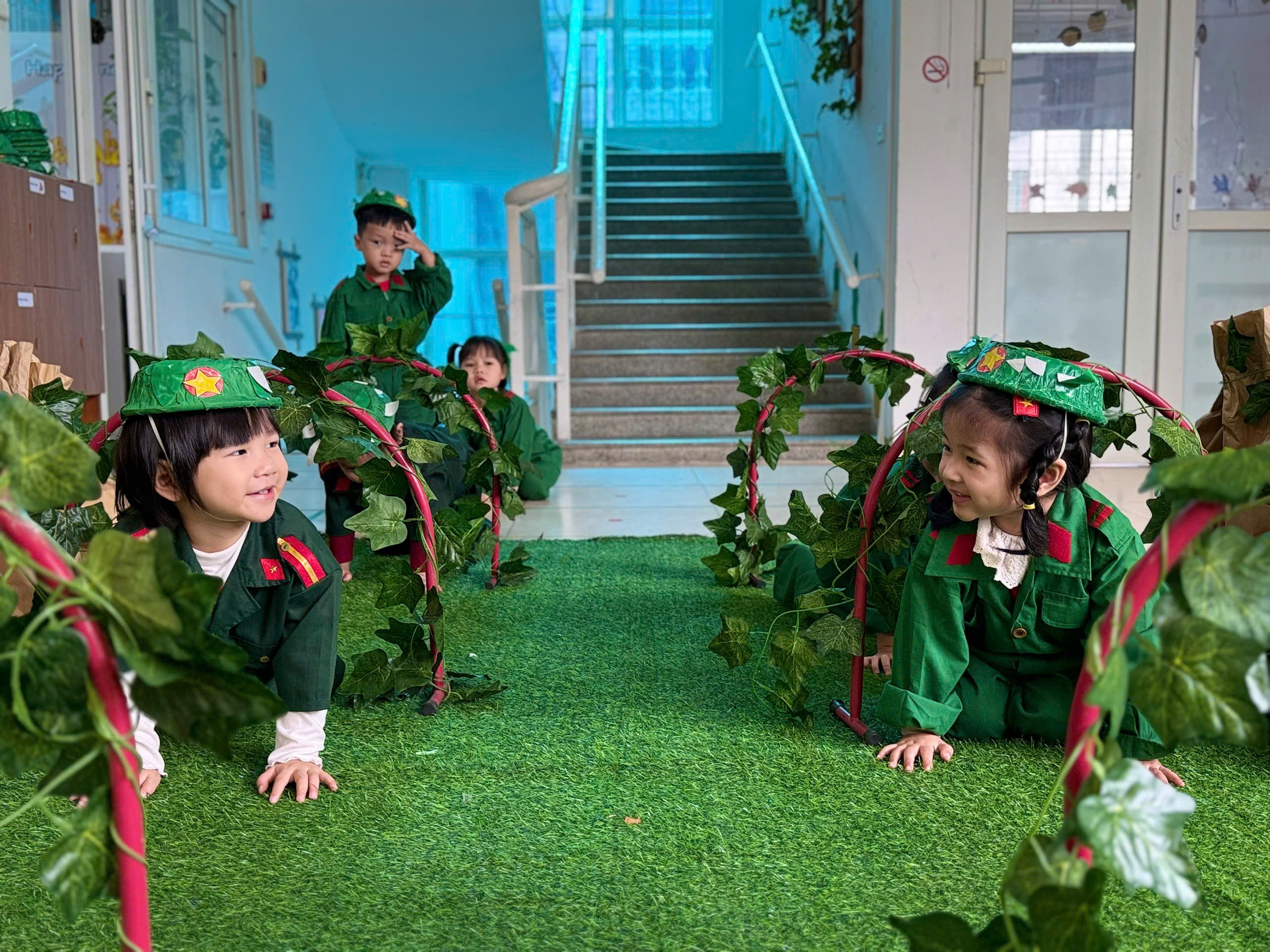 Trong tiếng nhạc vui tươi, các bé hóa thân thành những “Chiến sĩ nhí” dũng cảm, khéo léo bò thấp người, phối hợp tay – chân nhịp nhàng để chui qua cổng an toàn. Mỗi ánh mắt tập trung, mỗi nụ cười rạng rỡ đều thể hiện sự tự tin, mạnh dạn và quyết tâm vượt qua thử thách.