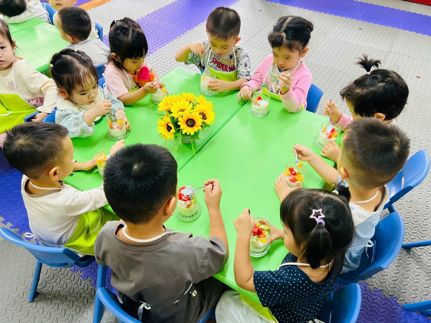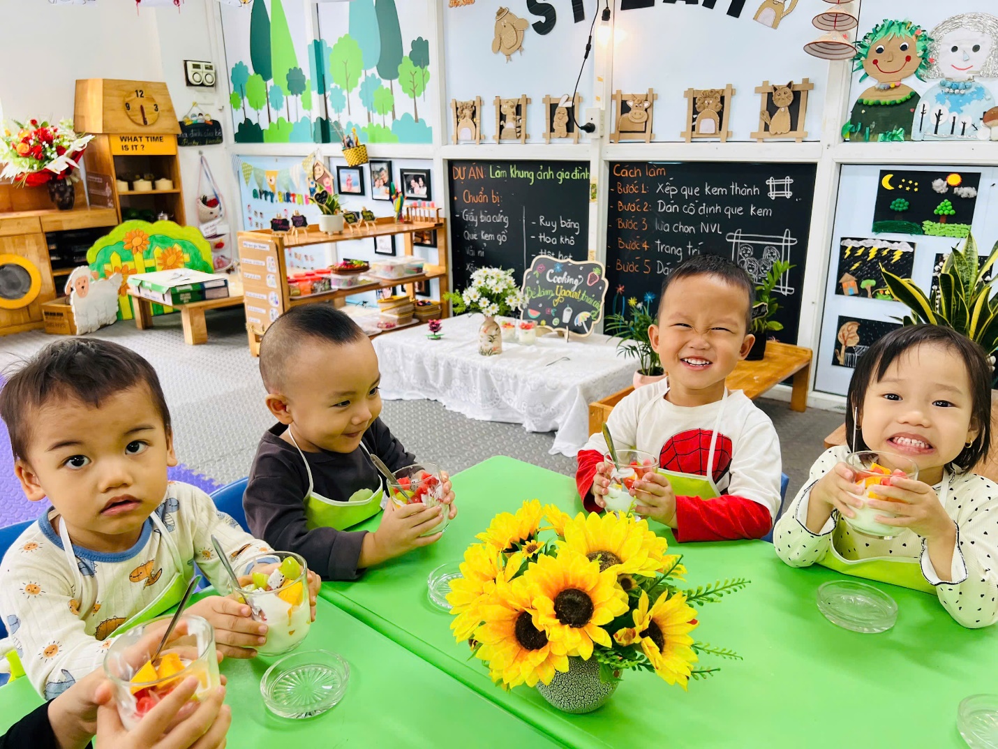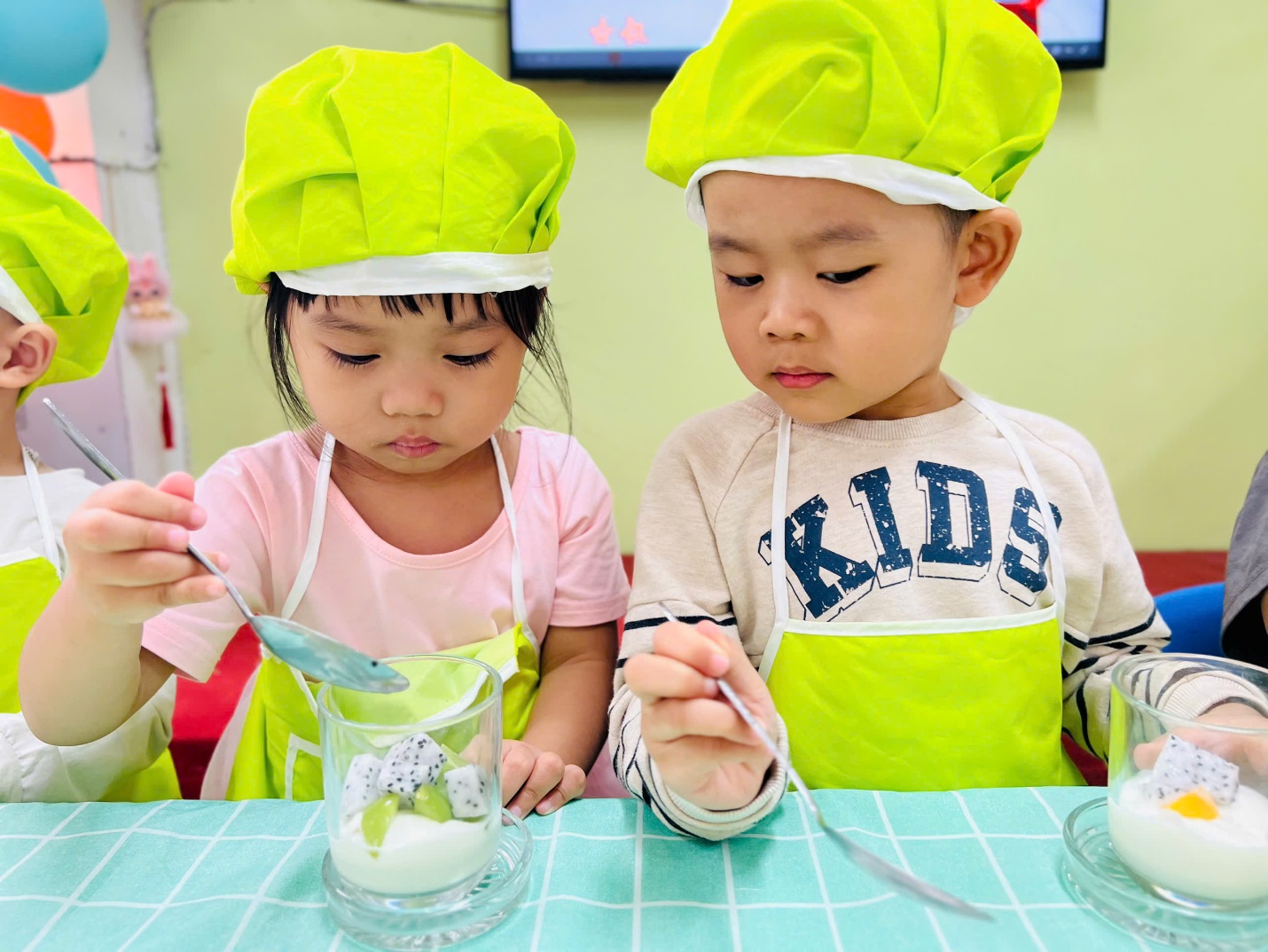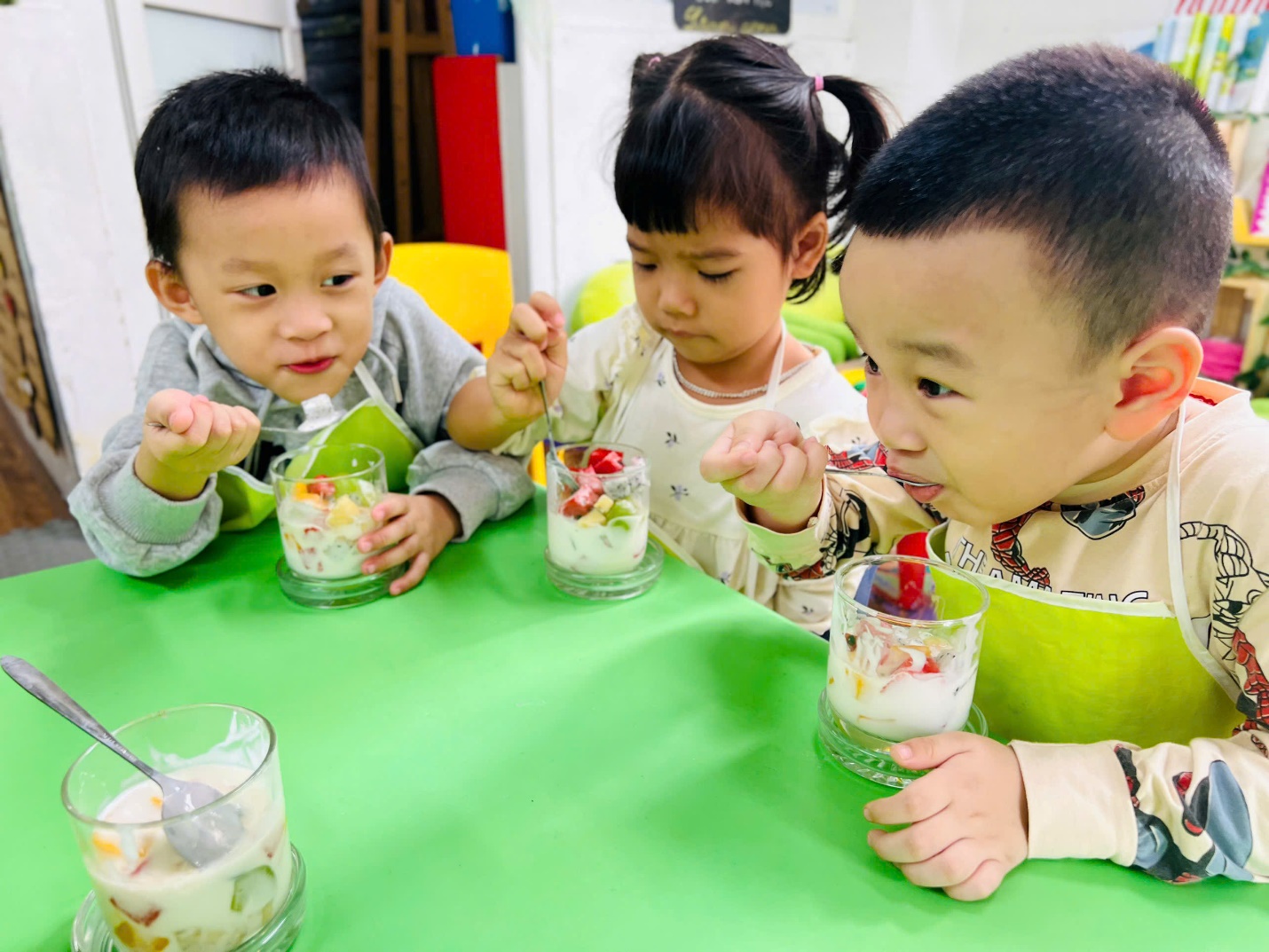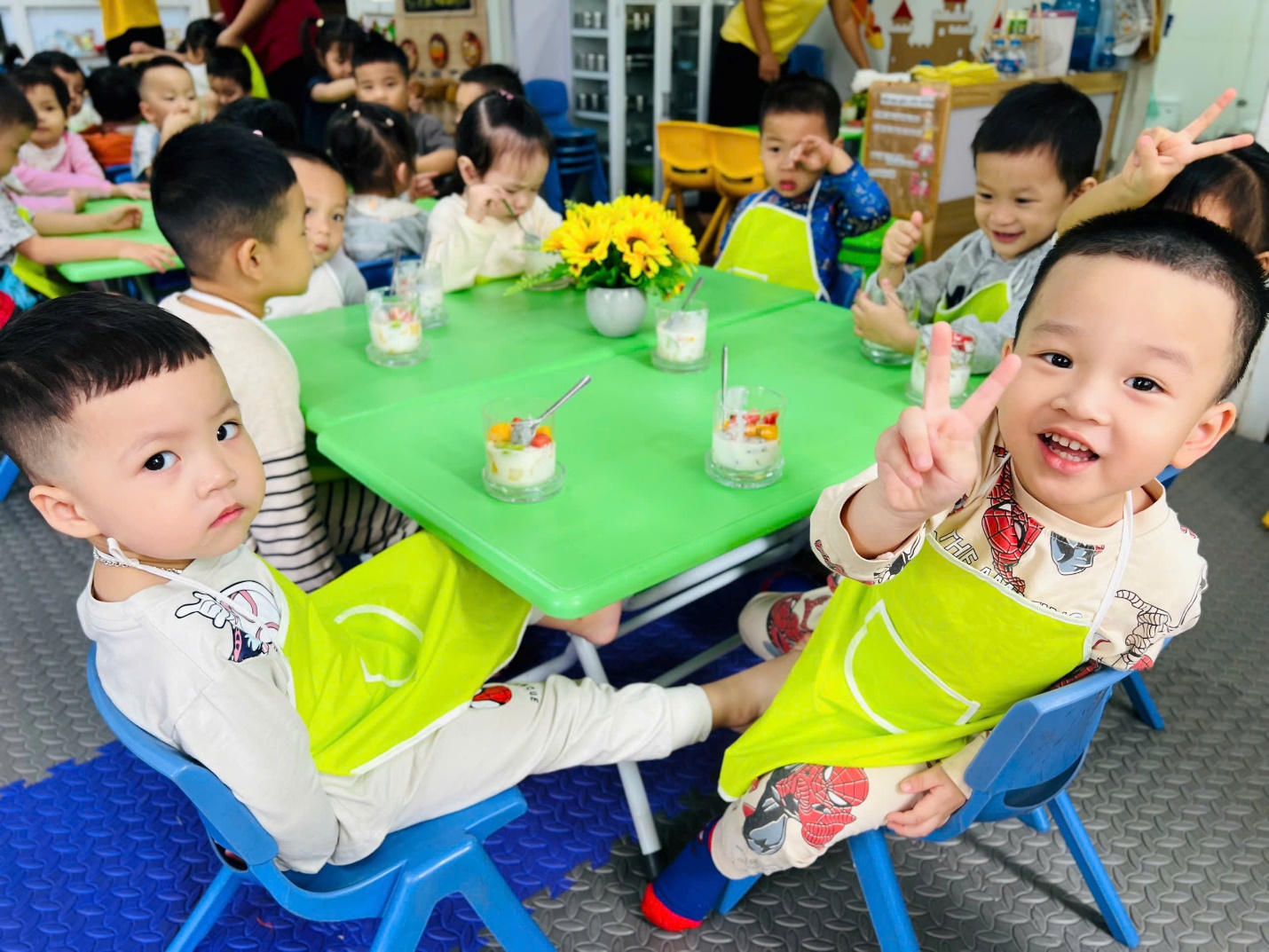 Thành phẩm không chỉ đẹp mắt mà còn mát lành và thơm ngon. Các con cùng nhau thưởng thức món yaourt do chính tay mình làm, ai nấy đều tươi cười thích thú, vừa ăn vừa xuýt xoa: “Ngon quá cô ơi!”. Qua hoạt động này, các bé học được cách giữ vệ sinh khi chế biến thực phẩm, biết phối hợp cùng bạn bè và cảm nhận niềm vui từ lao động sáng tạo.