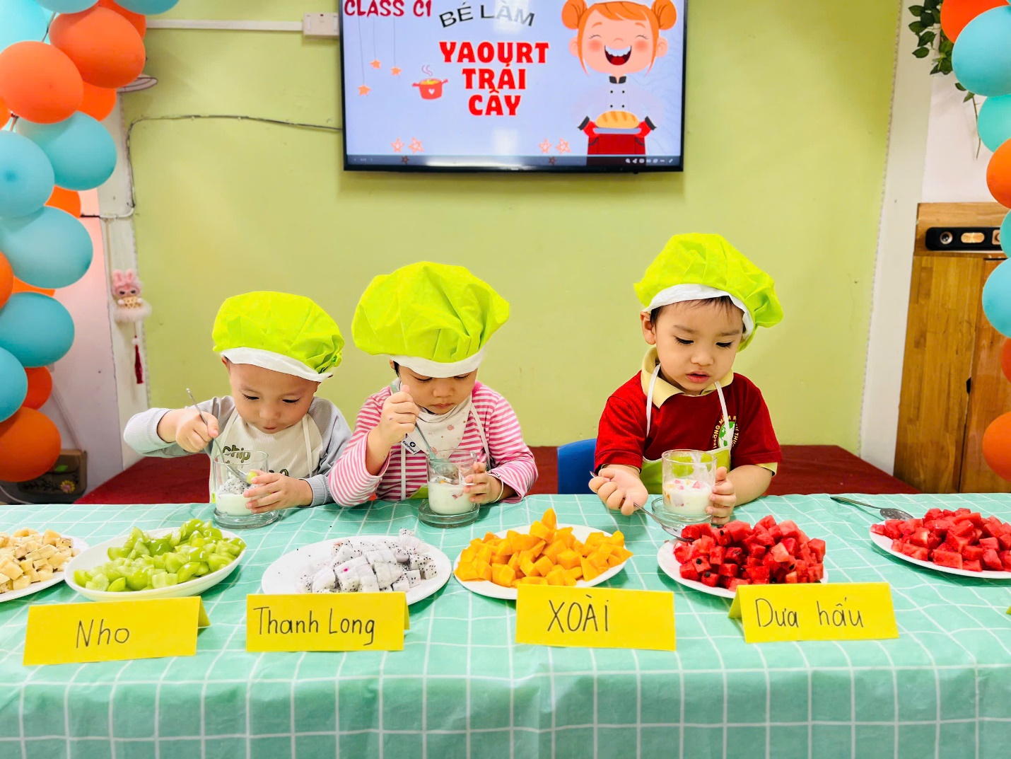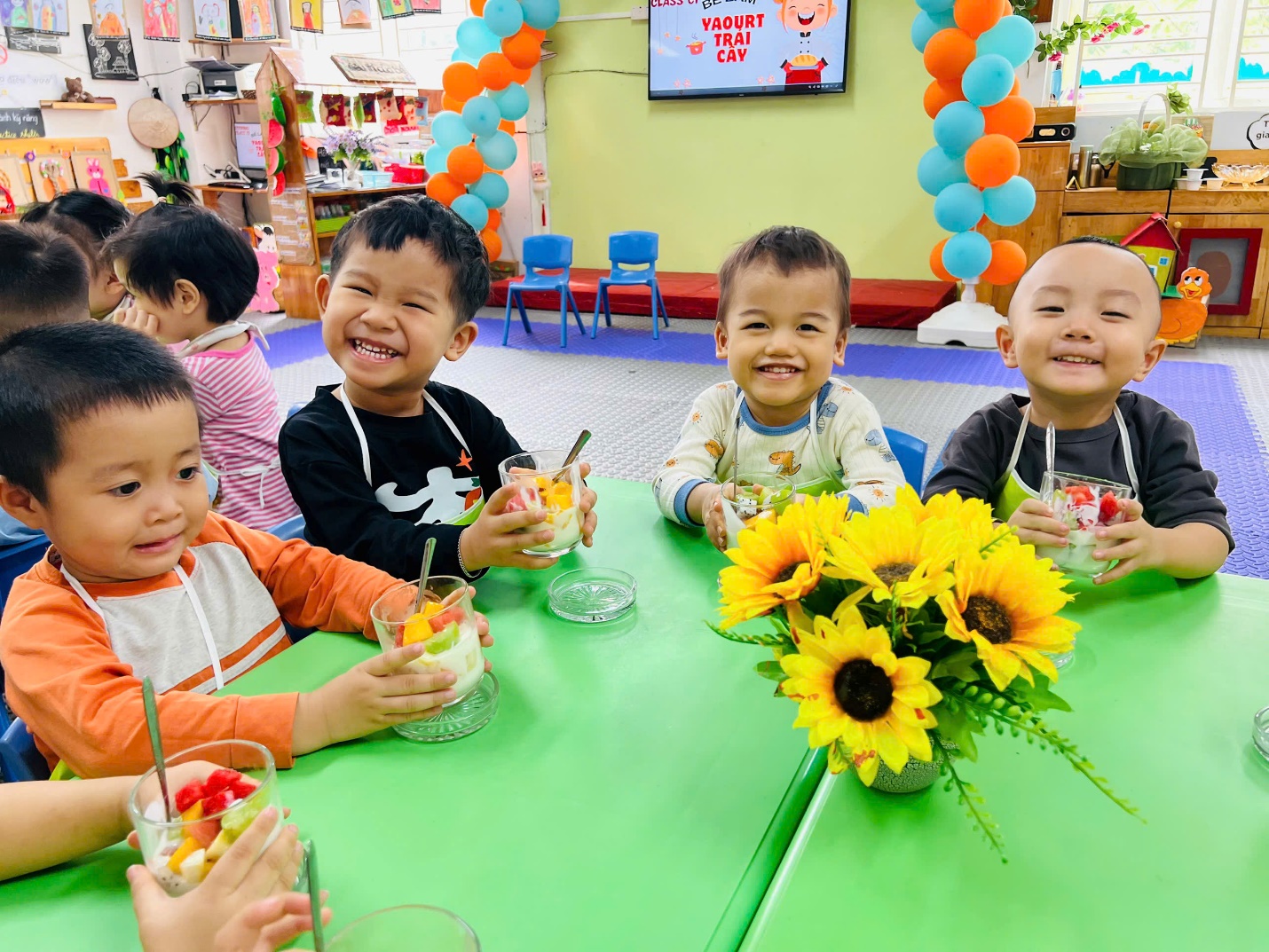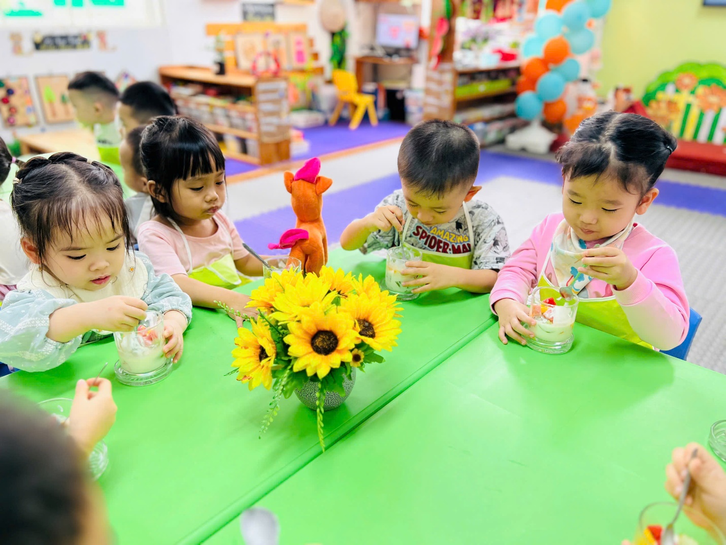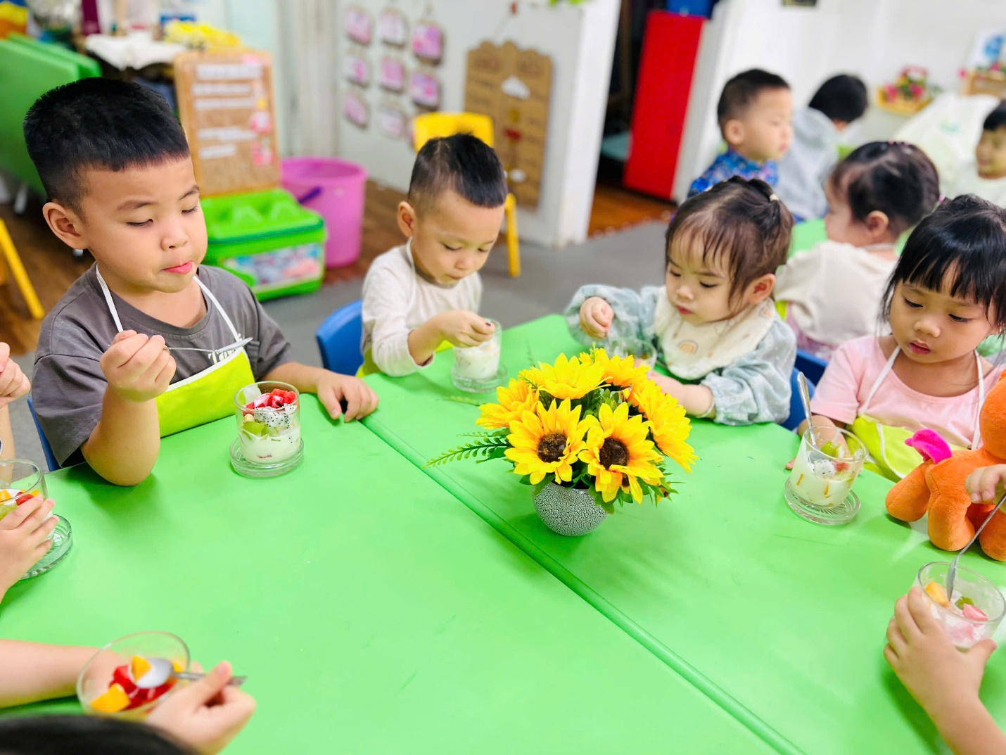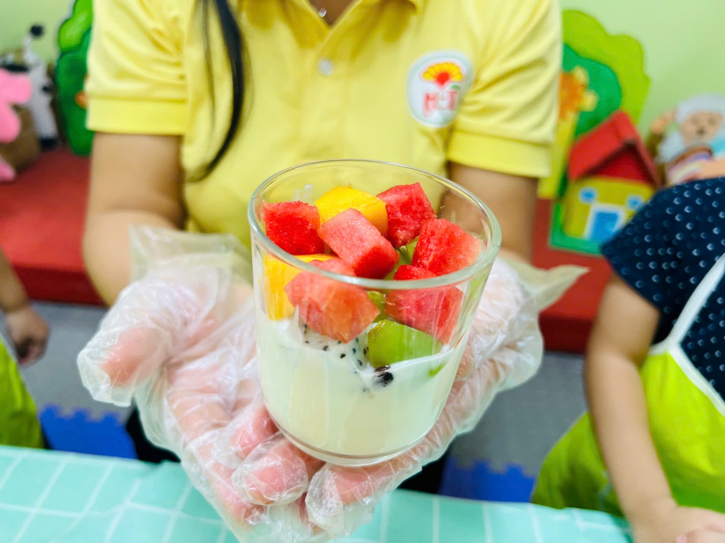 Thành phẩm không chỉ đẹp mắt mà còn mát lành và thơm ngon. Các con cùng nhau thưởng thức món yaourt do chính tay mình làm, ai nấy đều tươi cười thích thú, vừa ăn vừa xuýt xoa: “Ngon quá cô ơi!”. Qua hoạt động này, các bé học được cách giữ vệ sinh khi chế biến thực phẩm, biết phối hợp cùng bạn bè và cảm nhận niềm vui từ lao động sáng tạo.