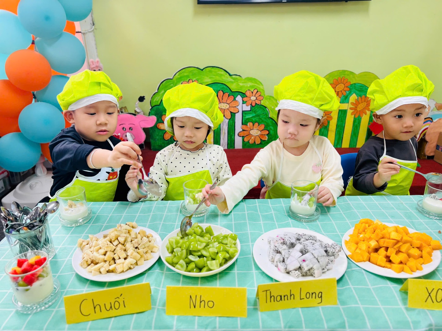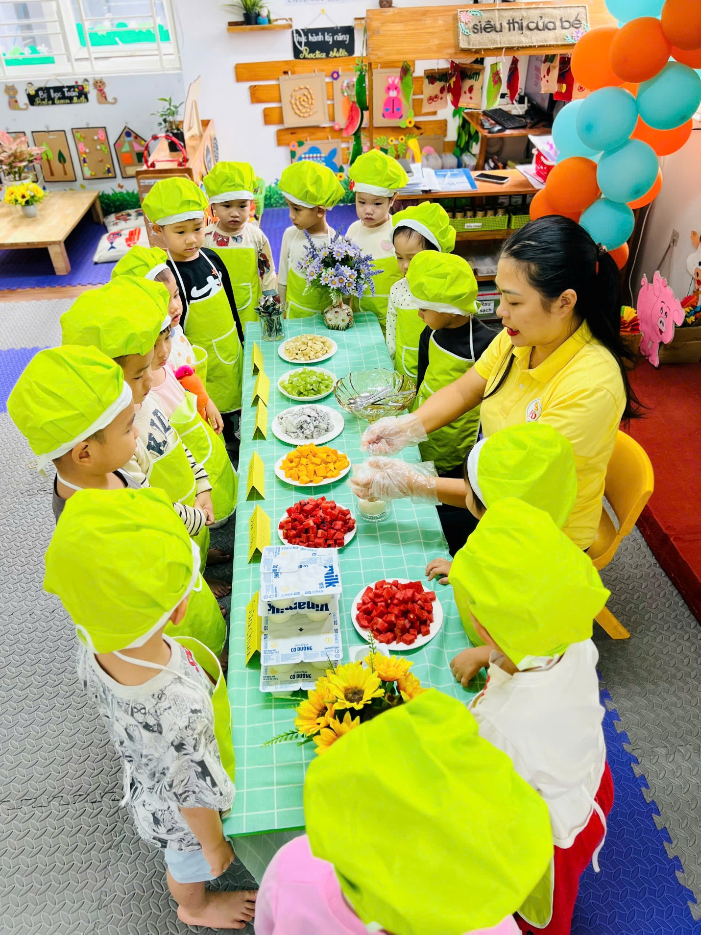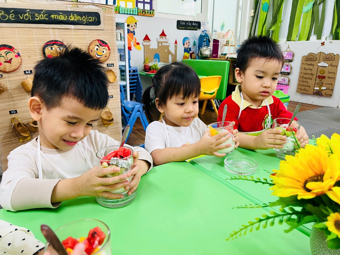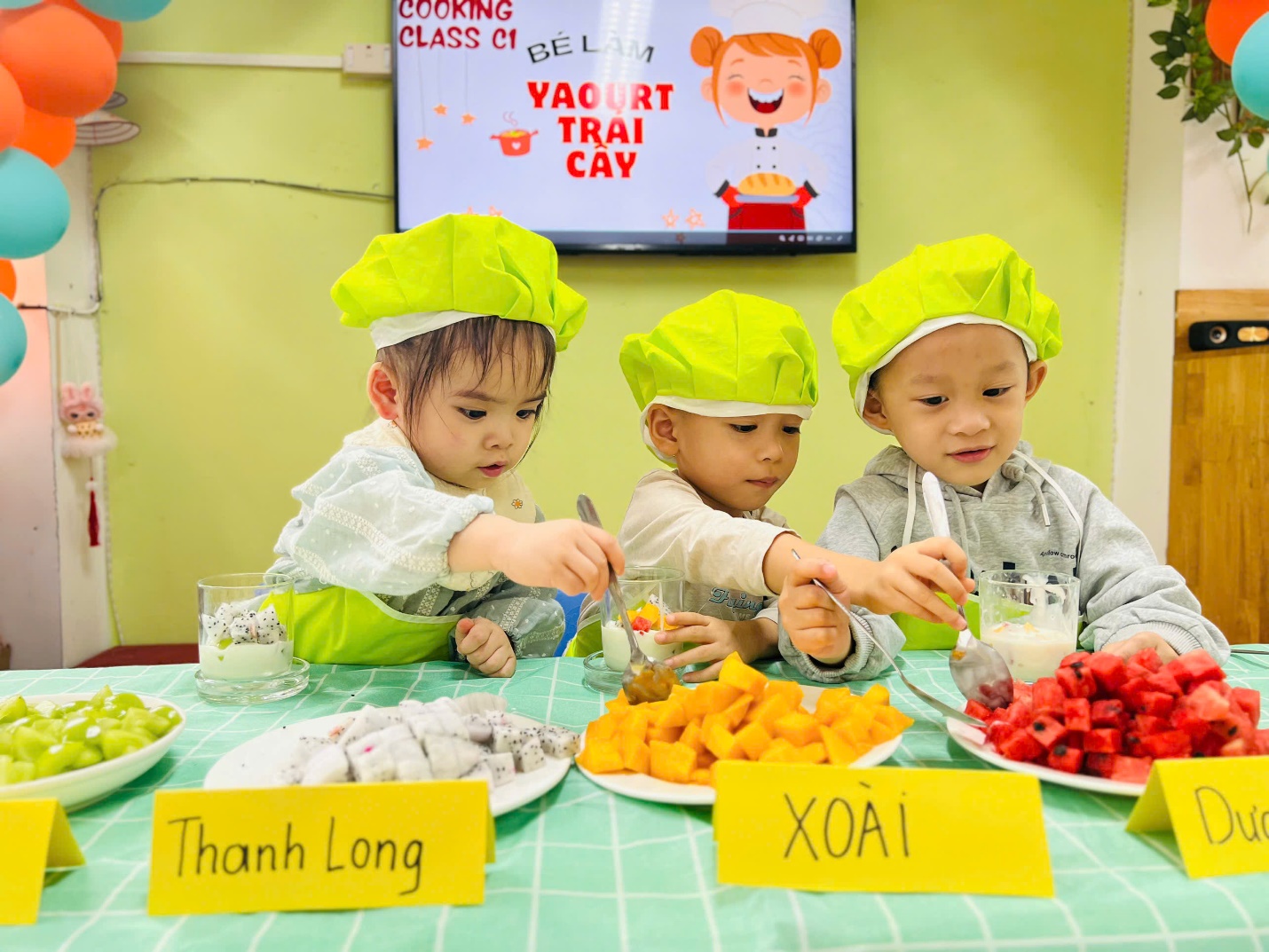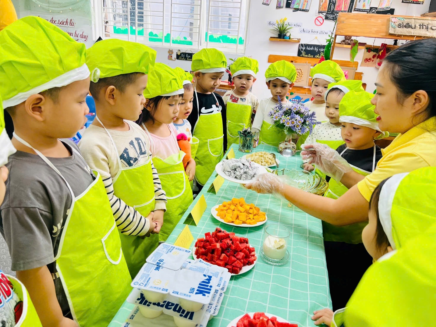 Thành phẩm không chỉ đẹp mắt mà còn mát lành và thơm ngon. Các con cùng nhau thưởng thức món yaourt do chính tay mình làm, ai nấy đều tươi cười thích thú, vừa ăn vừa xuýt xoa: “Ngon quá cô ơi!”. Qua hoạt động này, các bé học được cách giữ vệ sinh khi chế biến thực phẩm, biết phối hợp cùng bạn bè và cảm nhận niềm vui từ lao động sáng tạo.