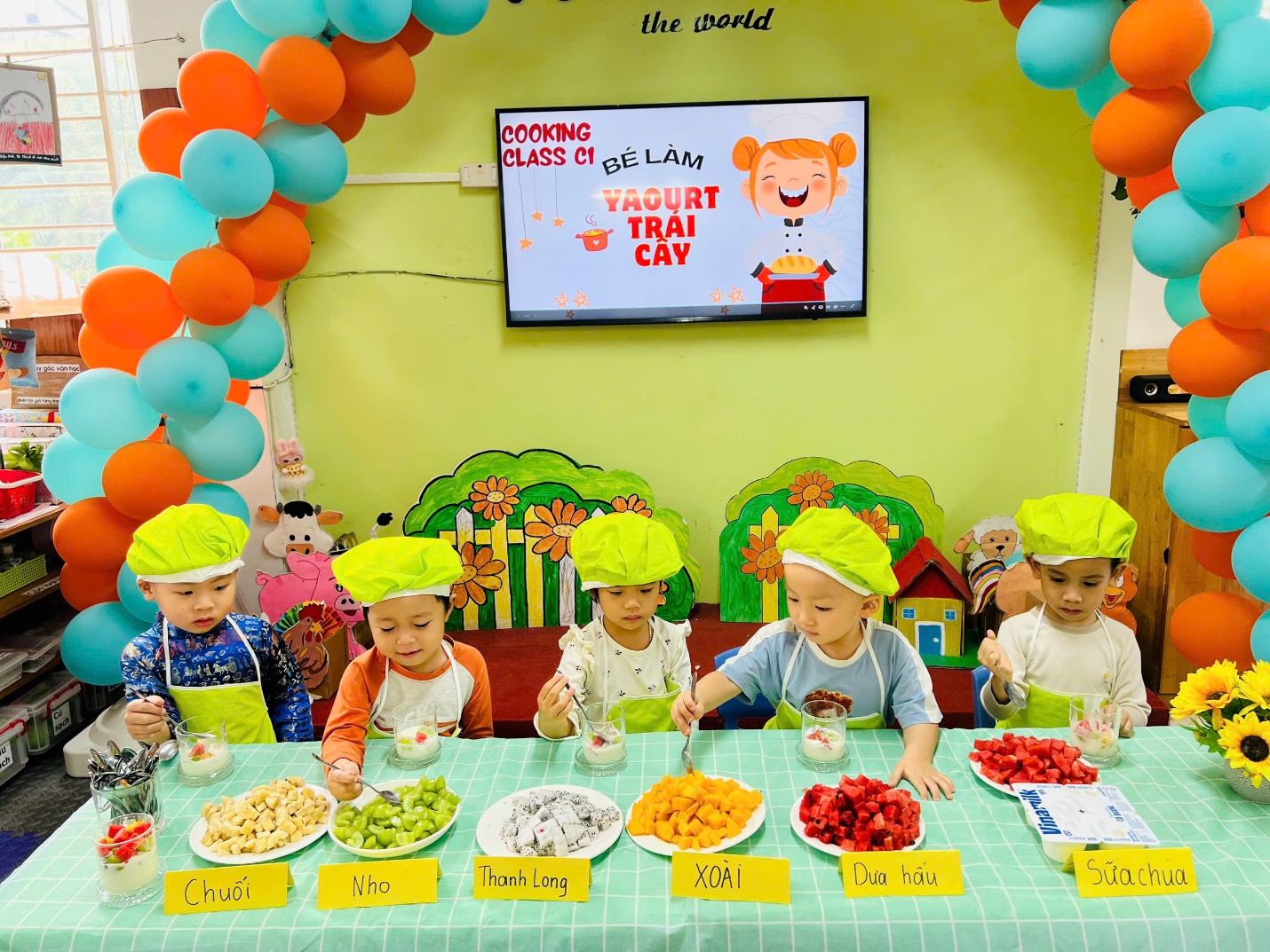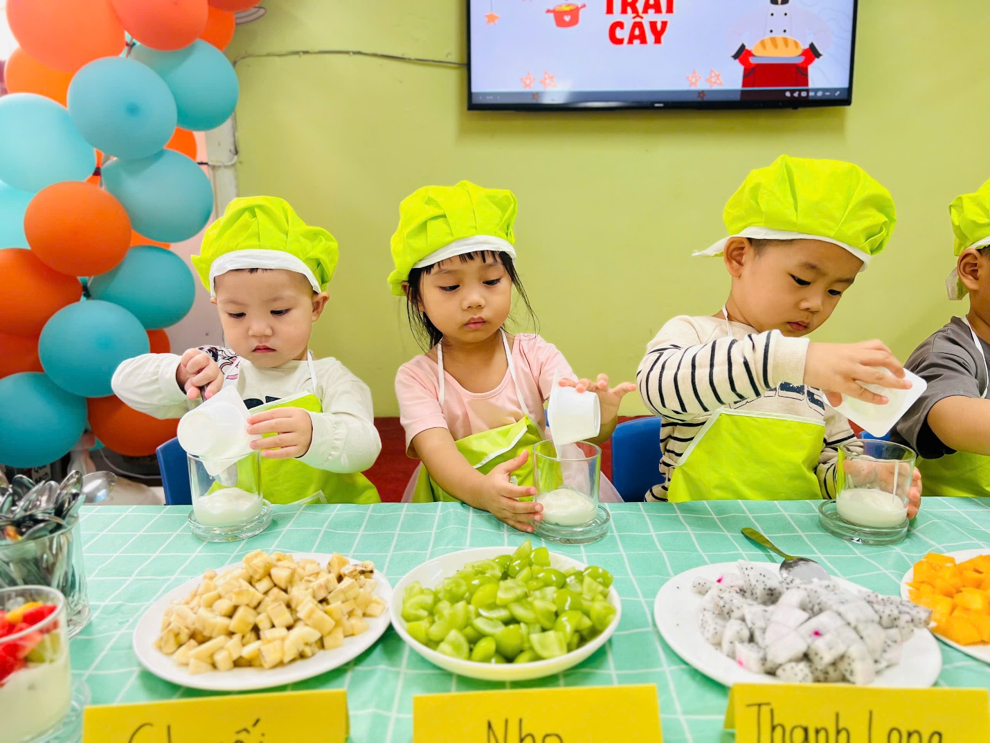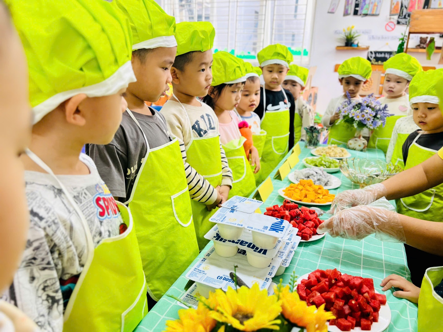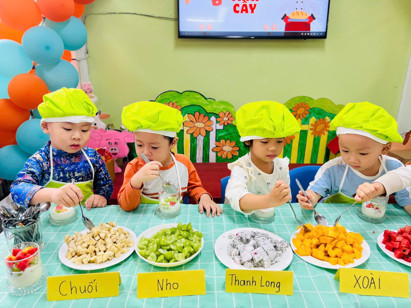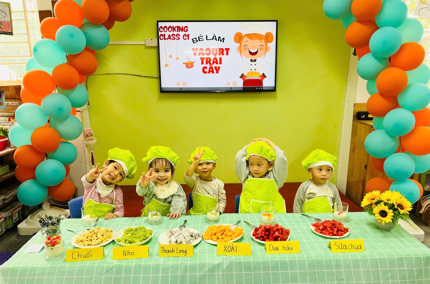 Thành phẩm không chỉ đẹp mắt mà còn mát lành và thơm ngon. Các con cùng nhau thưởng thức món yaourt do chính tay mình làm, ai nấy đều tươi cười thích thú, vừa ăn vừa xuýt xoa: “Ngon quá cô ơi!”. Qua hoạt động này, các bé học được cách giữ vệ sinh khi chế biến thực phẩm, biết phối hợp cùng bạn bè và cảm nhận niềm vui từ lao động sáng tạo.