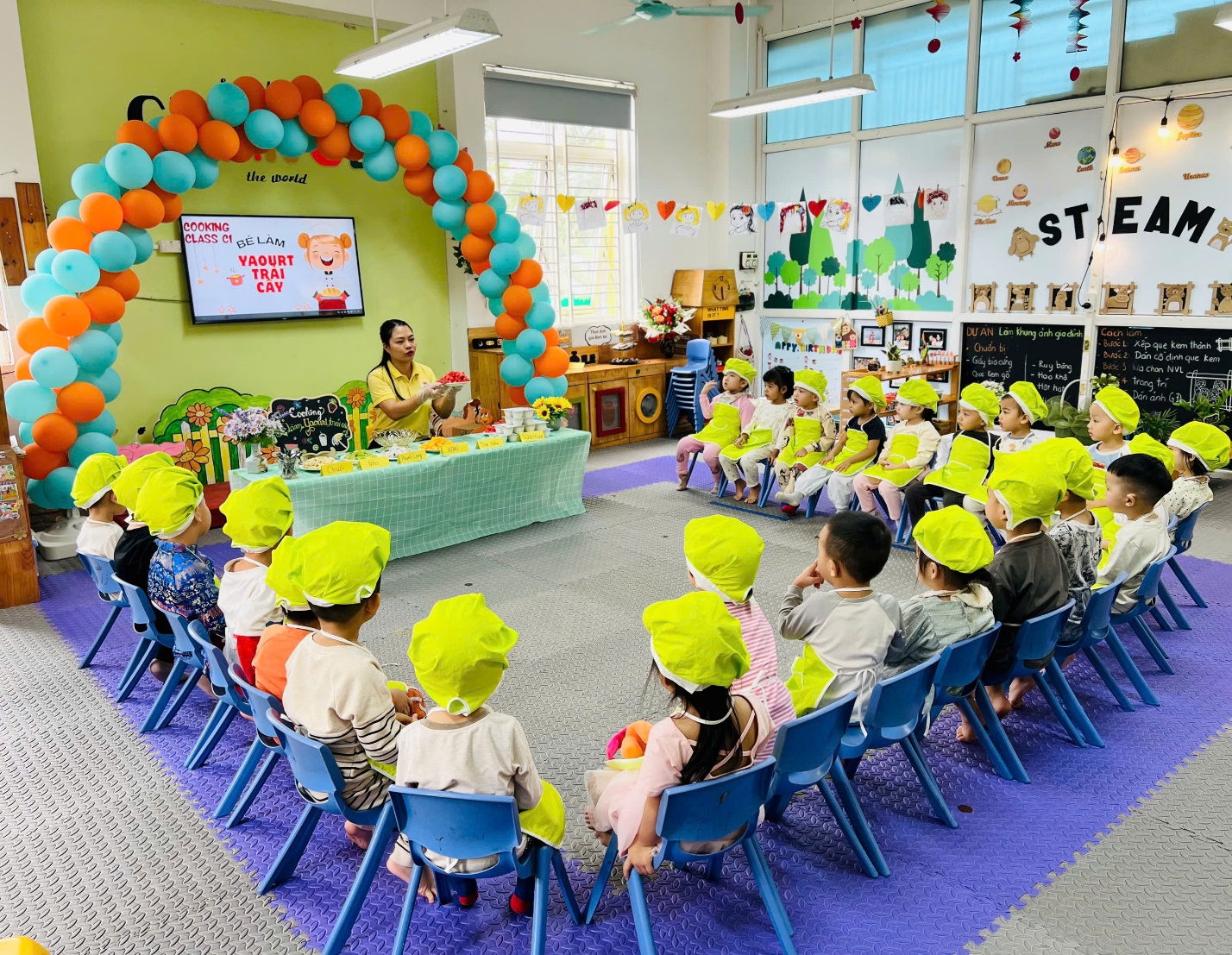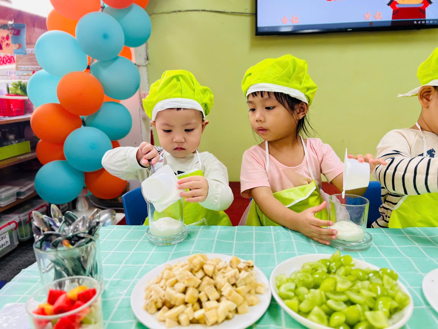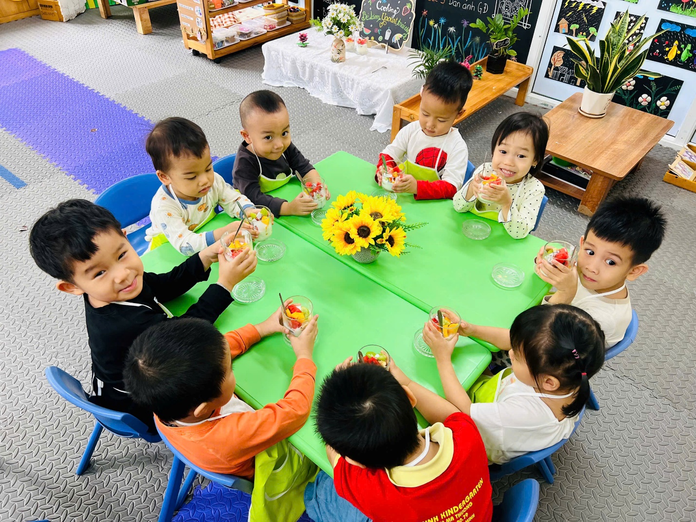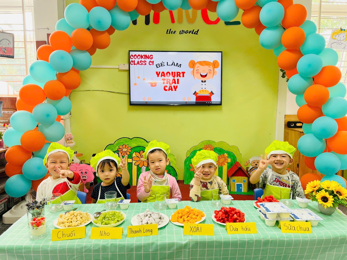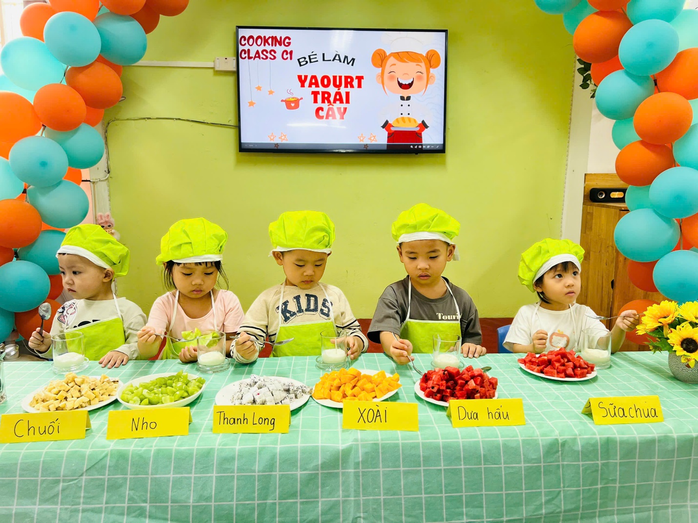 Thành phẩm không chỉ đẹp mắt mà còn mát lành và thơm ngon. Các con cùng nhau thưởng thức món yaourt do chính tay mình làm, ai nấy đều tươi cười thích thú, vừa ăn vừa xuýt xoa: “Ngon quá cô ơi!”. Qua hoạt động này, các bé học được cách giữ vệ sinh khi chế biến thực phẩm, biết phối hợp cùng bạn bè và cảm nhận niềm vui từ lao động sáng tạo.