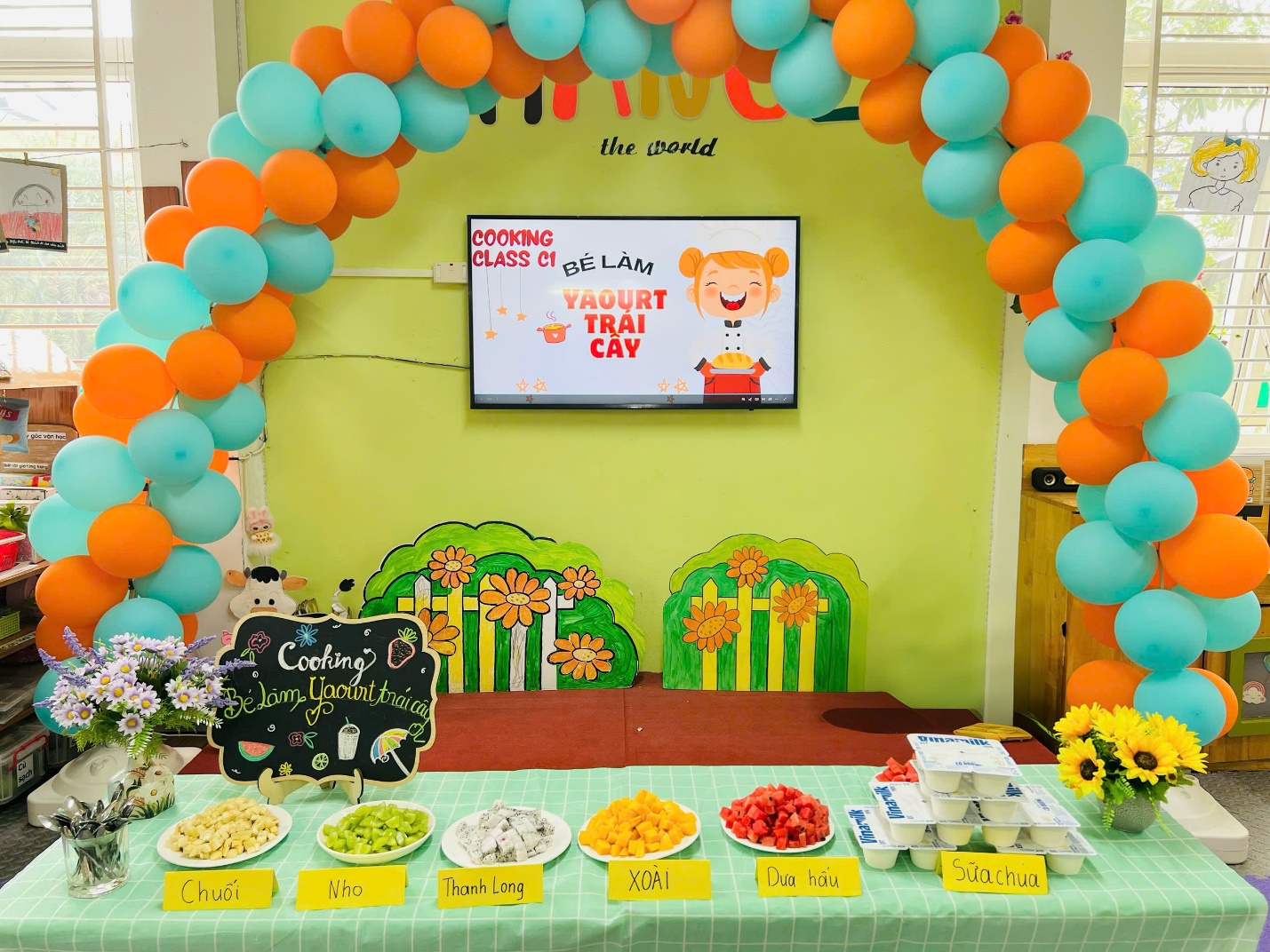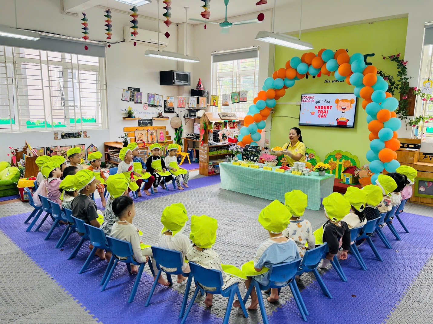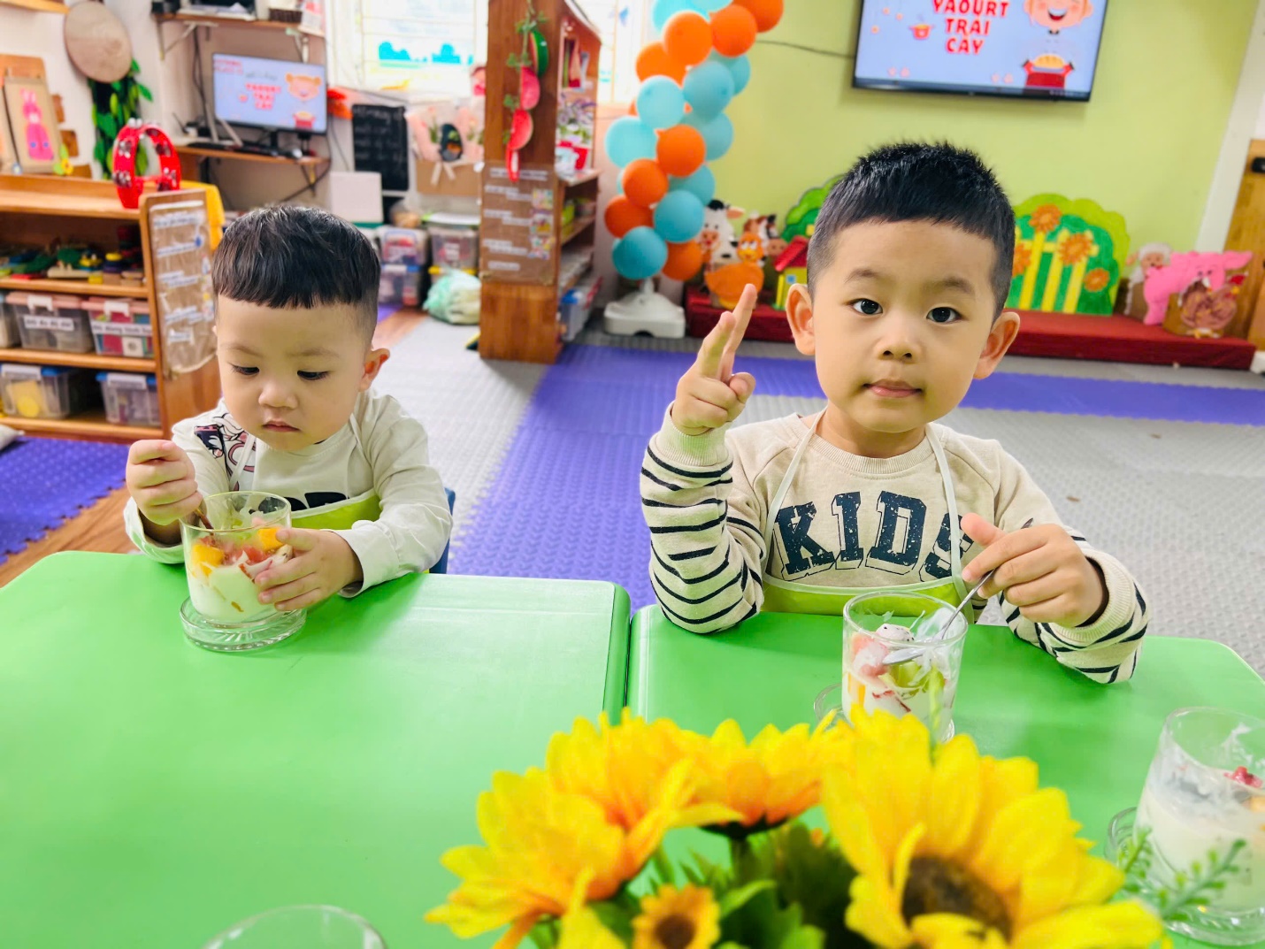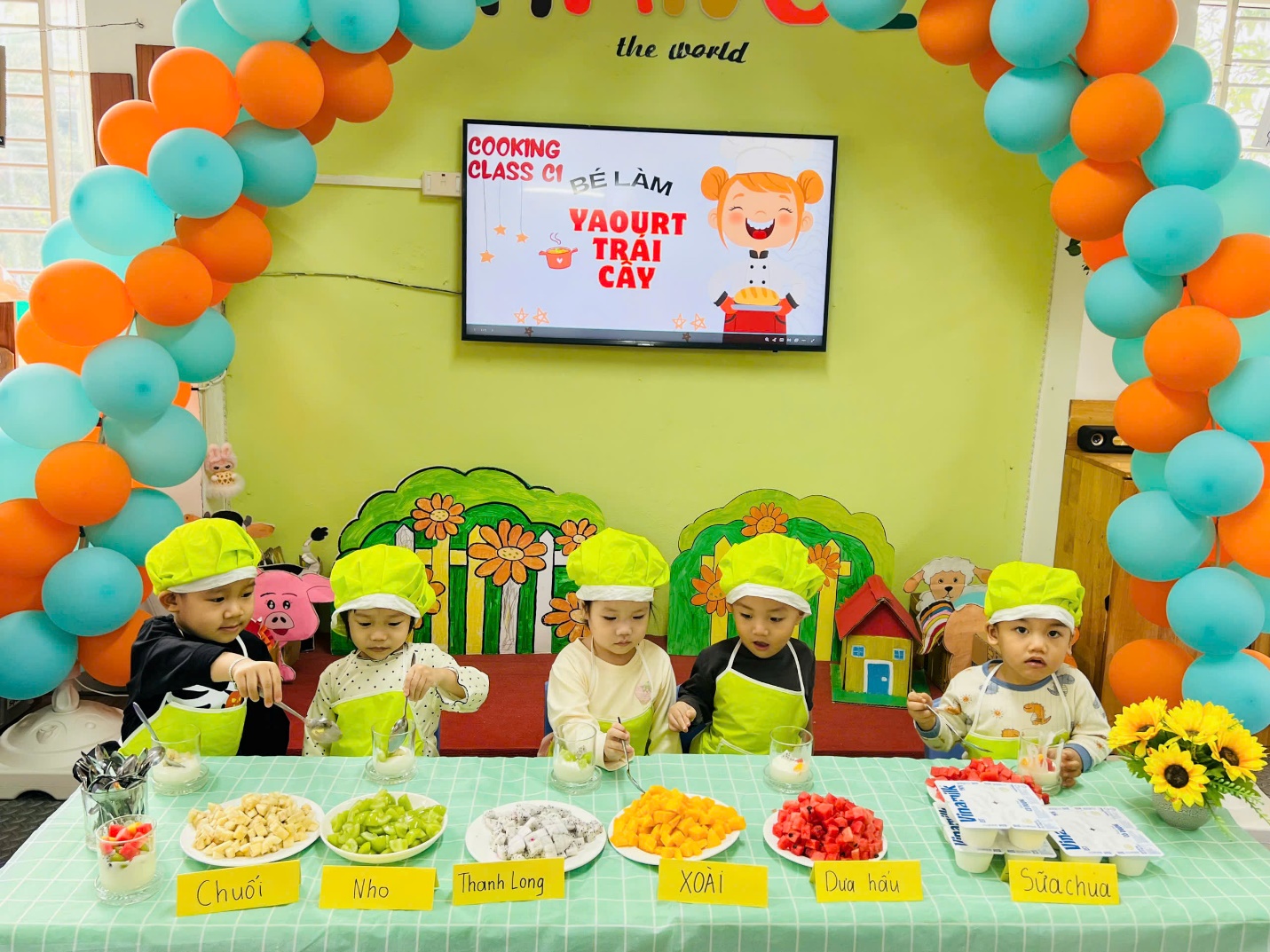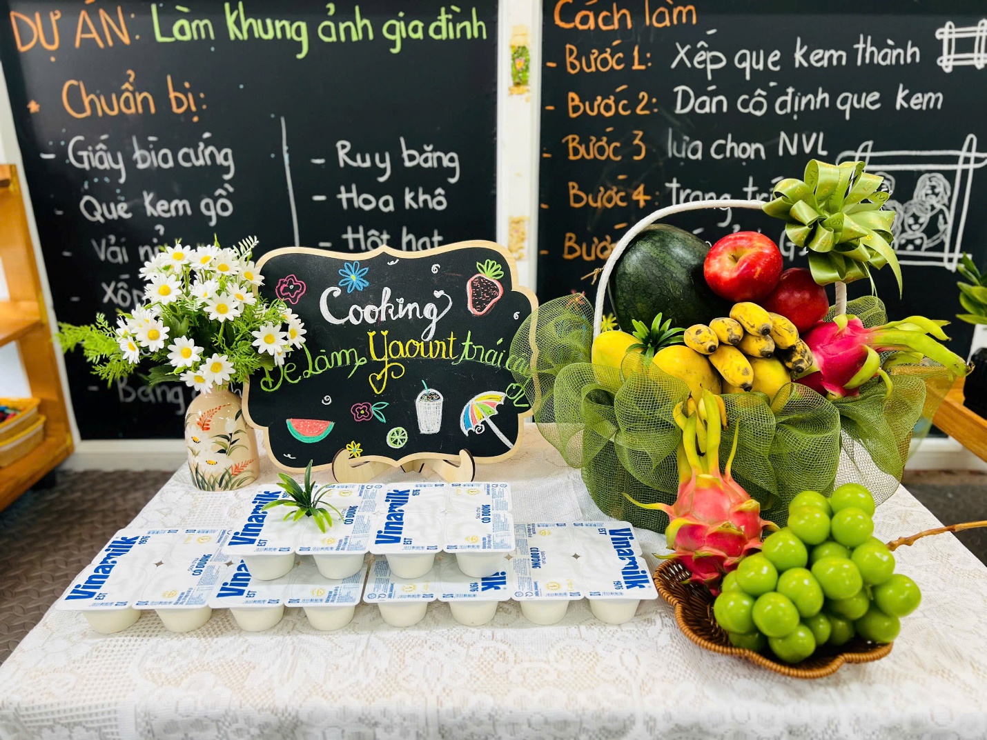 Thành phẩm không chỉ đẹp mắt mà còn mát lành và thơm ngon. Các con cùng nhau thưởng thức món yaourt do chính tay mình làm, ai nấy đều tươi cười thích thú, vừa ăn vừa xuýt xoa: “Ngon quá cô ơi!”. Qua hoạt động này, các bé học được cách giữ vệ sinh khi chế biến thực phẩm, biết phối hợp cùng bạn bè và cảm nhận niềm vui từ lao động sáng tạo.