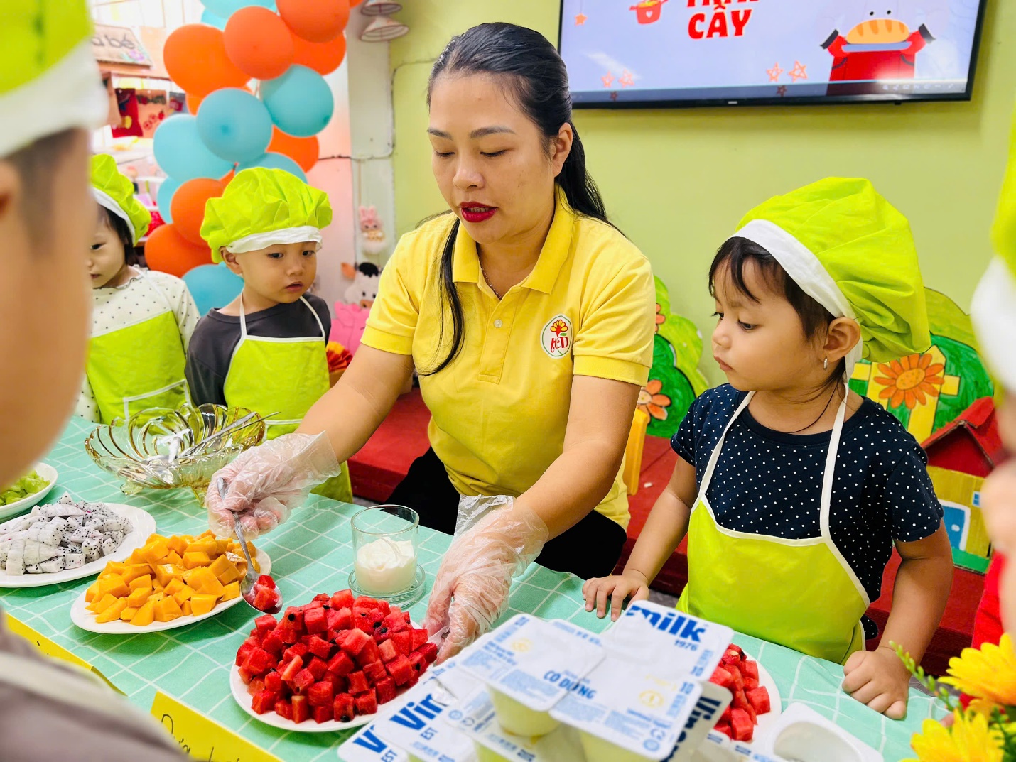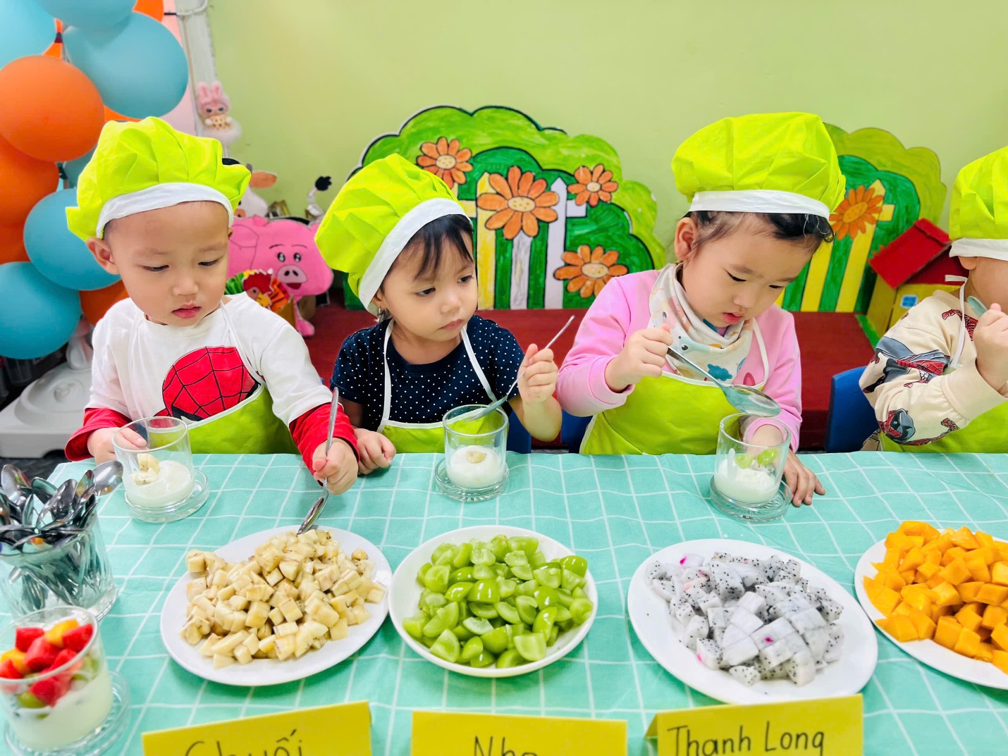 Sau phần làm quen, cô giáo hướng dẫn các bé cách mix sữa chua với trái cây đã được cắt hạt lựu nhỏ xinh để các bé dễ trộn và dễ thưởng thức. Bé nào cũng háo hức khi cô hướng dẫn, các “đầu bếp nhí” bắt tay vào thực hành chế biến khéo léo trang trí ly sữa chua bằng những miếng hoa quả đầy màu sắc. Cả lớp ngập tràn tiếng cười và niềm vui khi những ly yaourt xinh xắn dần hiện ra dưới bàn tay nhỏ nhắn.