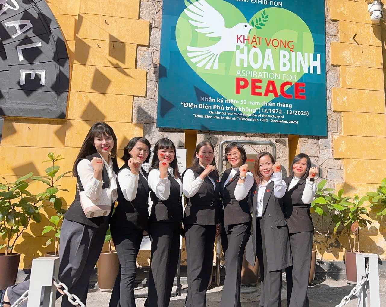 Giữa không gian ấy, các cô giáo Hoa Hướng Dương nắm tay nhau tạo thành vòng tròn biểu tượng cho sự đoàn kết – tiếp nối tinh thần kiên cường của thế hệ đi trước. Ánh mắt xúc động, nụ cười tự hào, những nhịp tim như lặng lại khi cùng nhau cảm nhận giá trị của hòa bình hôm nay.