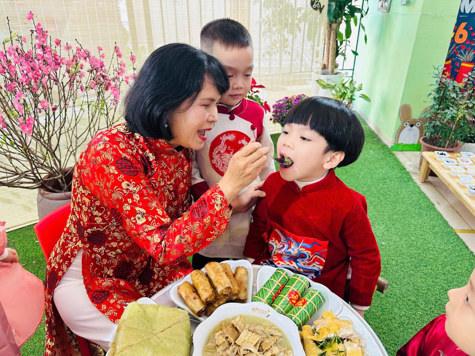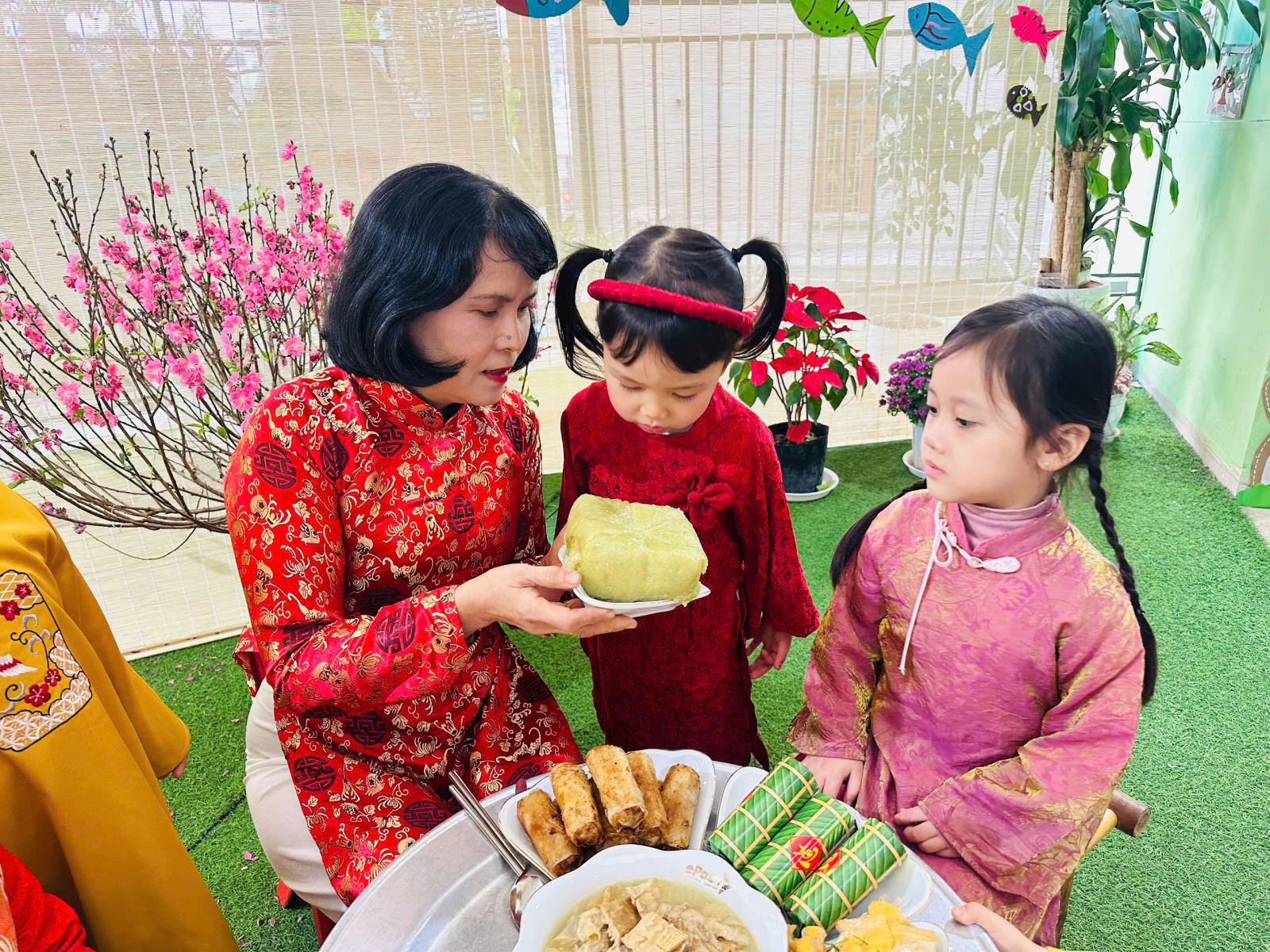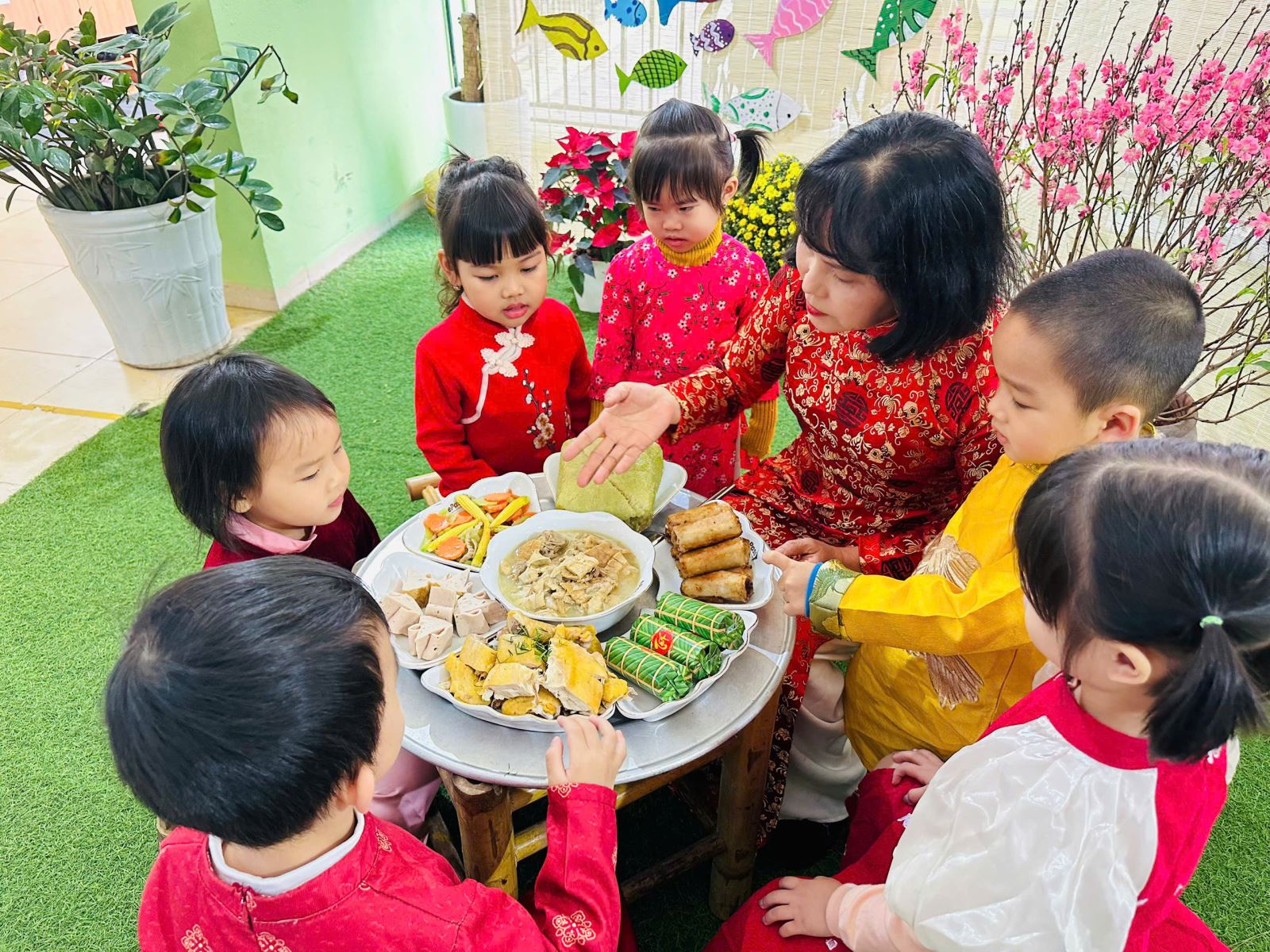 Trong dự án, các bé được Khám phá mâm cỗ cổ truyền ngày Tết thông qua quan sát, trò chuyện và tham gia sắp xếp một số món quen thuộc như bánh chưng, giò, nem,… Hoạt động giúp trẻ nhận biết đặc điểm một số món ăn ngày Tết, hiểu ý nghĩa sum vầy, đoàn viên và bước đầu hình thành tình yêu đối với truyền thống gia đình Việt.