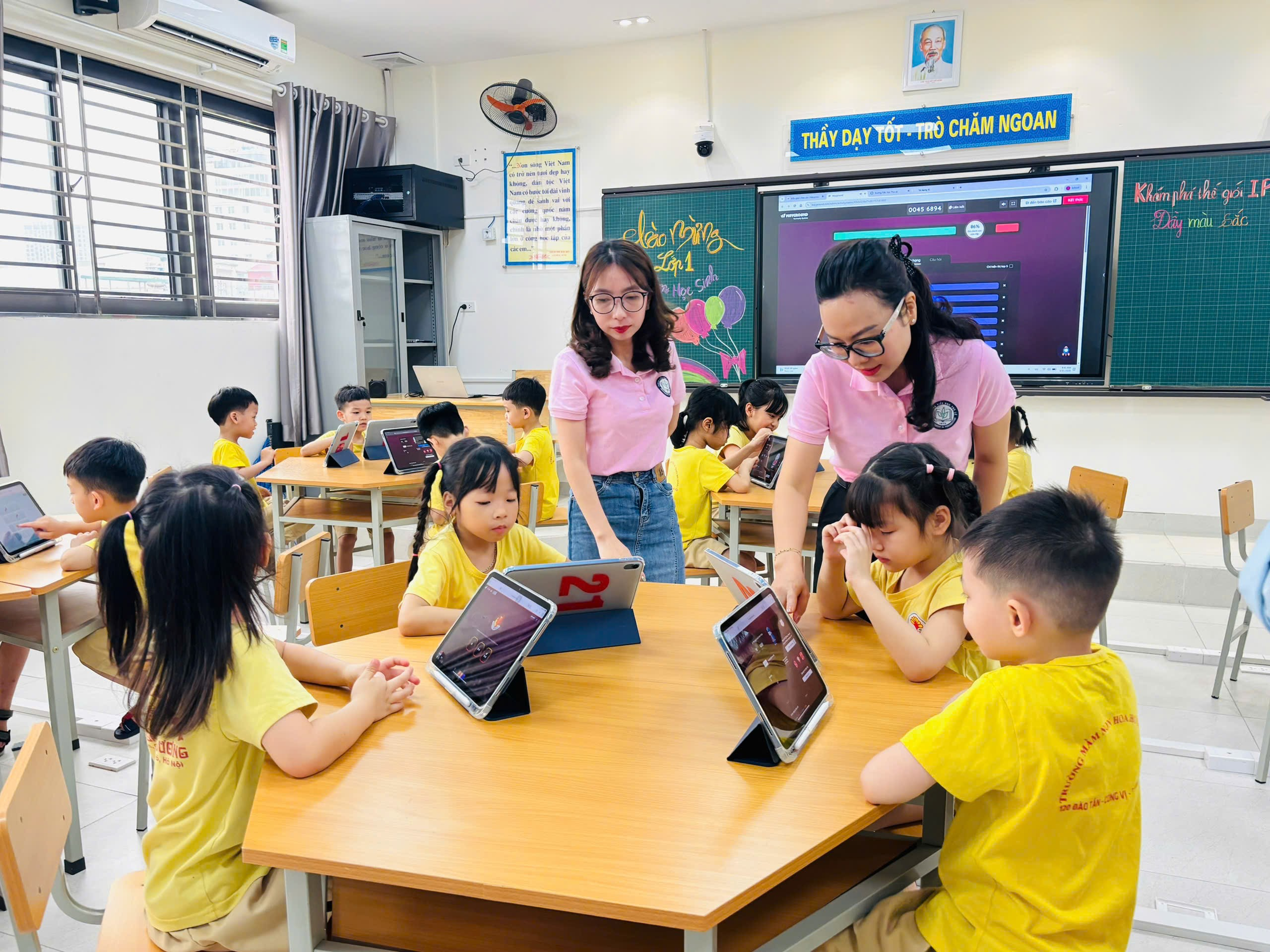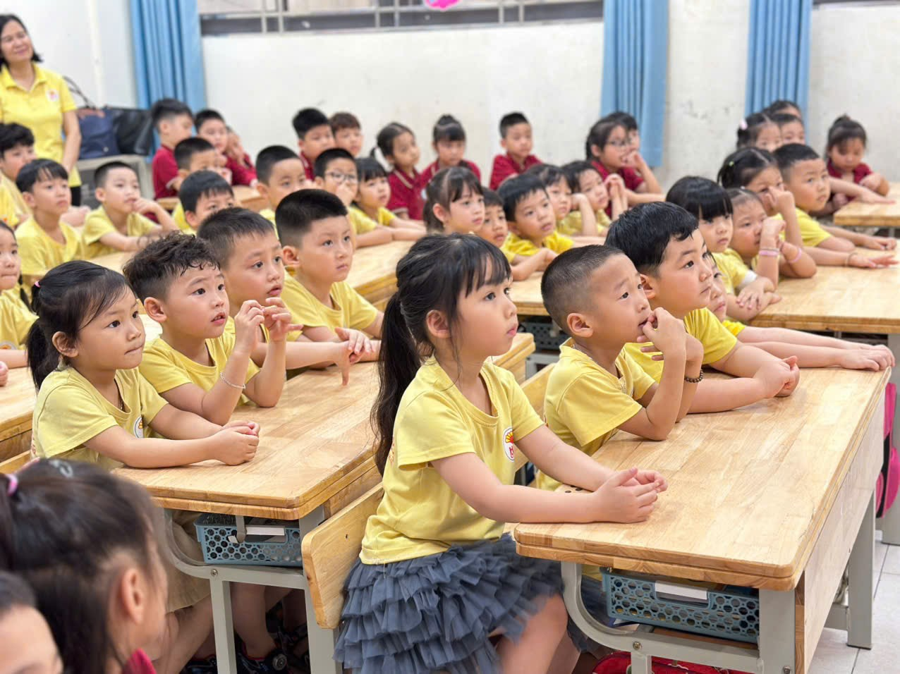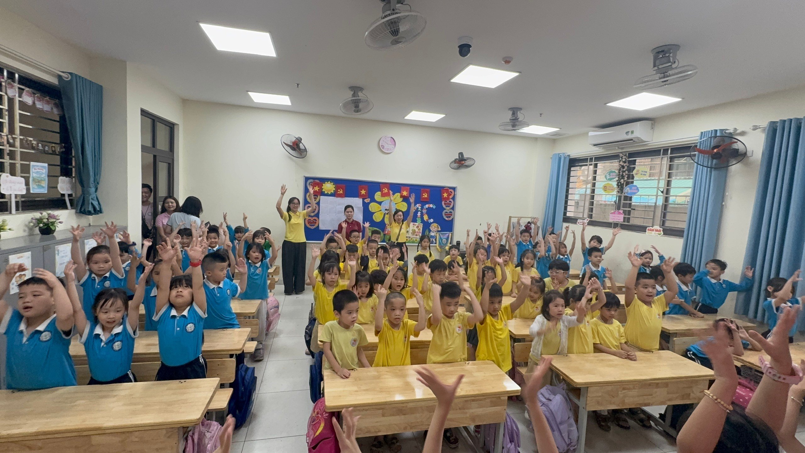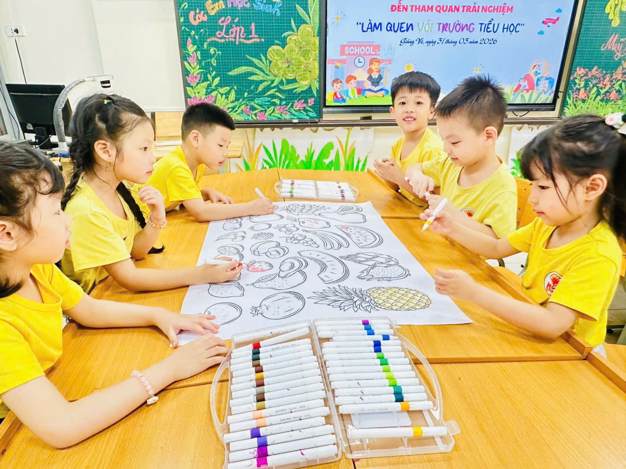 Trong hành trình trải nghiệm, các con đã được tham quan các lớp học 1A, 1B, 1C, trực tiếp quan sát môi trường học tập thực tế, làm quen với không gian lớp học mới khang trang, nề nếp và đầy thú vị, qua đó giúp các con thêm háo hức, tự tin và sẵn sàng cho bước chuyển mình lên bậc Tiểu học.