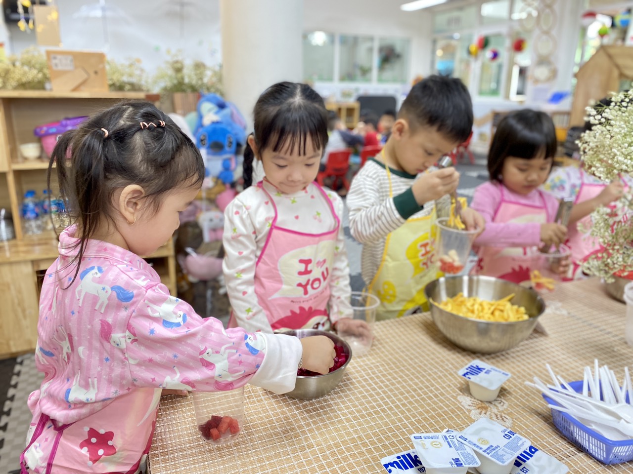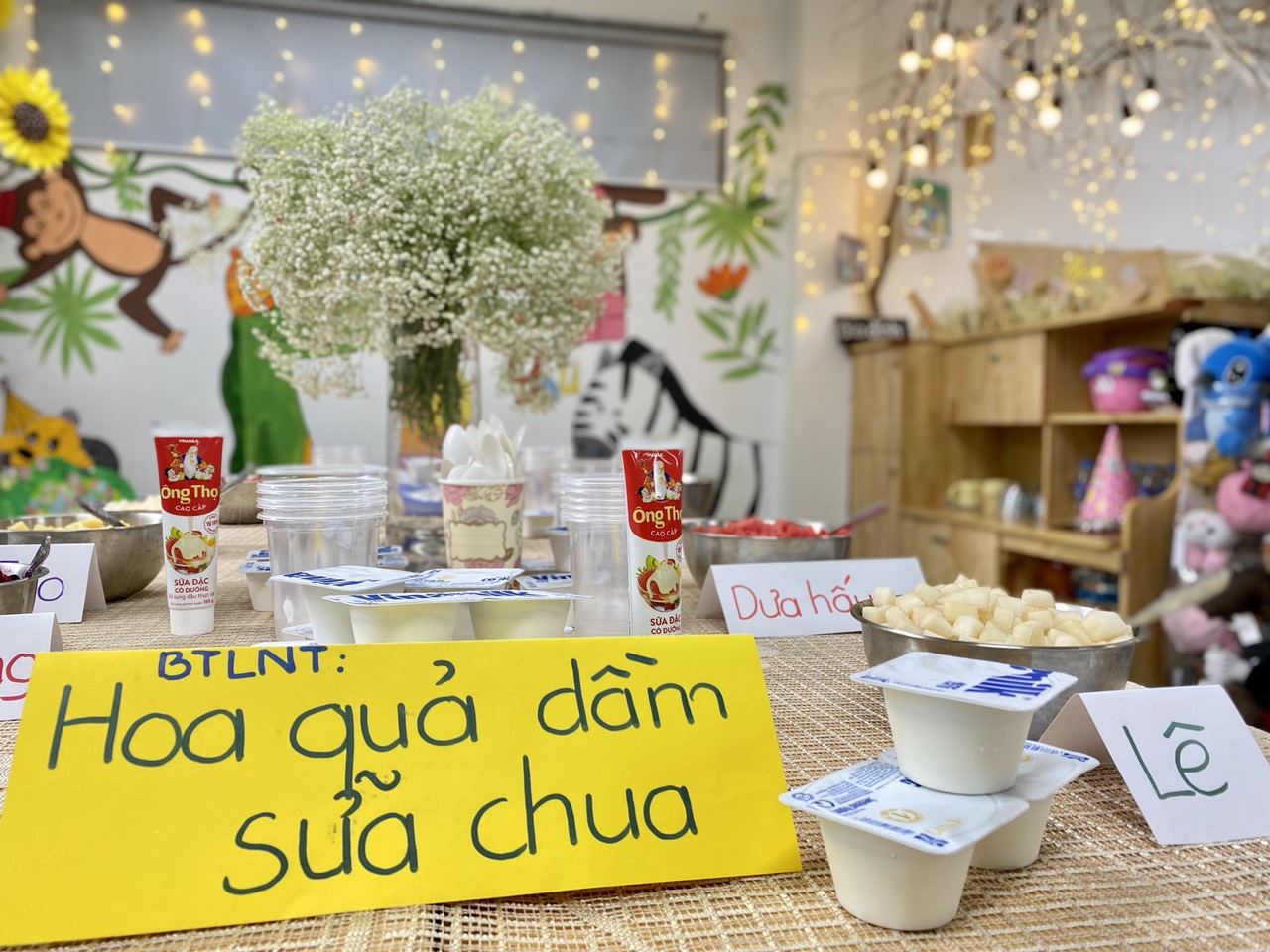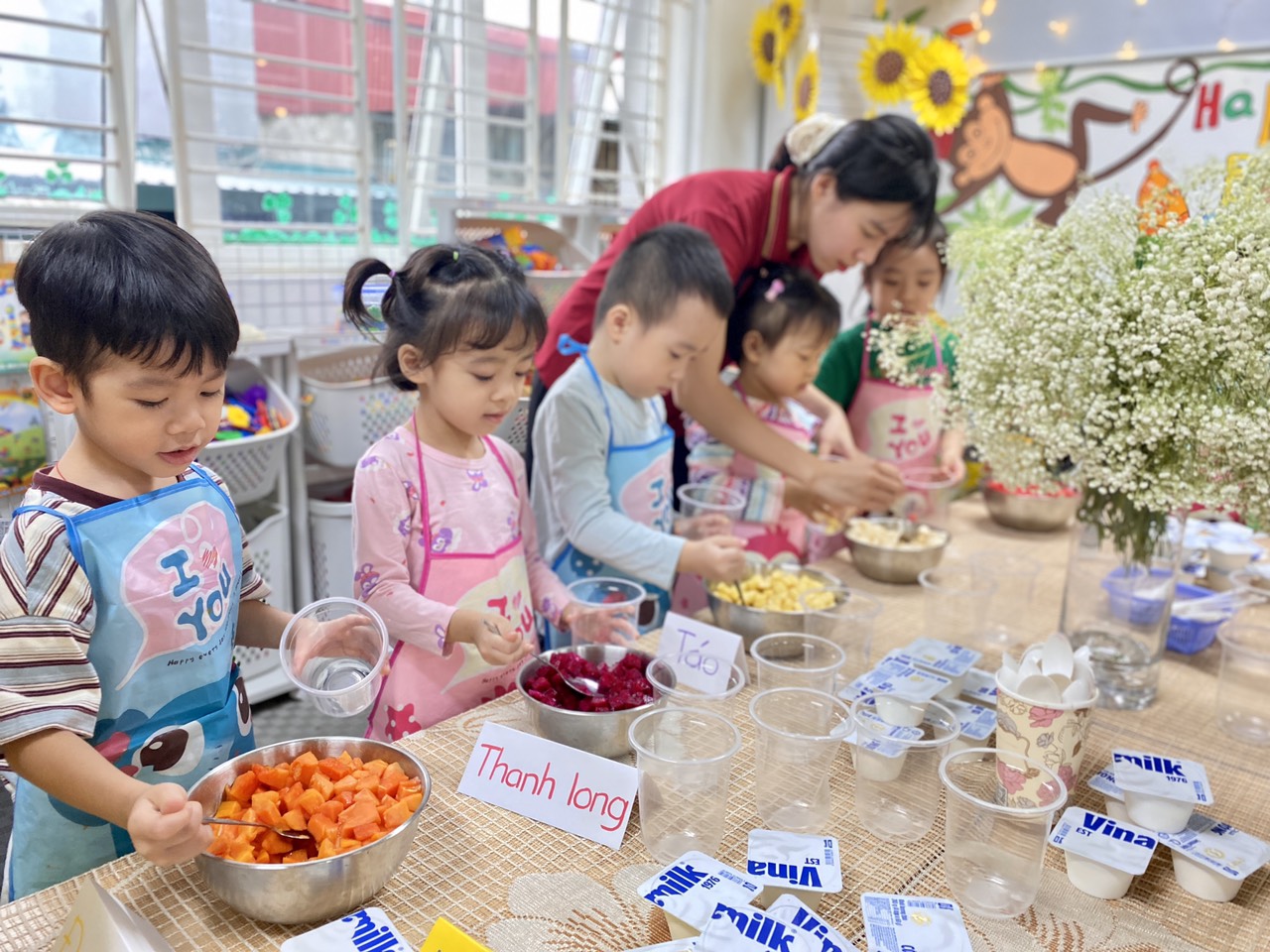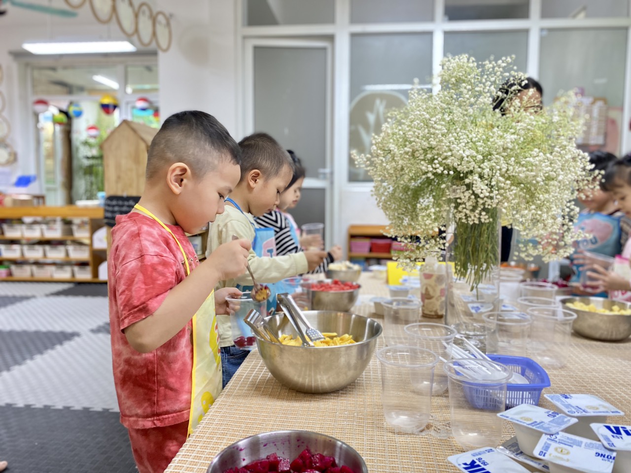 Dưới sự hướng dẫn tận tình của cô, các bé được làm quen với màu sắc, hình dáng, mùi vị của từng loại quả, rồi hào hứng bắt tay vào công việc: bé cắt chuối, bé xúc sữa chua, bé khéo léo trang trí ly hoa quả theo ý thích của mình. Tiếng cười, tiếng gọi nhau í ới vang khắp lớp, tạo nên một bức tranh thật sinh động và đáng yêu