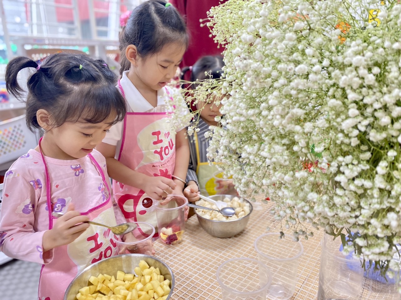 Từng đôi tay bé nhỏ khéo léo cắt nhỏ, trộn đều cùng sữa chua mát lạnh. Những ly hoa quả dầm xinh xắn ra đời, đầy sắc màu và hương vị – là “tác phẩm” tự tay bé làm ra 🥄✨
