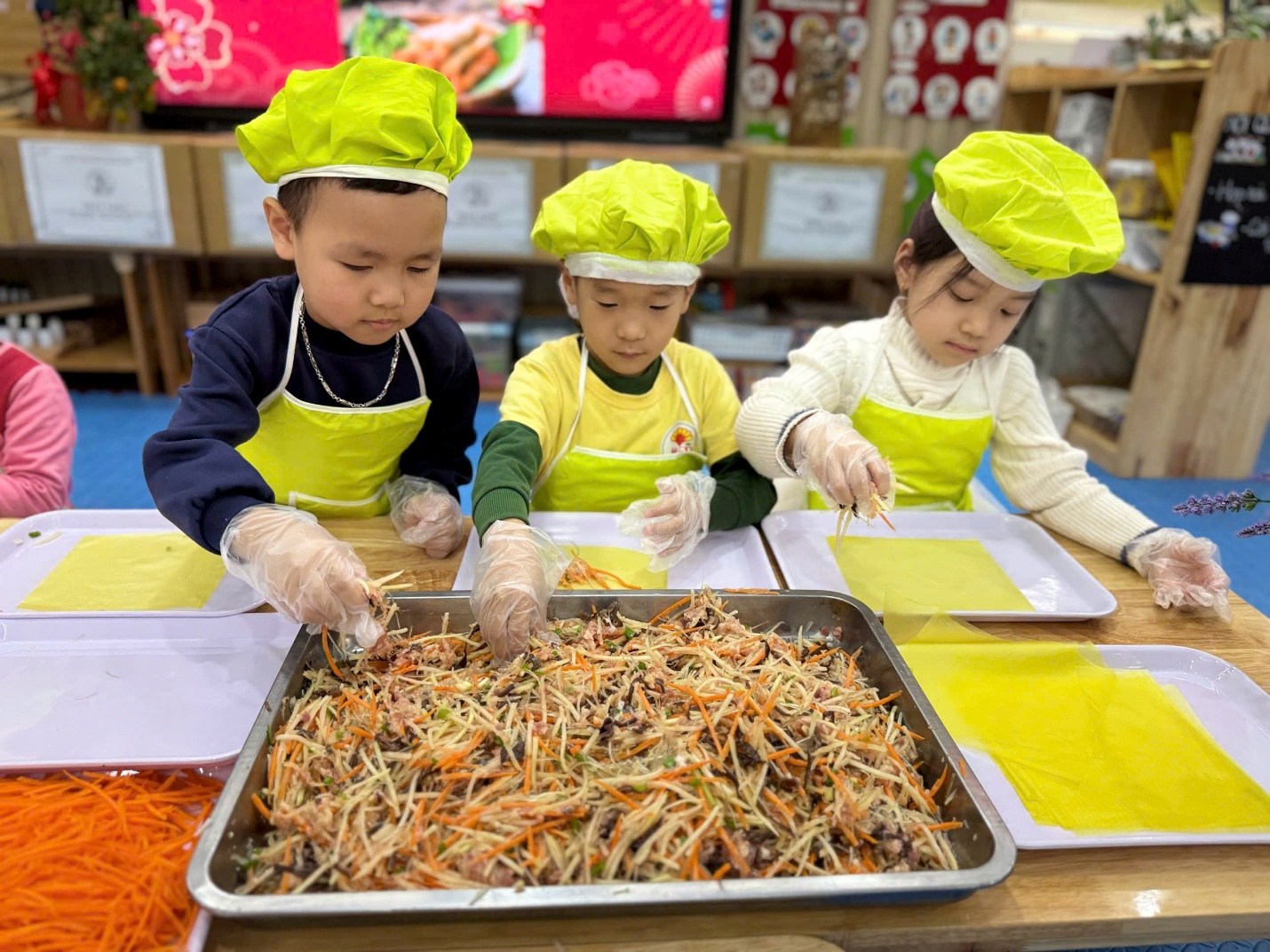 Từ sớm, lớp A2 đã rộn ràng với những nguyên liệu quen thuộc: bánh đa nem, rau củ, thịt, miến… Dưới sự hướng dẫn của cô giáo, các bé được làm quen với từng loại nguyên liệu, hiểu vì sao món nem rán lại là hương vị thân thương trong mâm cơm ngày Tết của nhiều gia đình Việt.