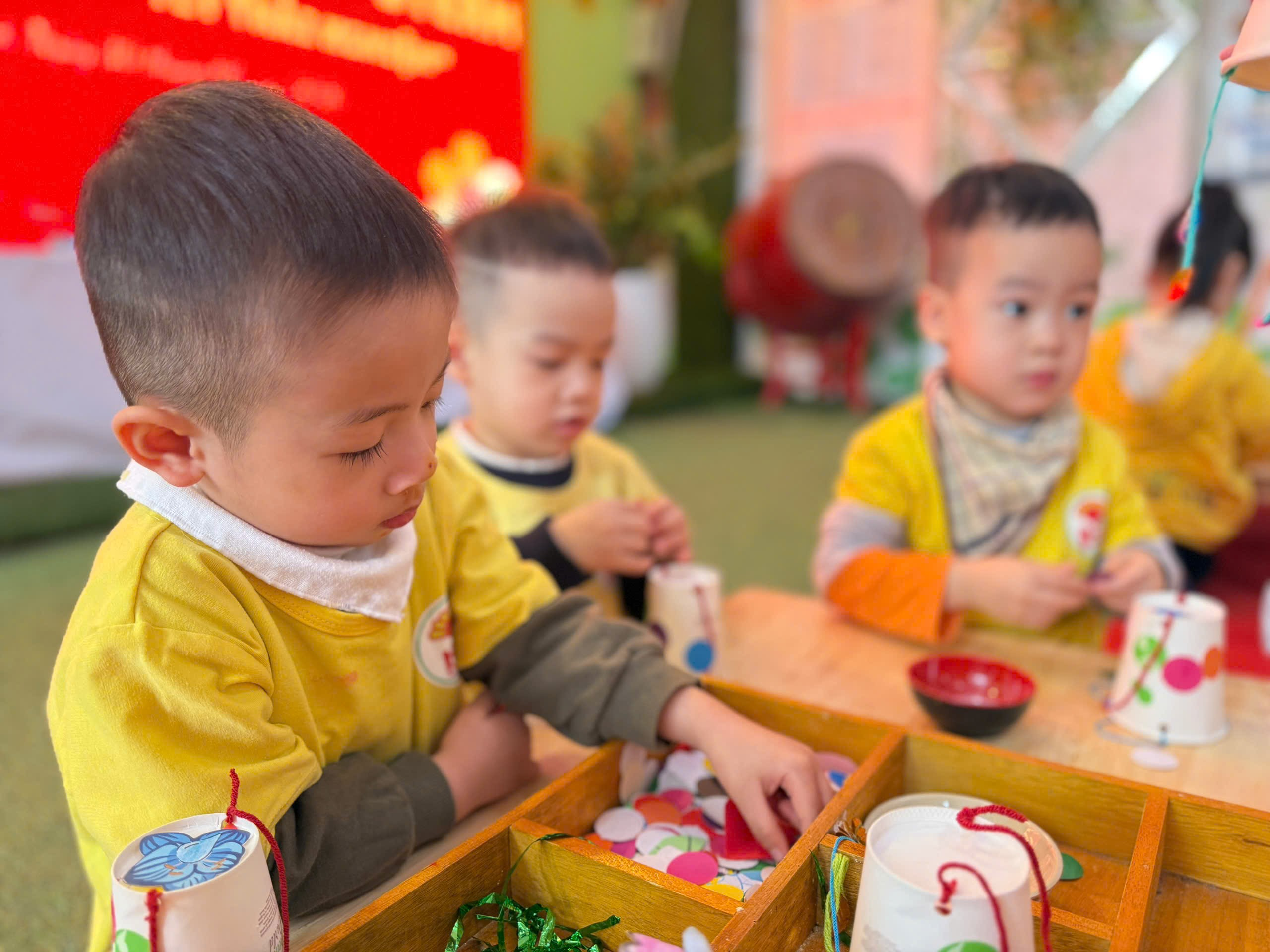 Đôi bàn tay nhỏ xíu tỉ mỉ chọn từng bông hoa, kiên nhẫn học cách xâu dây qua những lỗ nhỏ li ti. Hoạt động này không chỉ giúp bé rèn luyện tính kiên nhẫn mà còn là bài học đầu đời về nguyên lý hình học không gian cơ bản. Chiếc lồng đèn hoàn thiện cũng là lúc niềm tự hào lấp lánh trong ánh mắt các bạn nhỏ.