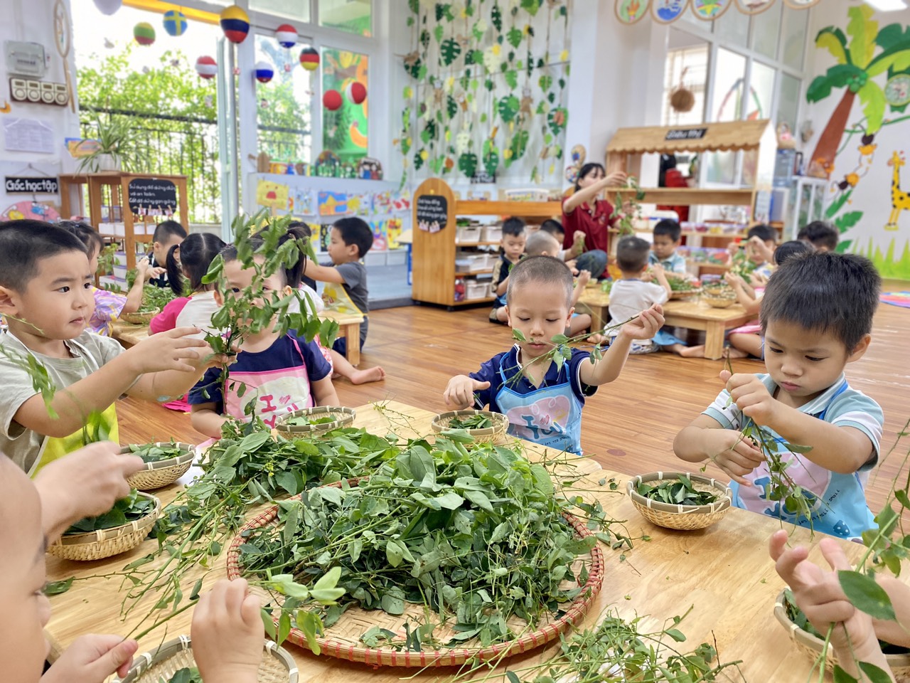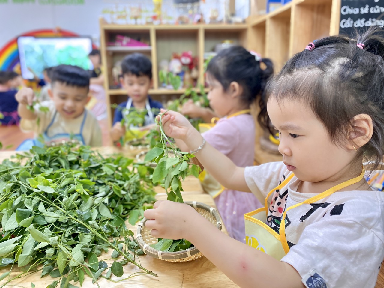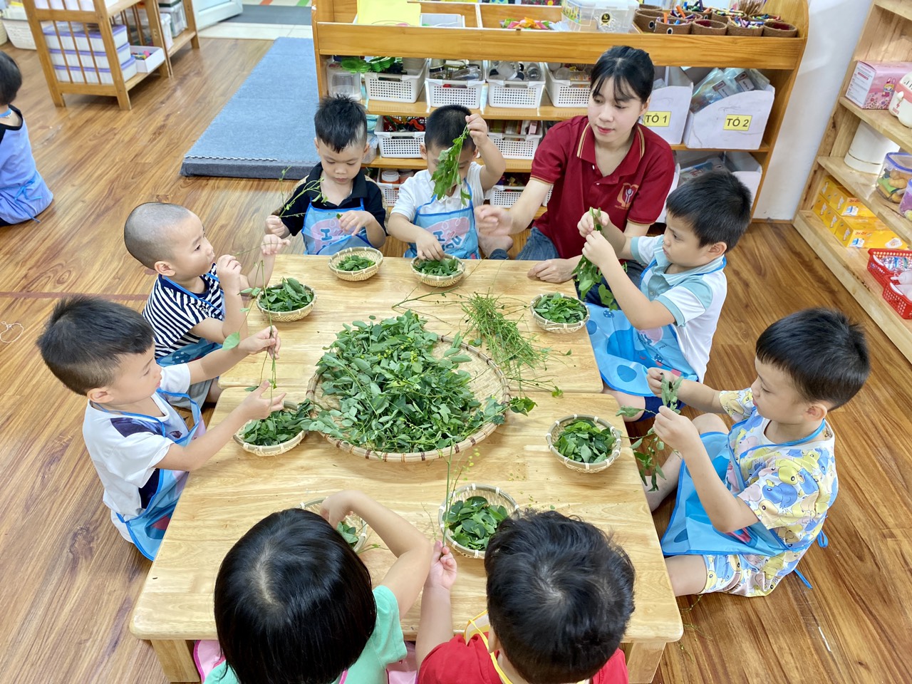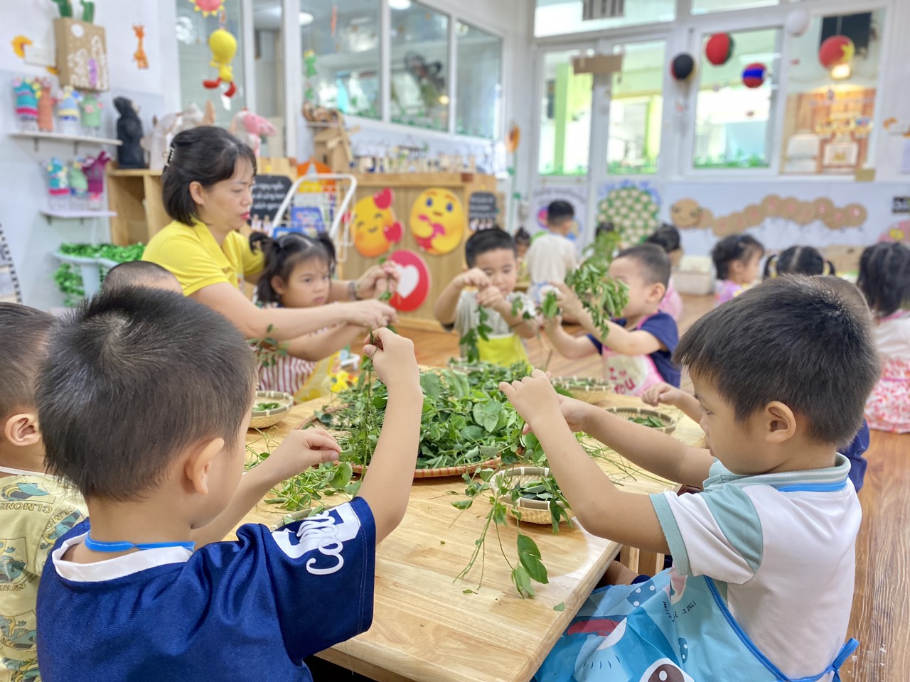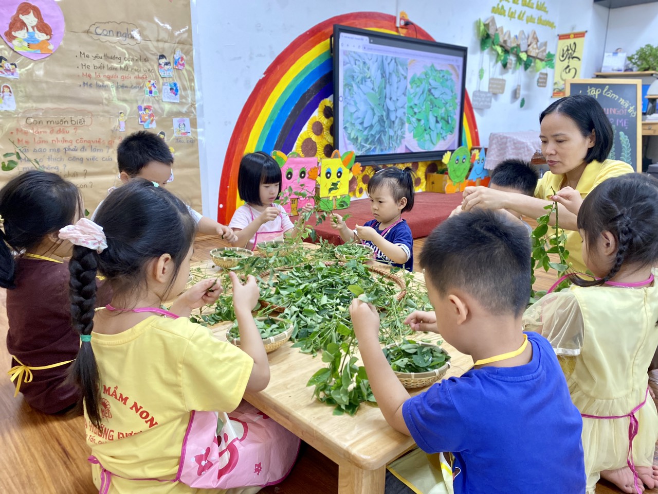 Có bạn vừa làm vừa cười khúc khích: “Rau này nấu canh ngọt lắm cô ơi!”, có bạn lại hào hứng khoe: “Con làm nhanh như mẹ rồi nè!”. Từng rổ rau ngót đầy dần lên – là thành quả từ đôi bàn tay nhỏ xíu nhưng khéo léo và cẩn thận của các bé.
