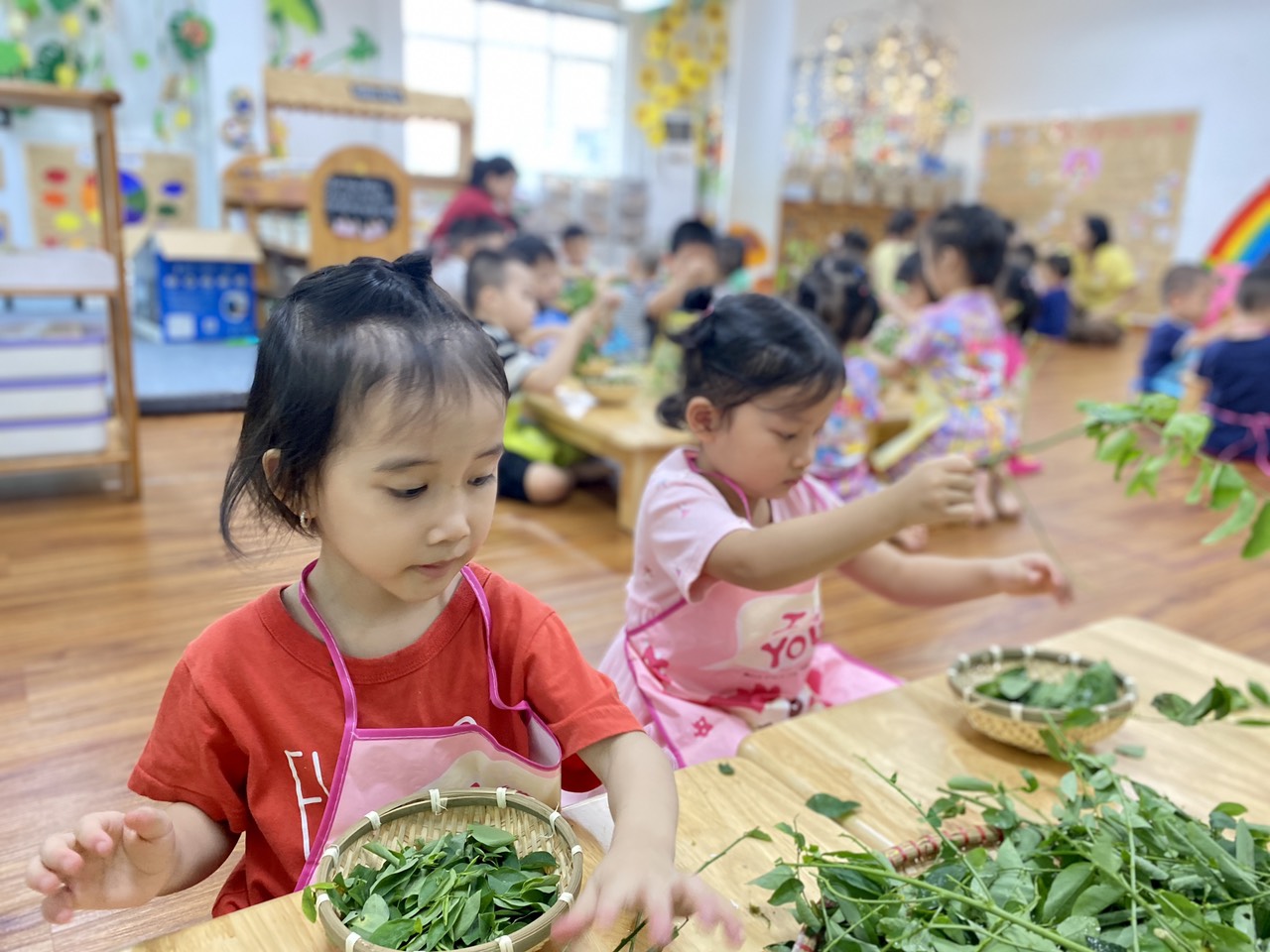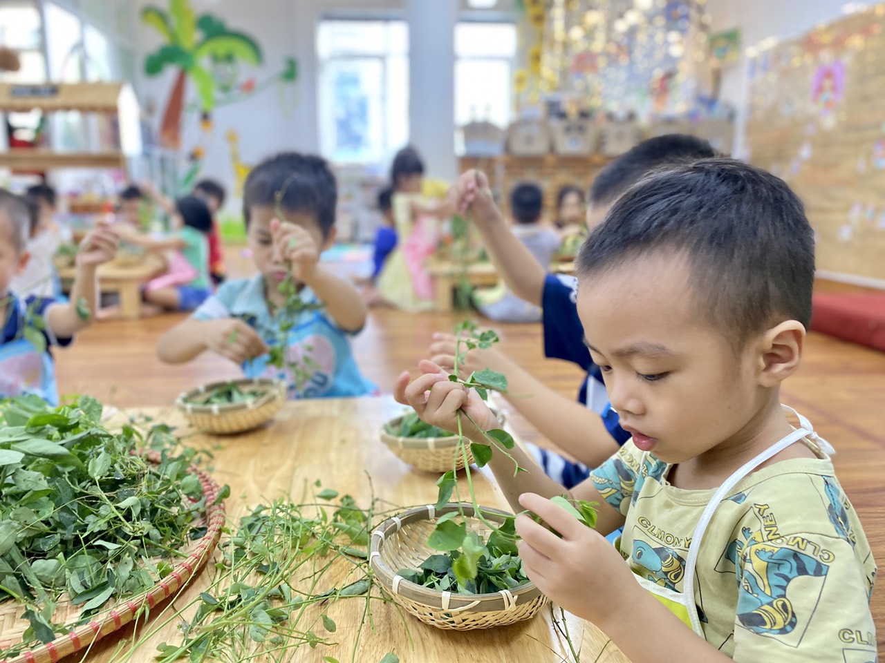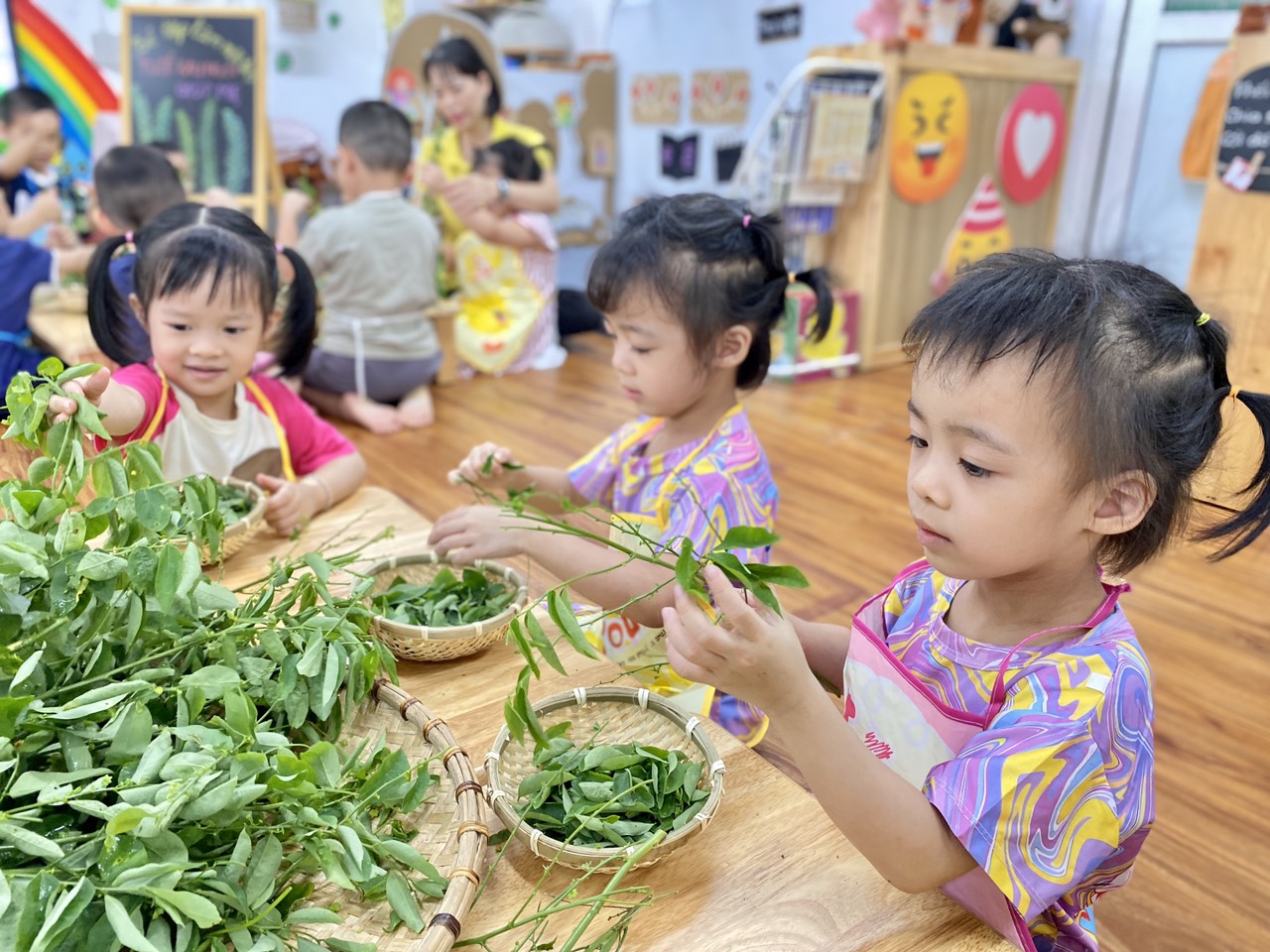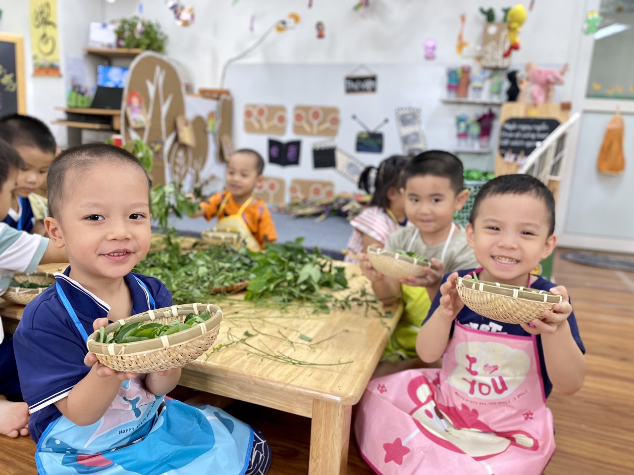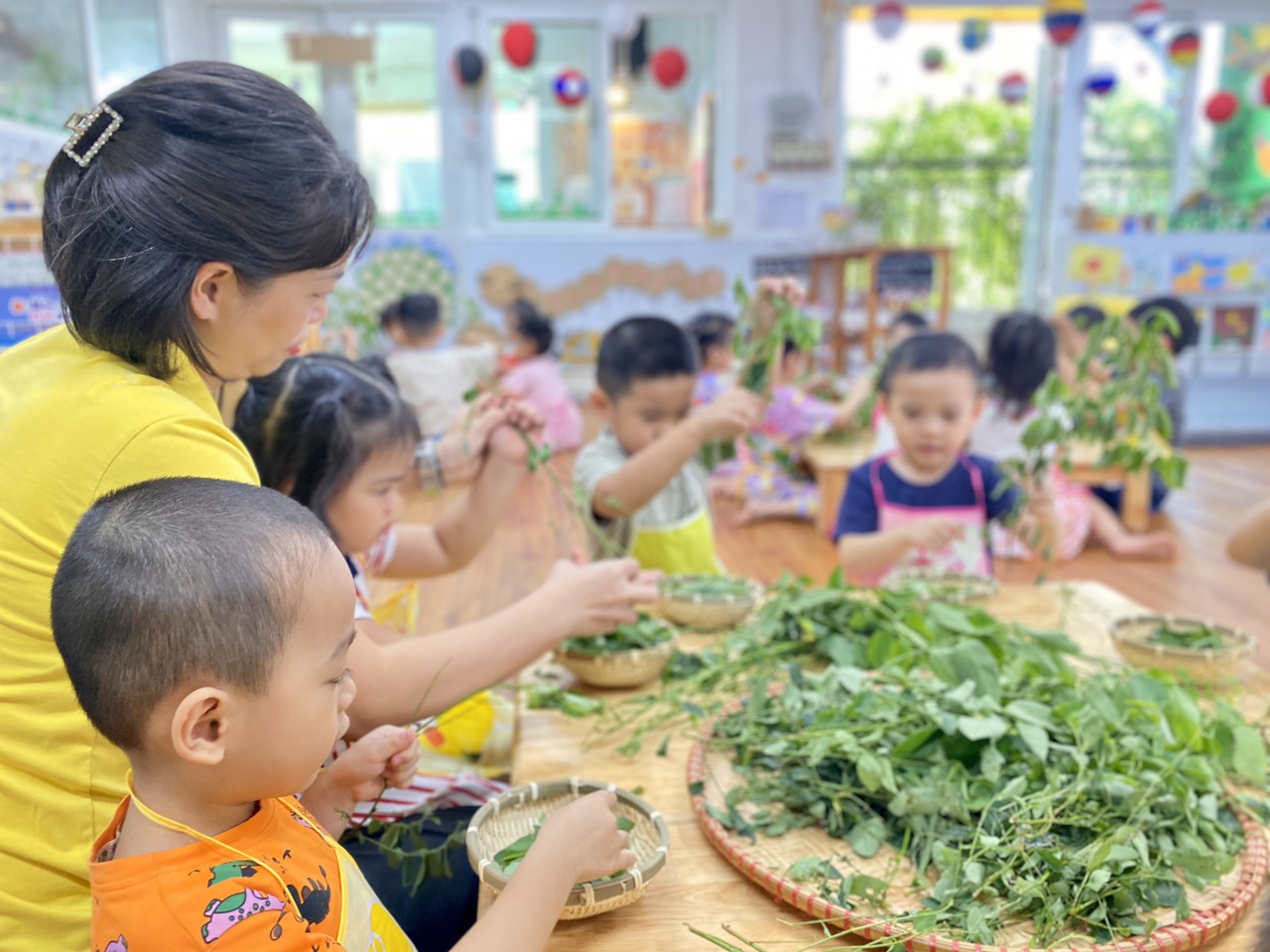 Có bạn vừa làm vừa cười khúc khích: “Rau này nấu canh ngọt lắm cô ơi!”, có bạn lại hào hứng khoe: “Con làm nhanh như mẹ rồi nè!”. Từng rổ rau ngót đầy dần lên – là thành quả từ đôi bàn tay nhỏ xíu nhưng khéo léo và cẩn thận của các bé.