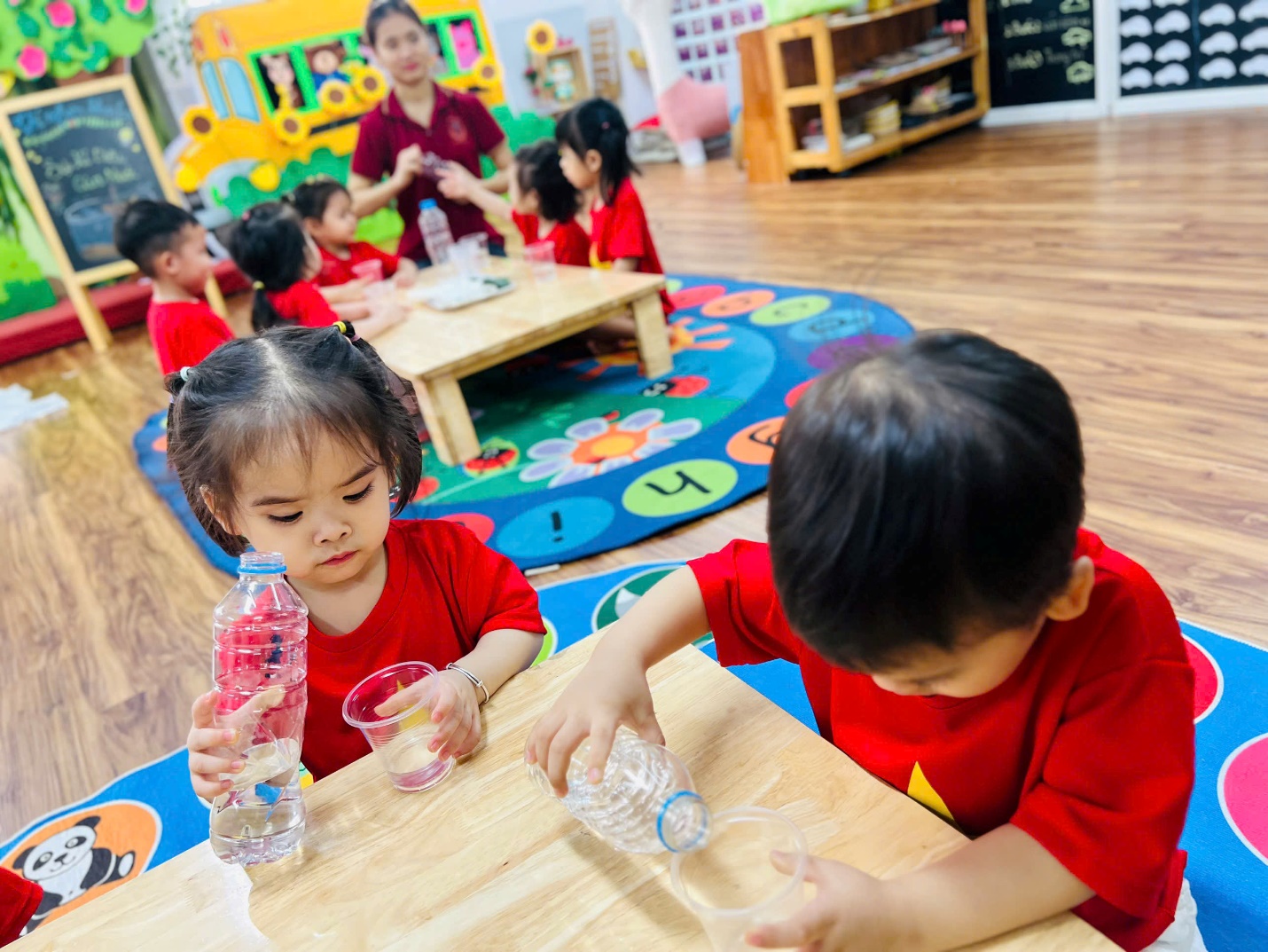 💧 Các bé được tự tay cầm, lắc và quan sát nước: “Ơ kìa cô ơi, nước chảy!” – những tiếng reo vui vang lên khi các con phát hiện ra nước có thể di chuyển từ đầu chai xuống đáy chai.