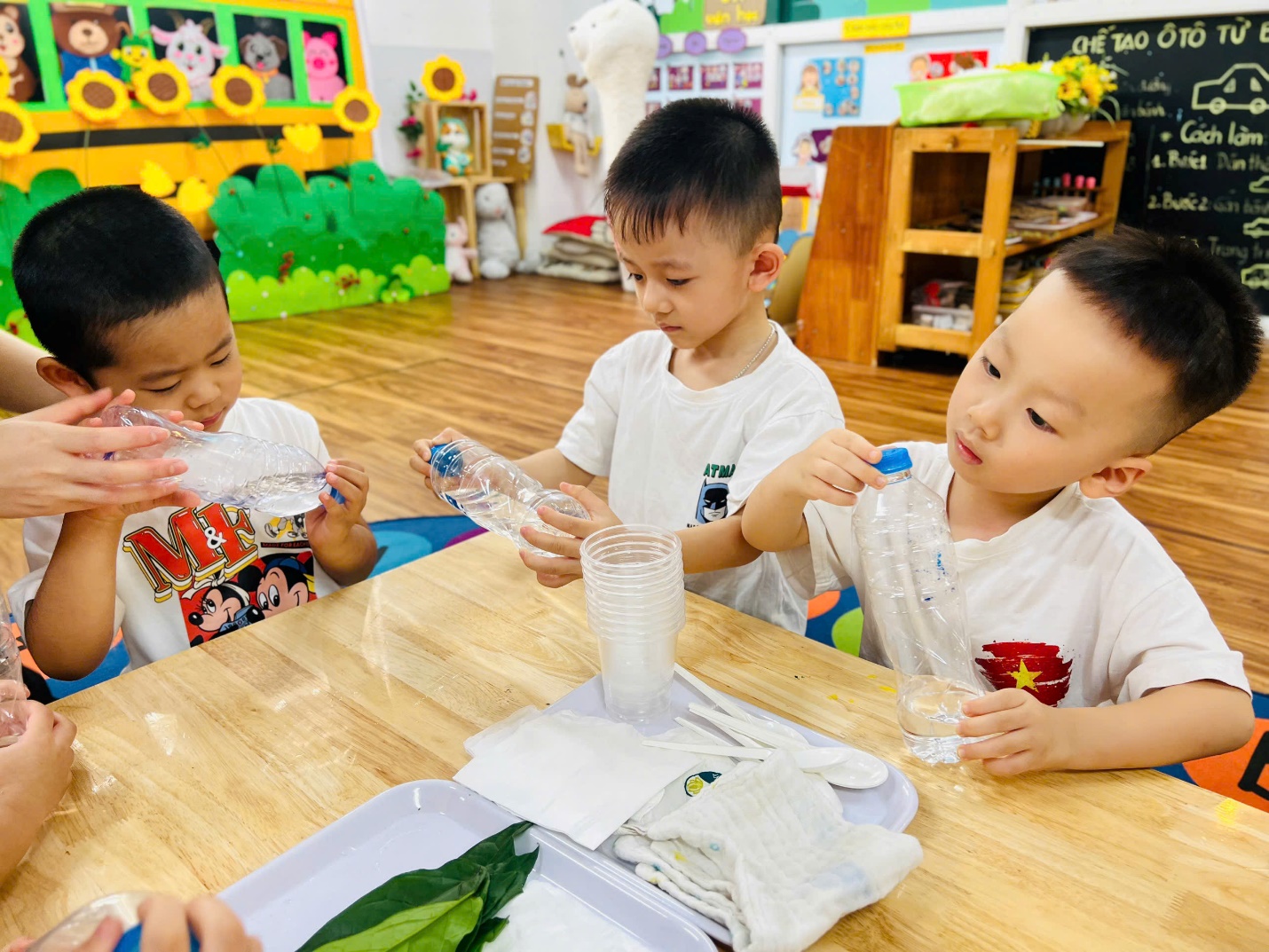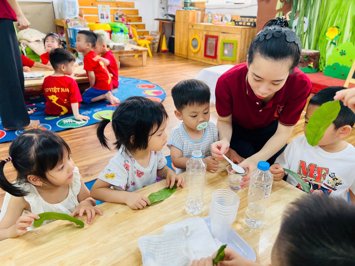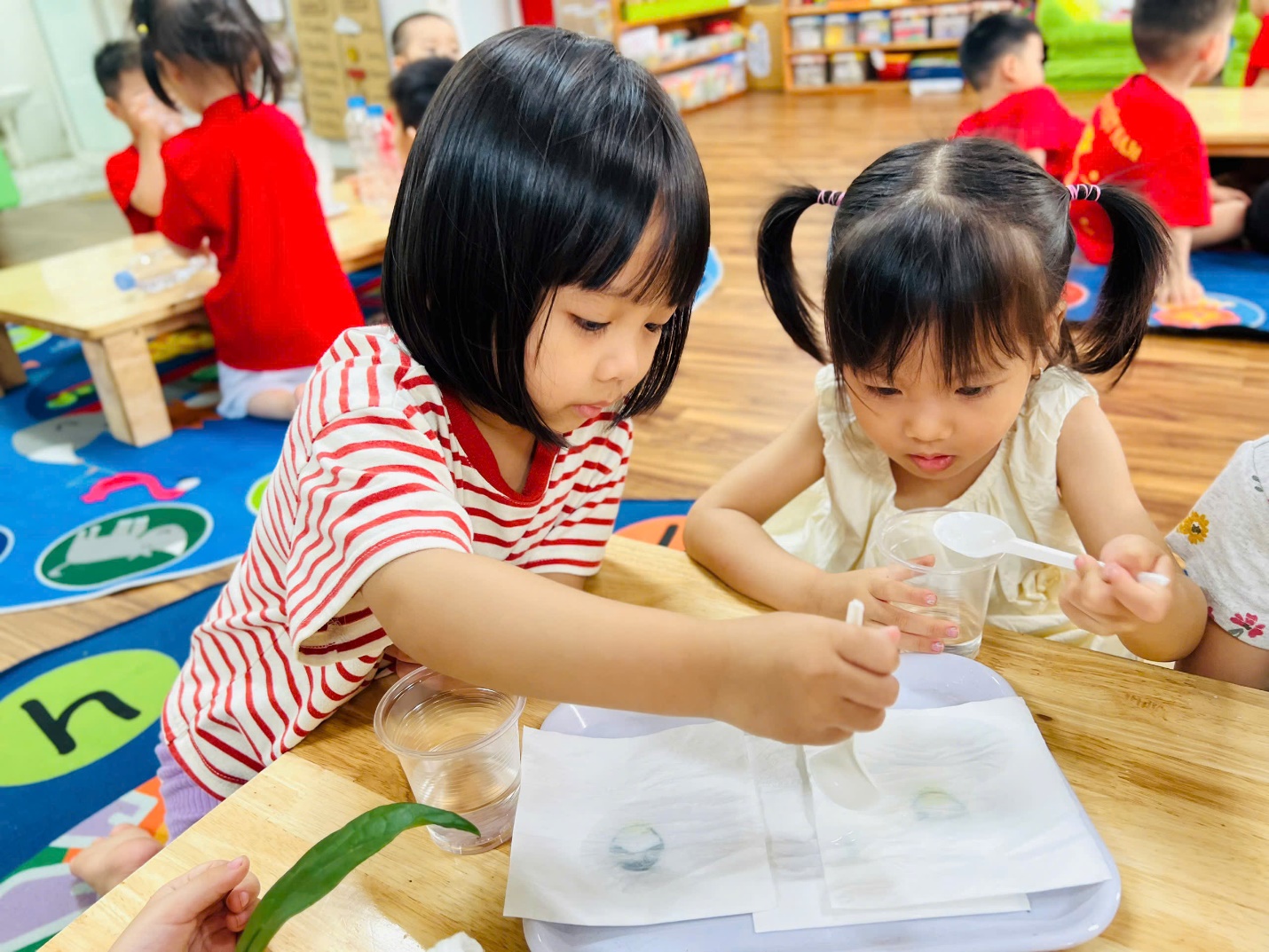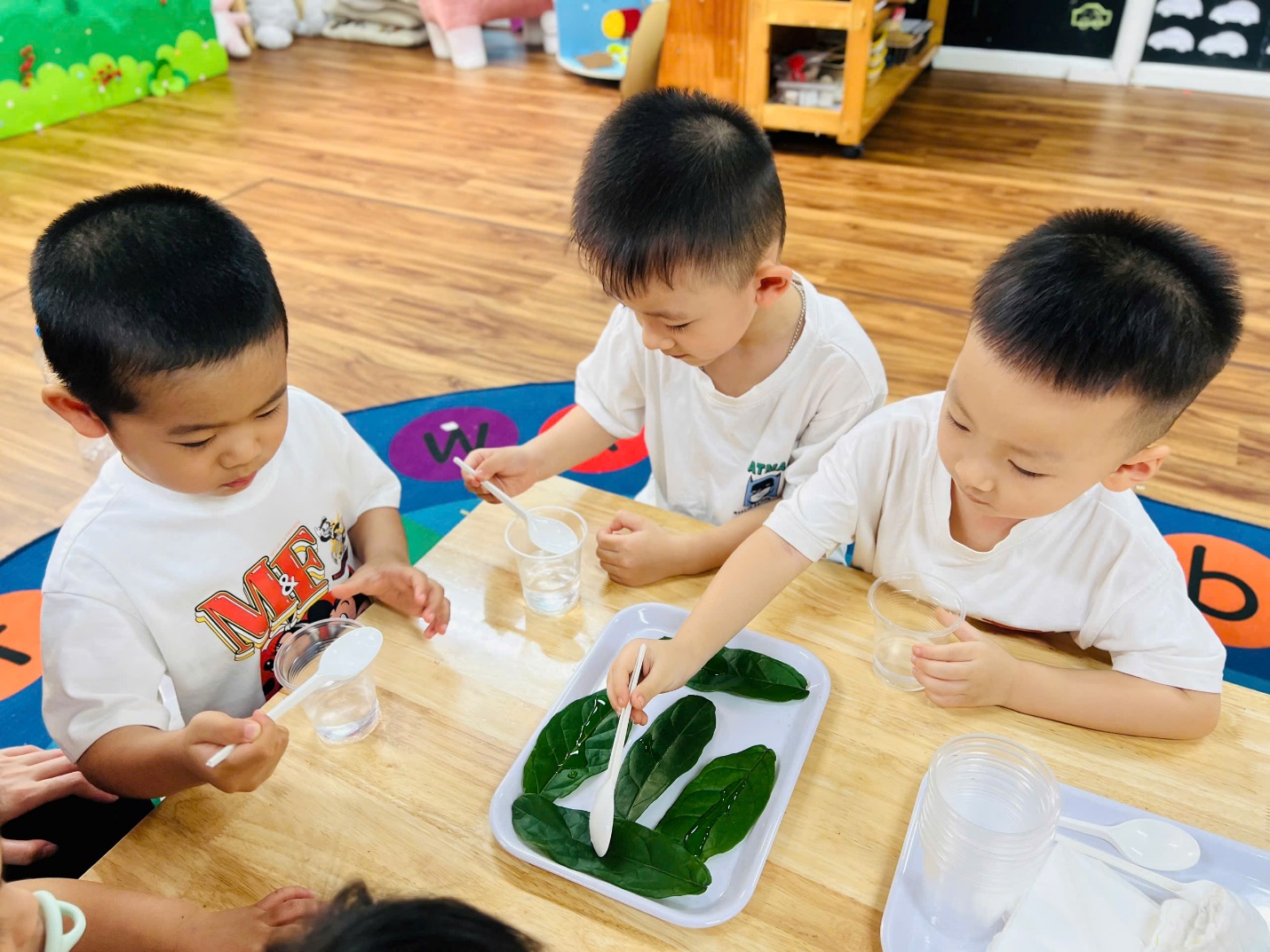 💧 Không dừng lại ở đó, các bạn nhỏ còn được trải nghiệm như những nhà khoa học nhí. Nhìn xem nước có màu gì, ngửi thử xem có mùi không, rót nước để xem nước có chảy không, và thử xem nước có “thích” thấm vào khăn, giấy hay lá cây không?