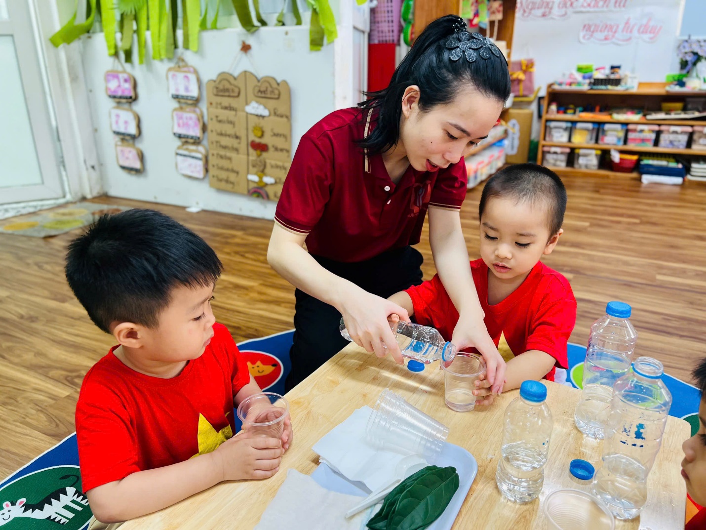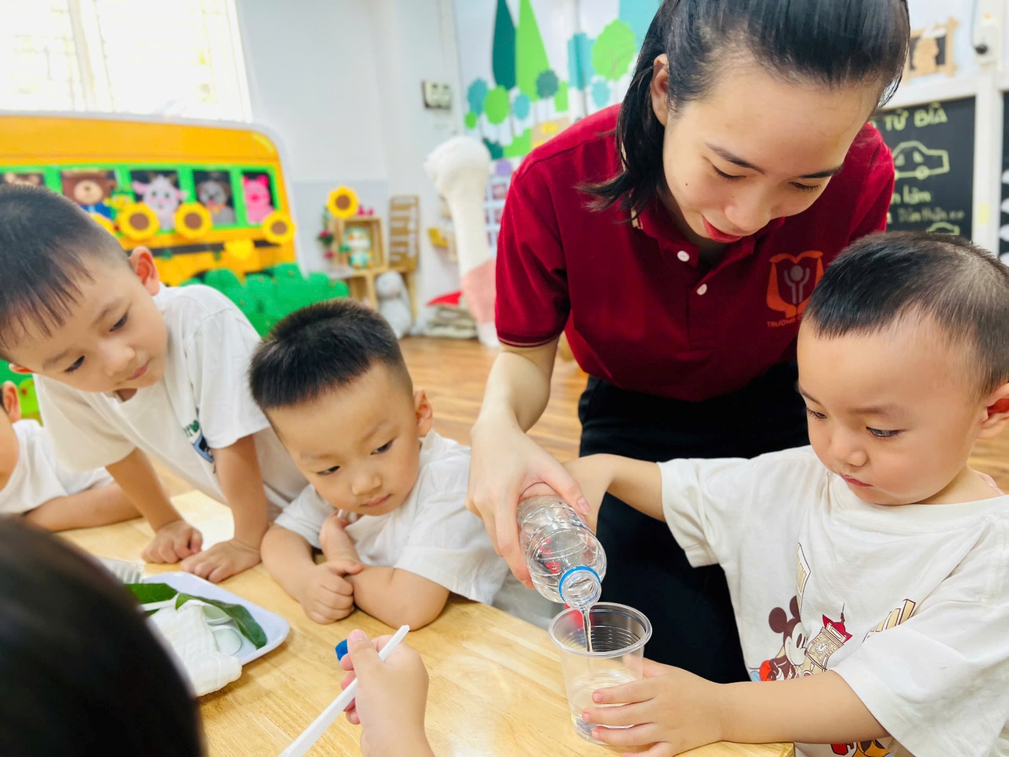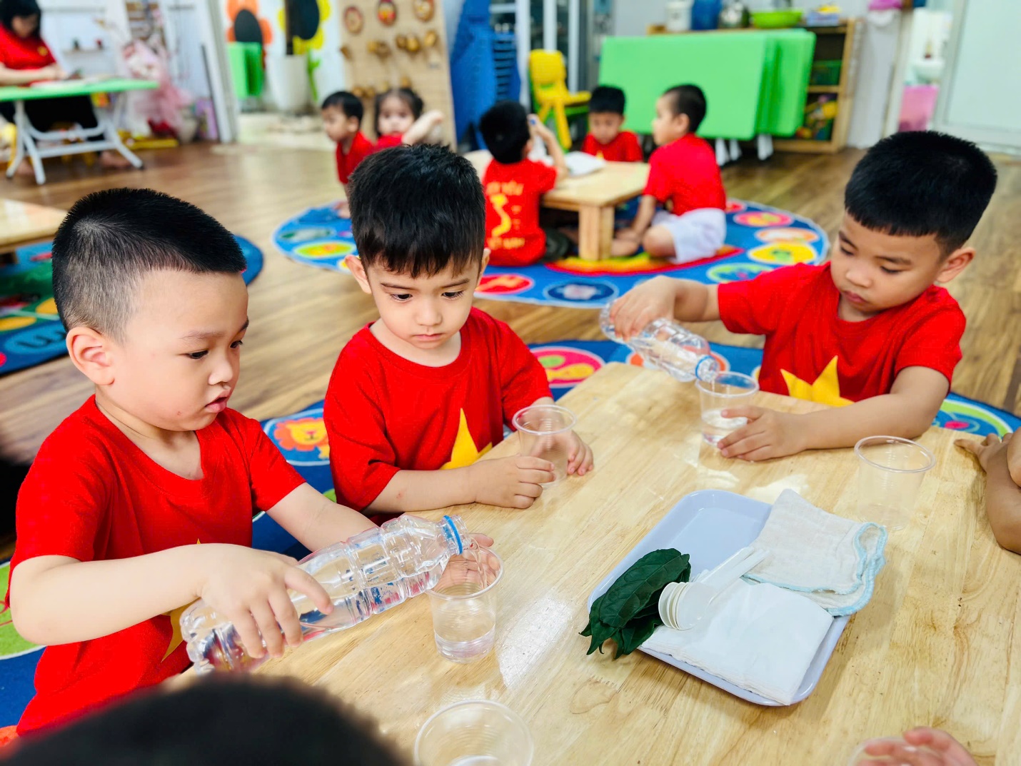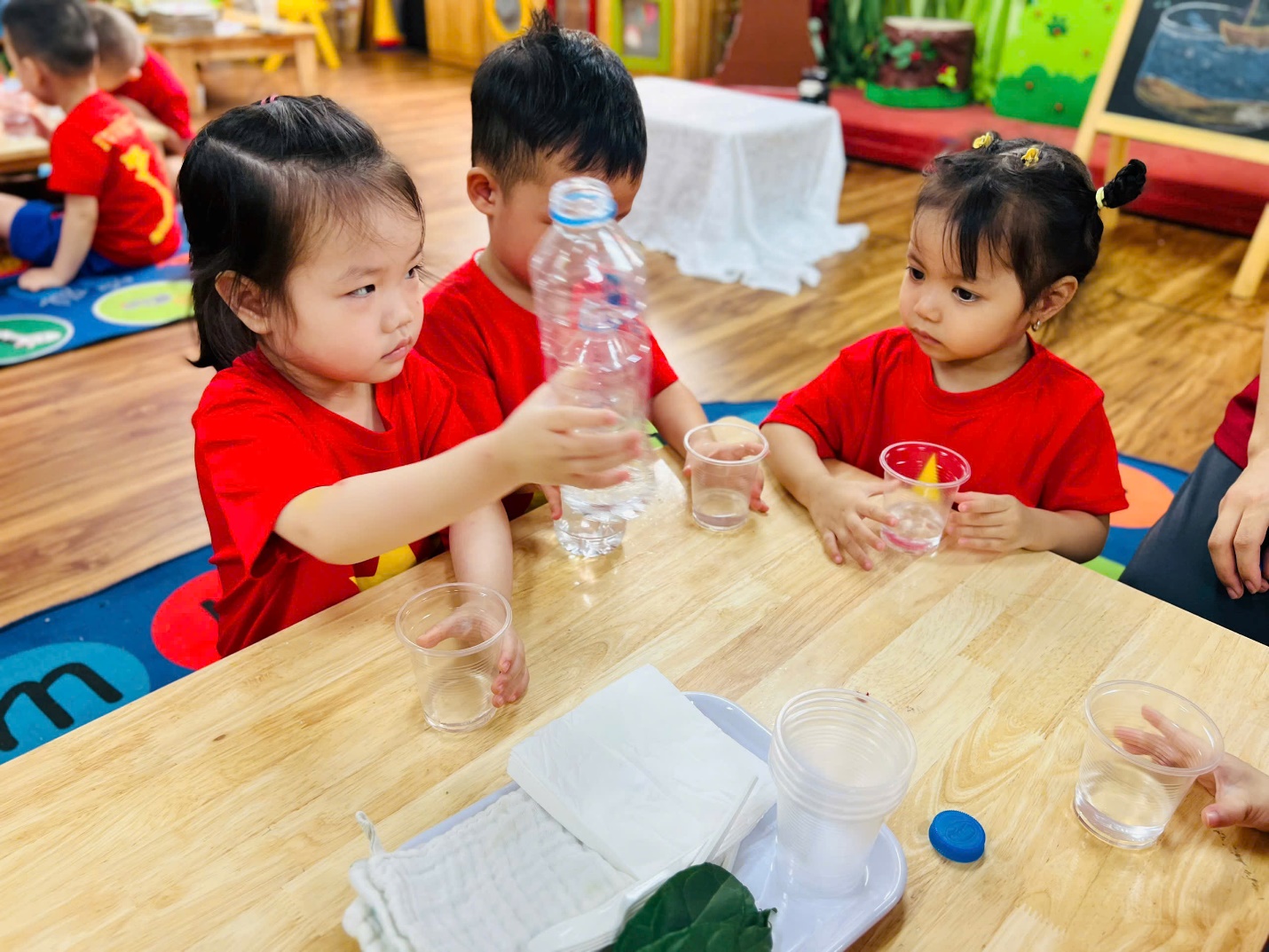 💧 Không dừng lại ở đó, các bạn nhỏ còn được trải nghiệm như những nhà khoa học nhí. Nhìn xem nước có màu gì, ngửi thử xem có mùi không, rót nước để xem nước có chảy không, và thử xem nước có “thích” thấm vào khăn, giấy hay lá cây không?