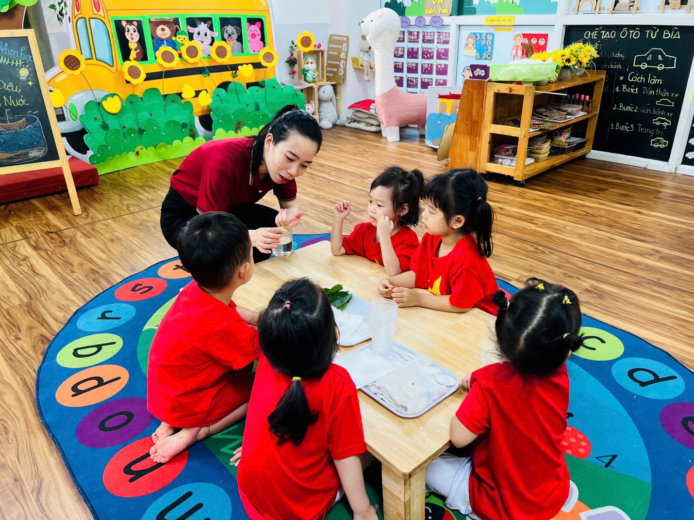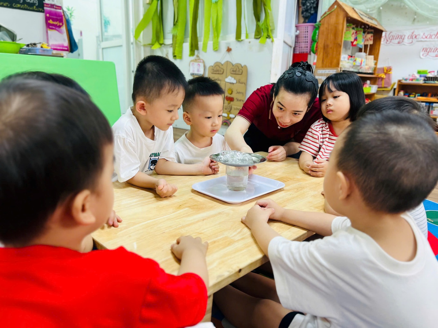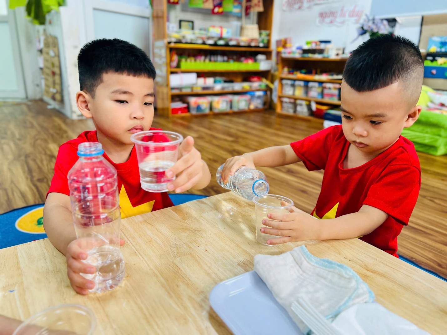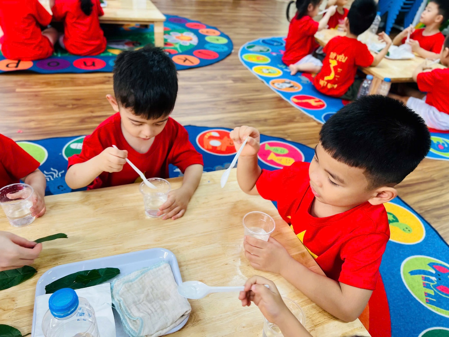 💧 Không dừng lại ở đó, các bạn nhỏ còn được trải nghiệm như những nhà khoa học nhí. Nhìn xem nước có màu gì, ngửi thử xem có mùi không, rót nước để xem nước có chảy không, và thử xem nước có “thích” thấm vào khăn, giấy hay lá cây không?