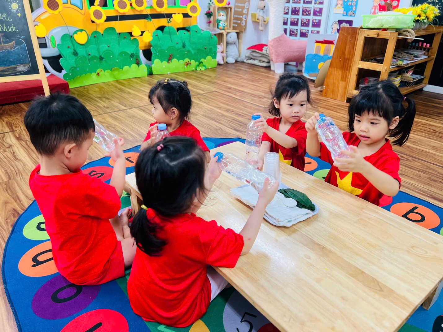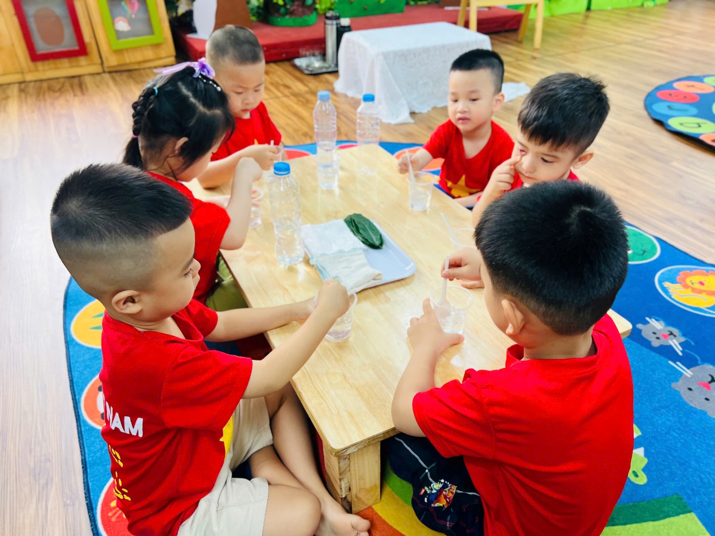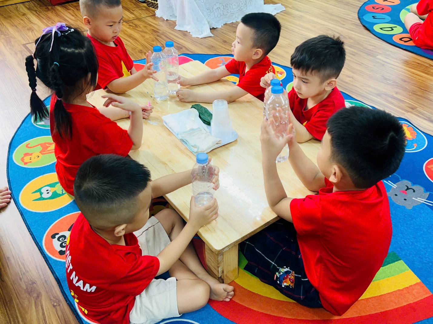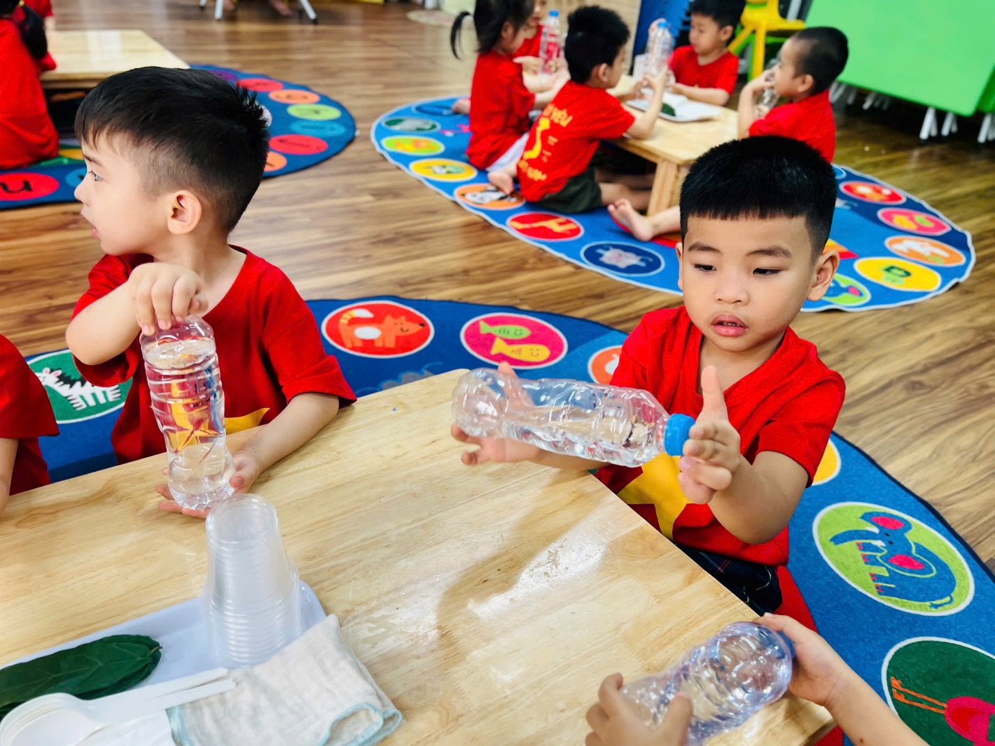 Ngay từ đầu giờ, các bạn nhỏ đã vô cùng hào hứng khi nhận được “món quà bí mật” từ cô giáo. Những chai nước trong veo khiến các con tò mò không biết bên trong có điều gì thú vị đang chờ đón.