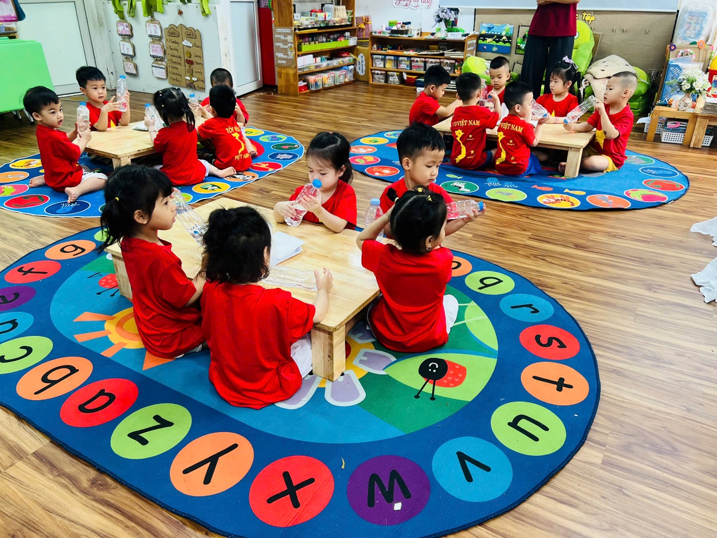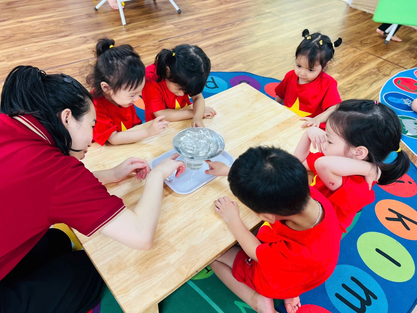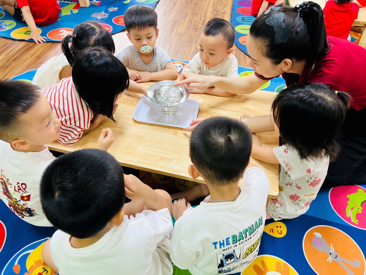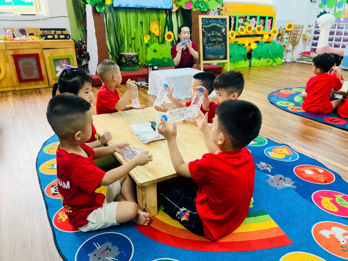 Ngay từ đầu giờ, các bạn nhỏ đã vô cùng hào hứng khi nhận được “món quà bí mật” từ cô giáo. Những chai nước trong veo khiến các con tò mò không biết bên trong có điều gì thú vị đang chờ đón.