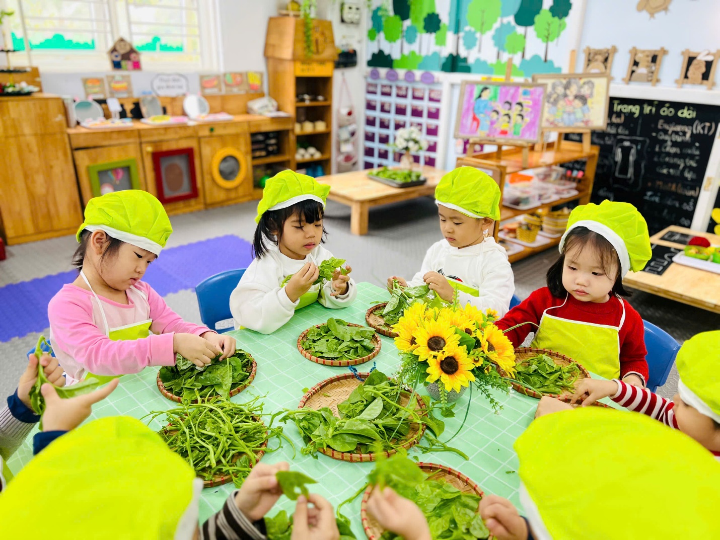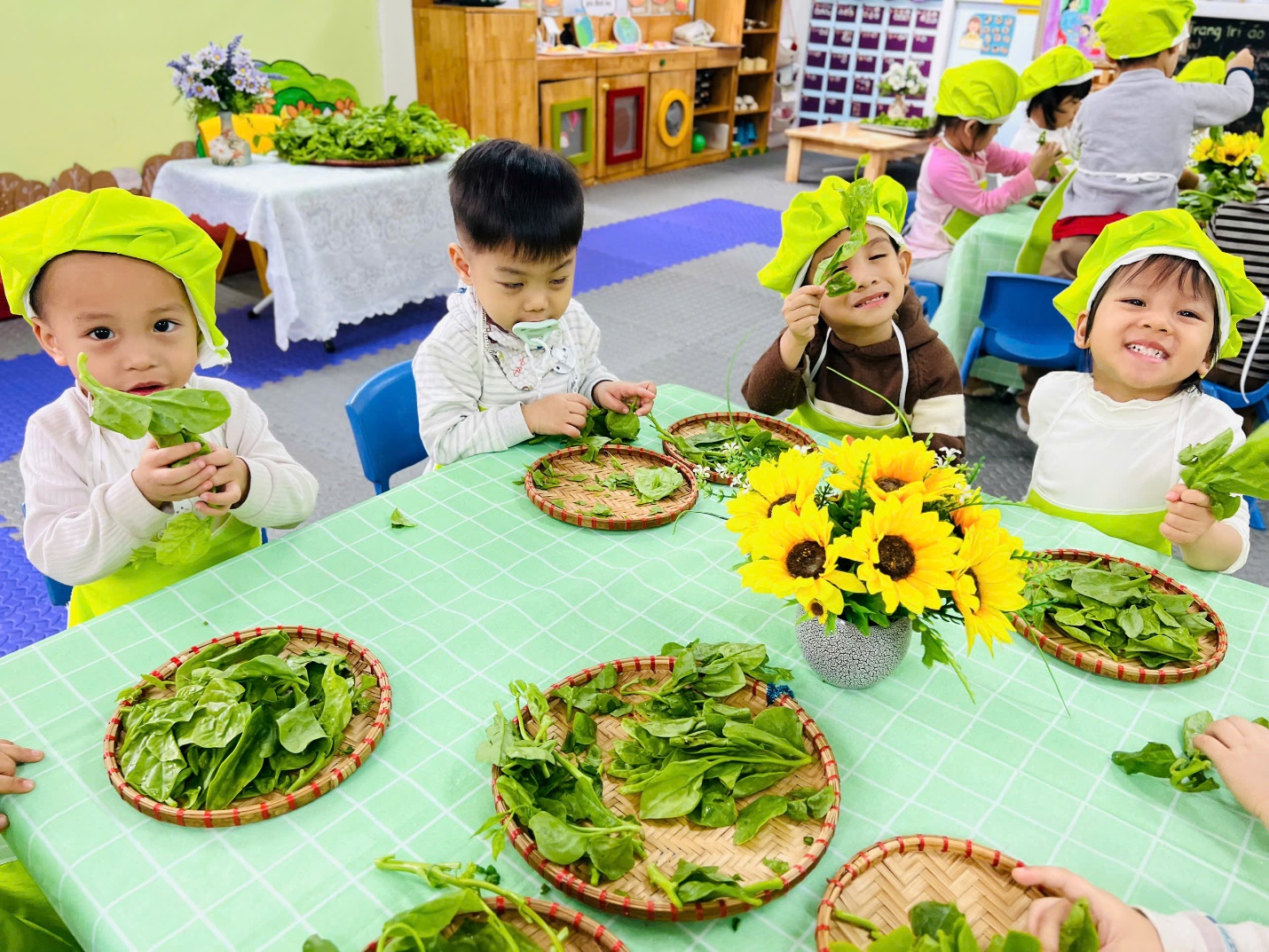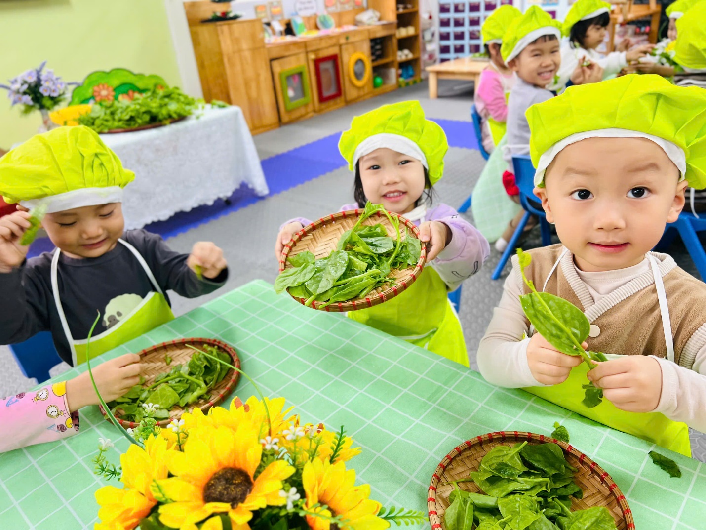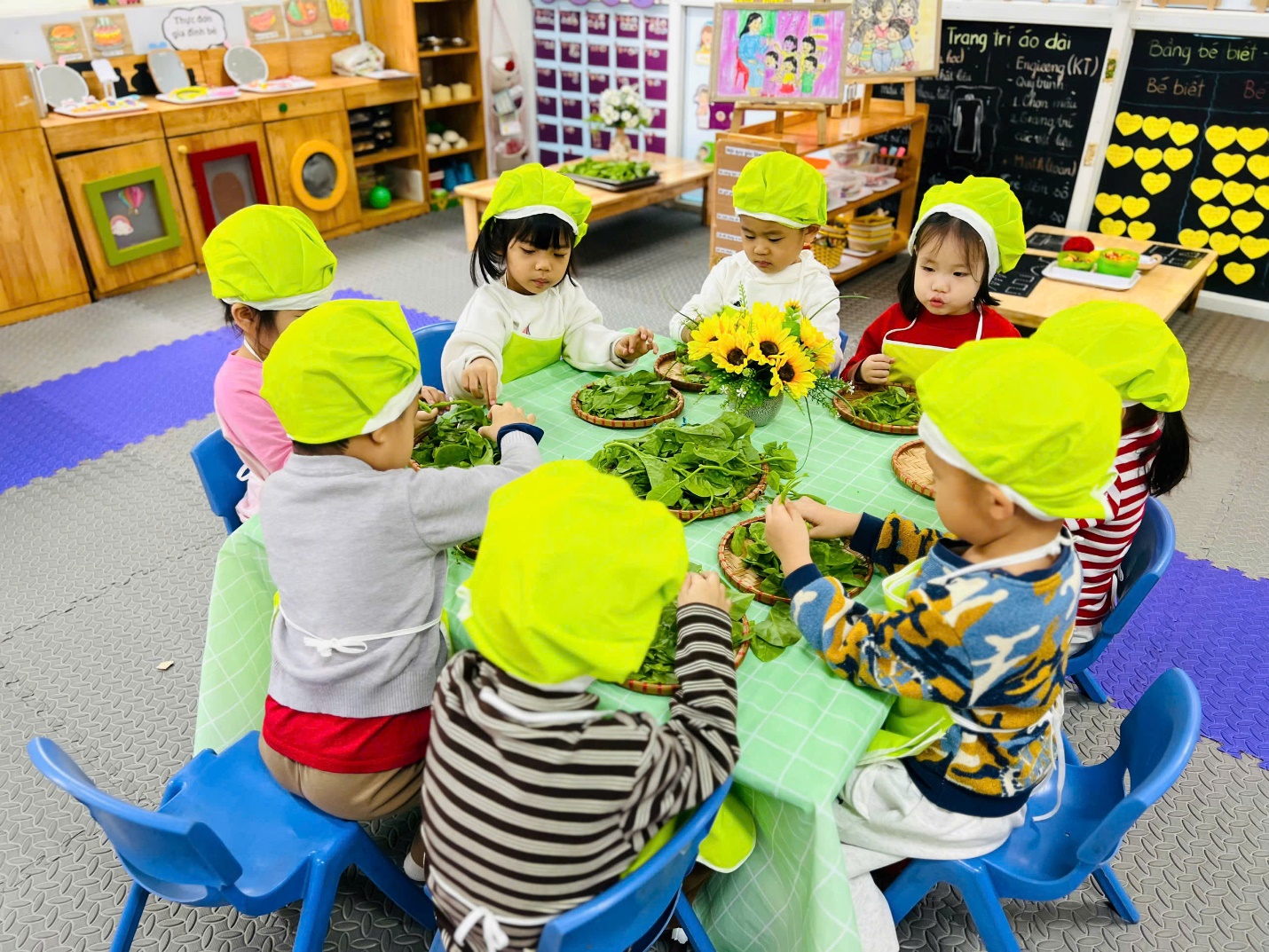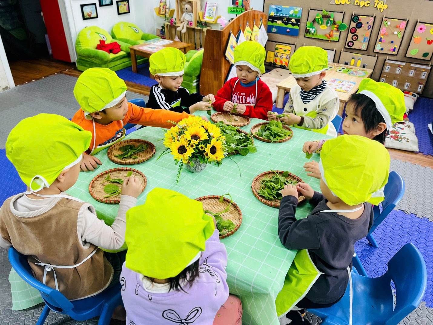 Thông qua hoạt động nhỏ bé này, các con không chỉ được rèn luyện sự khéo léo của bàn tay, khả năng phối hợp tay – mắt mà còn hình thành kỹ năng sống quan trọng: biết phụ giúp việc nhà, biết giữ gìn thực phẩm sạch sẽ, gọn gàng. Các bé cũng học được cách chờ đến lượt, chia sẻ rau với bạn, cùng nhau hoàn thành công việc trong bầu không khí vui vẻ và đoàn kết.