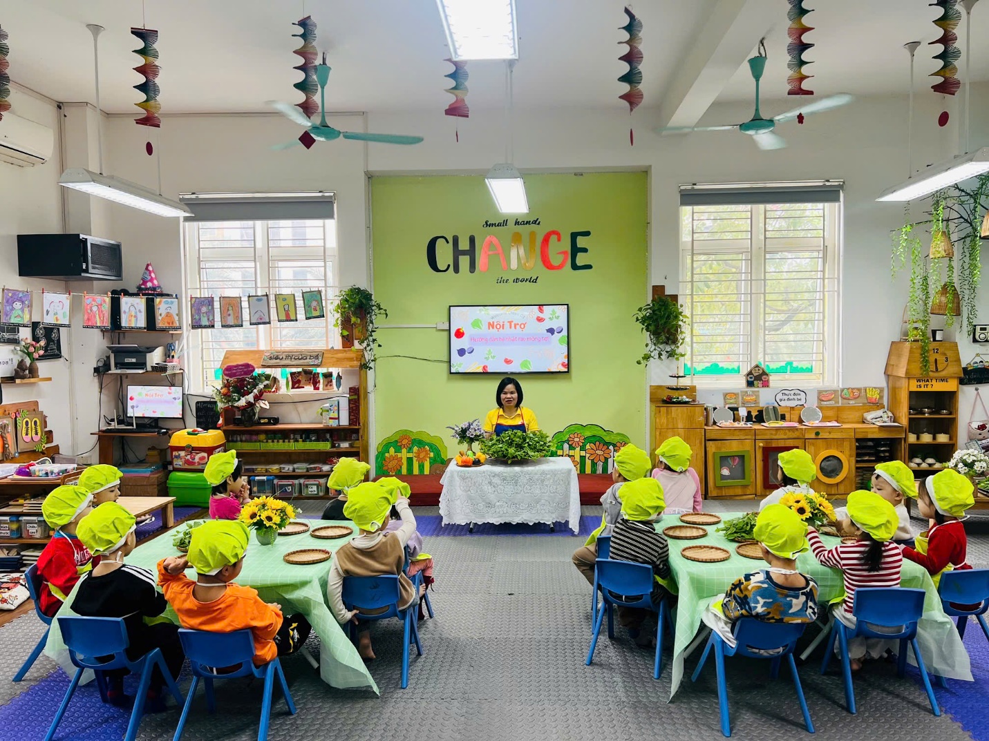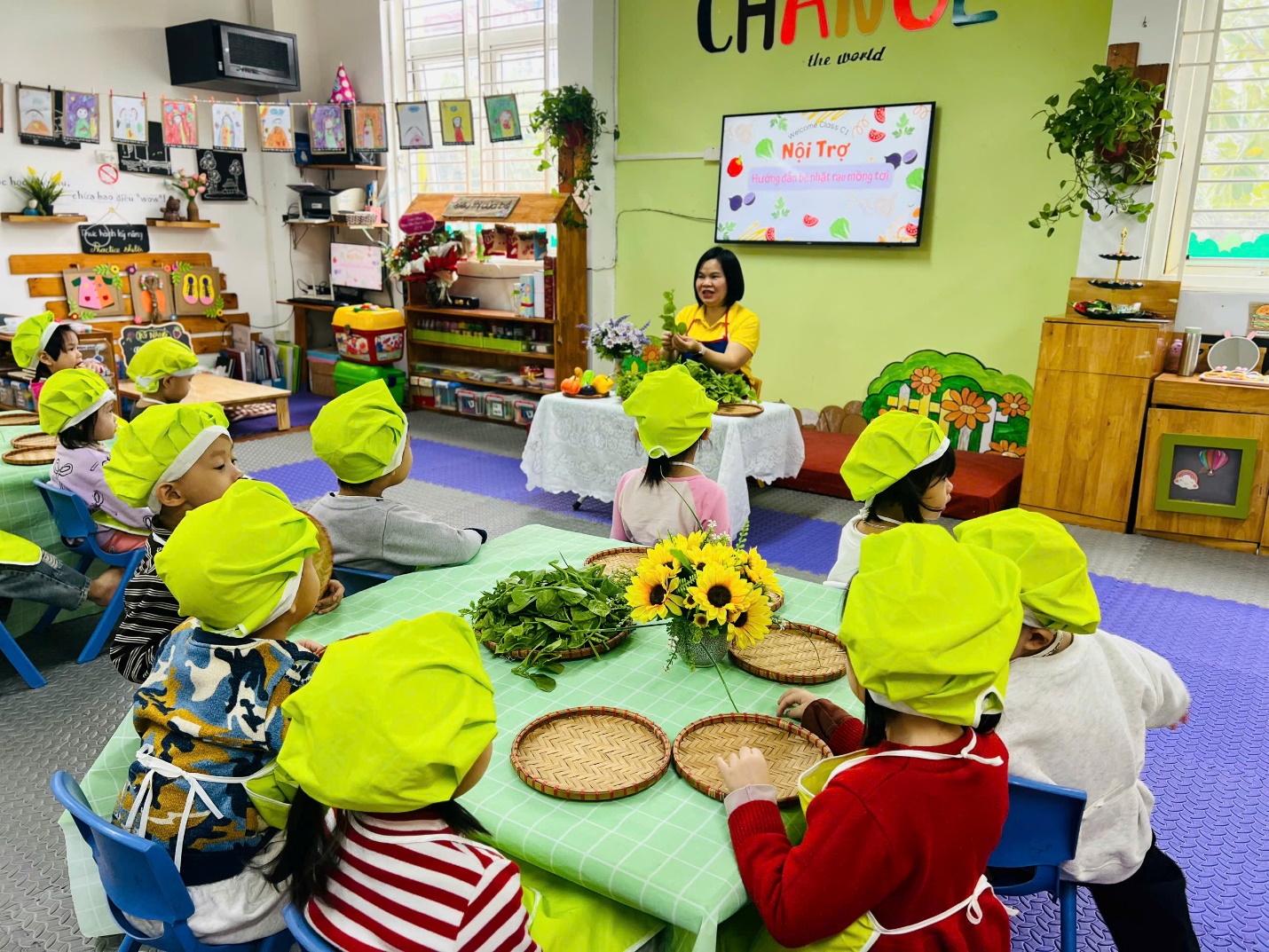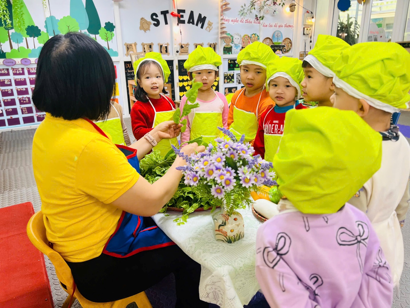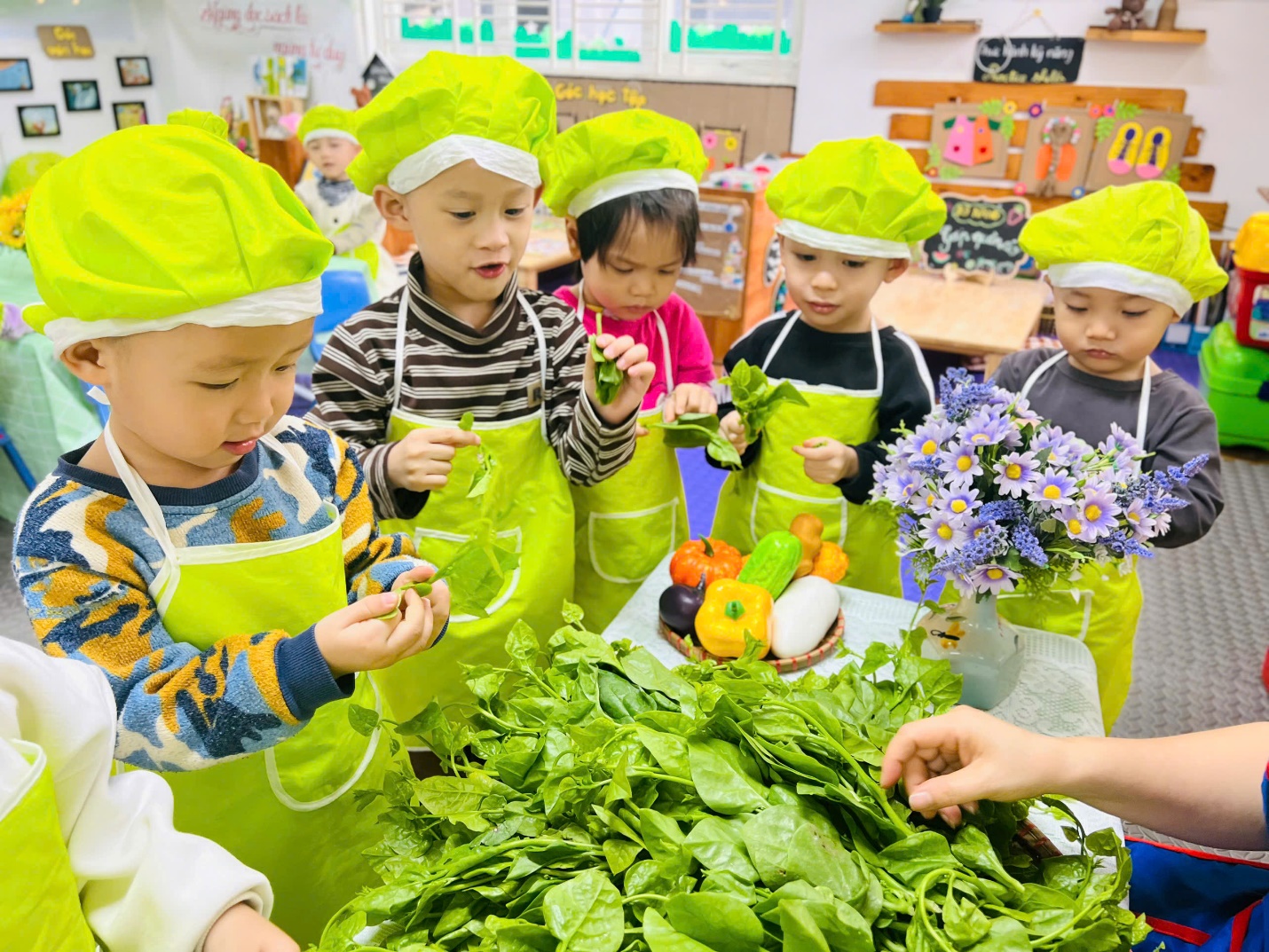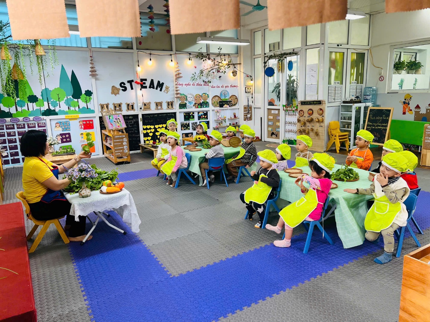 Thông qua hoạt động nhỏ bé này, các con không chỉ được rèn luyện sự khéo léo của bàn tay, khả năng phối hợp tay – mắt mà còn hình thành kỹ năng sống quan trọng: biết phụ giúp việc nhà, biết giữ gìn thực phẩm sạch sẽ, gọn gàng. Các bé cũng học được cách chờ đến lượt, chia sẻ rau với bạn, cùng nhau hoàn thành công việc trong bầu không khí vui vẻ và đoàn kết.