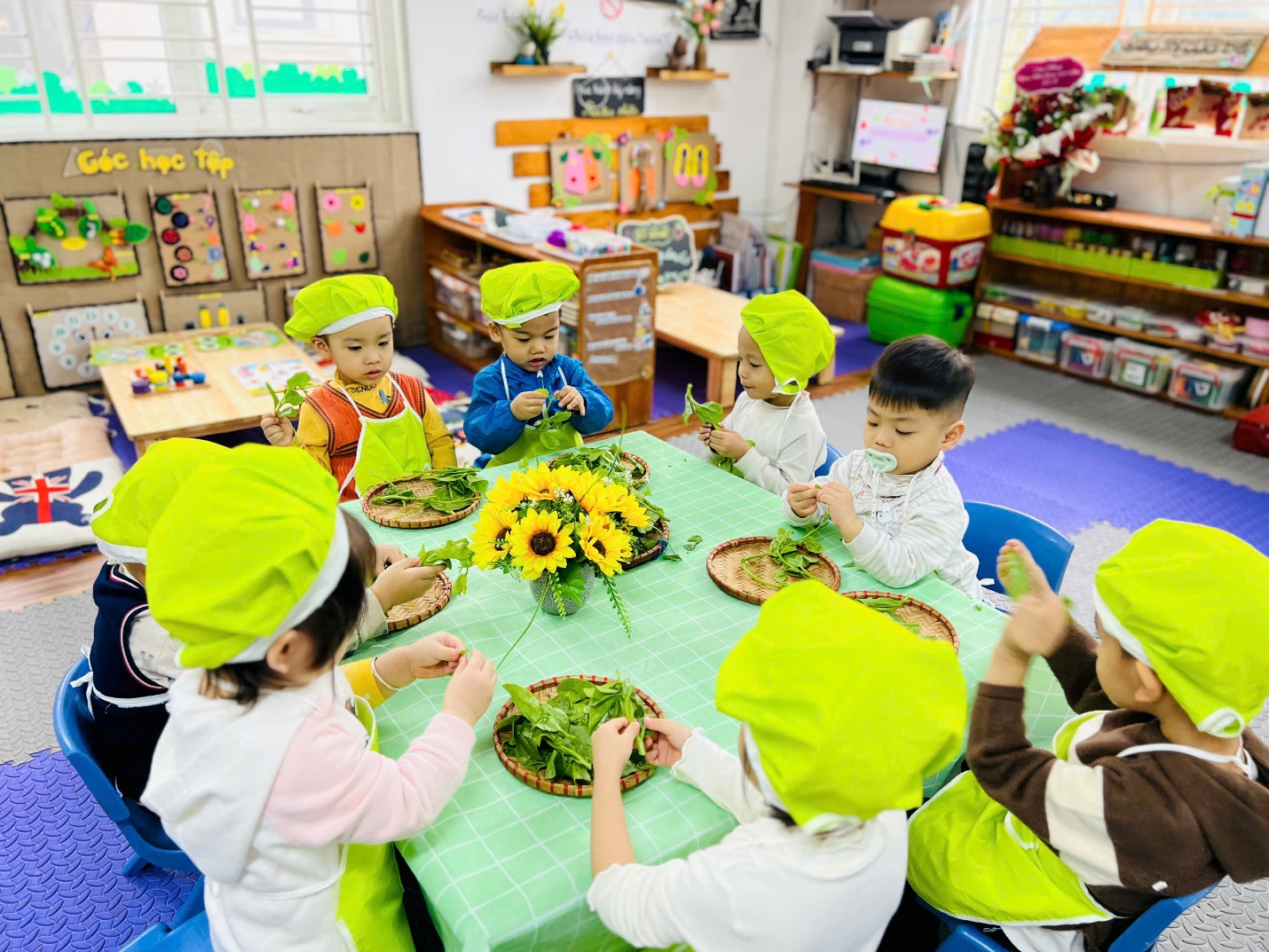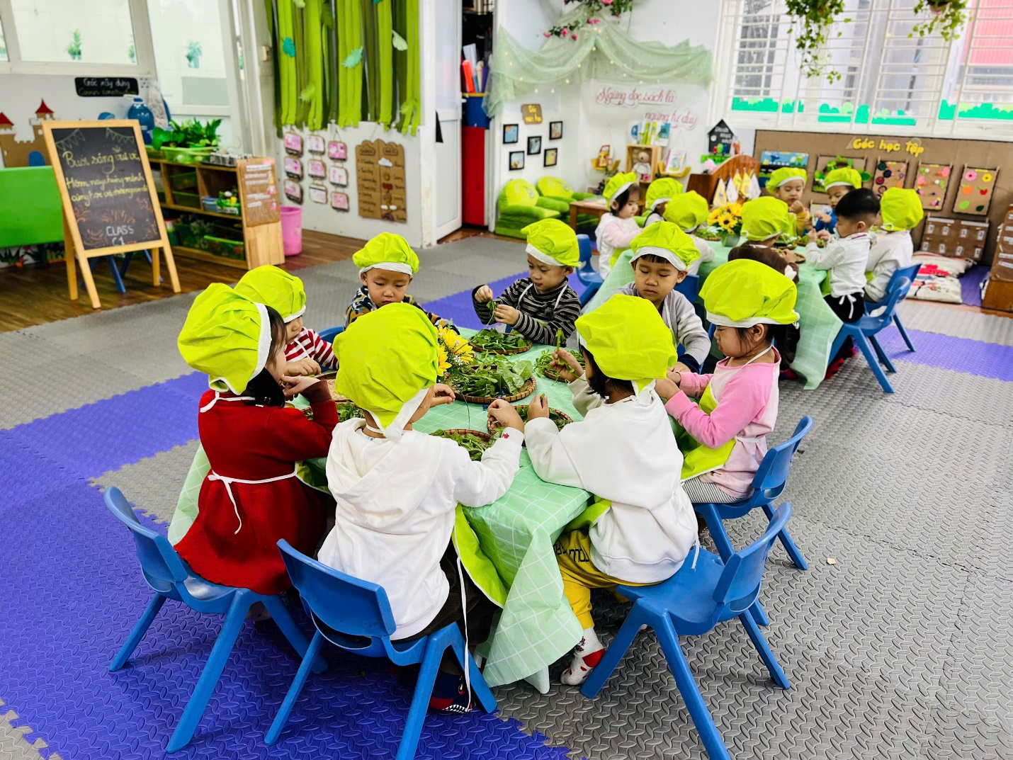 Đến phần thực hành, mỗi bé đều được tận tay cầm những bó rau xanh non, học cách quan sát lá rau, nhẹ nhàng ngắt bỏ phần cuống già, giữ lại những chiếc lá tươi ngon. Đôi bàn tay còn vụng về nhưng vô cùng cẩn thận, gương mặt nghiêm túc như những “đầu bếp nhí” thực thụ. Có bé vừa nhặt vừa mỉm cười thích thú, có bé khẽ khoe: “Con nhặt giỏi lắm cô ơi!” – khiến cả lớp bật cười đầy yêu thương.