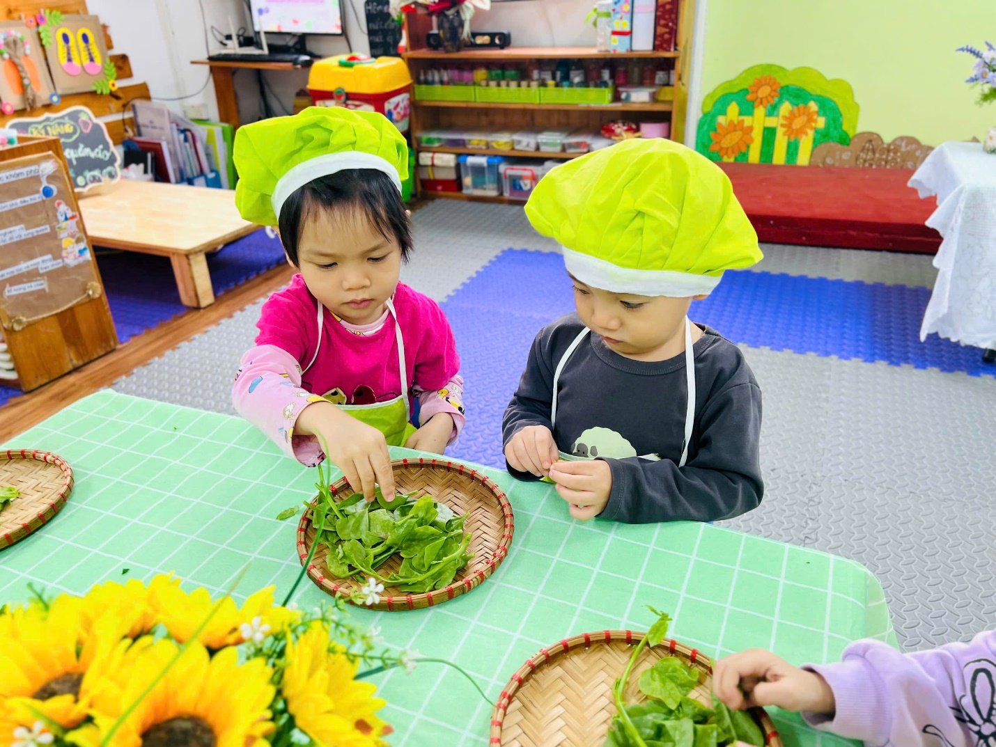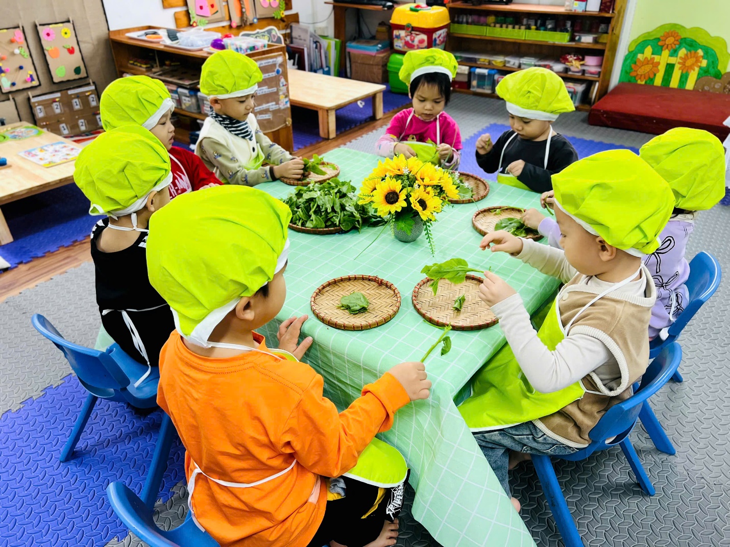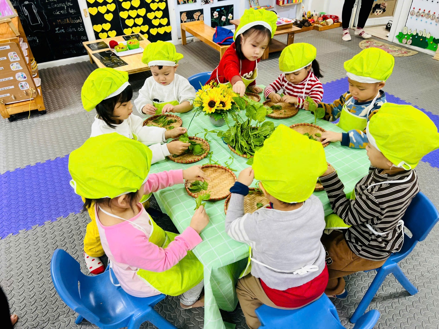 Hôm nay, các bé lớp C1 (3–4 tuổi) đã có một giờ học nội trợ vô cùng đáng yêu và bổ ích với hoạt động “Hướng dẫn bé nhặt rau mồng tơi”.