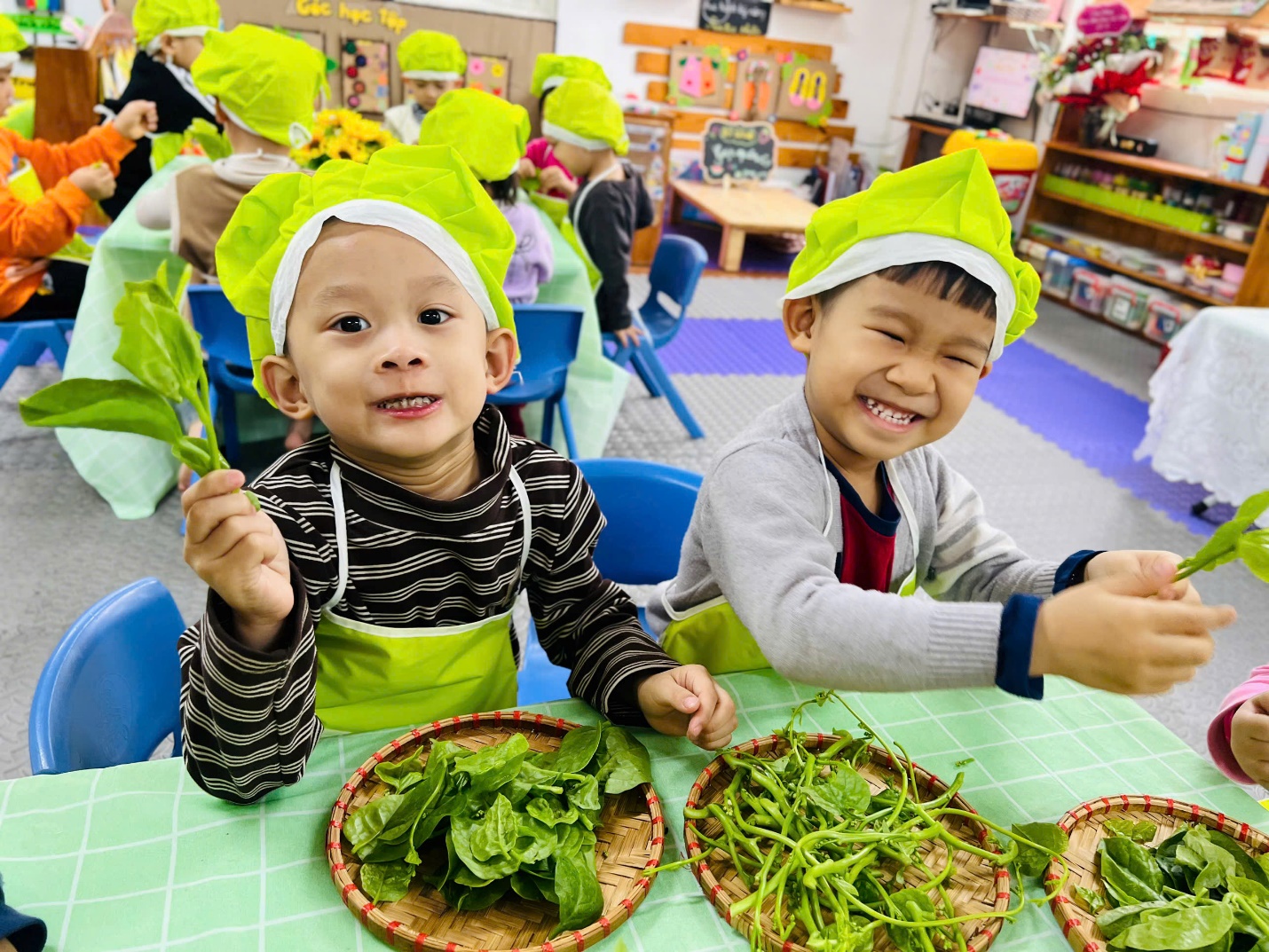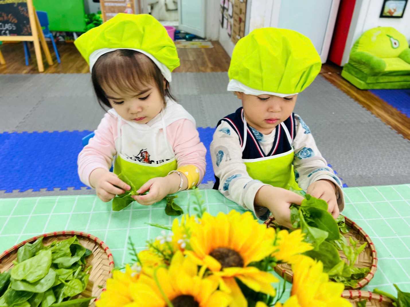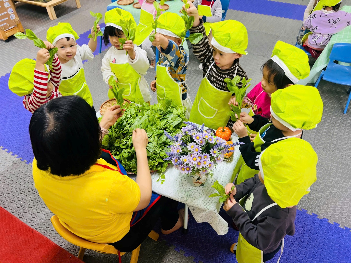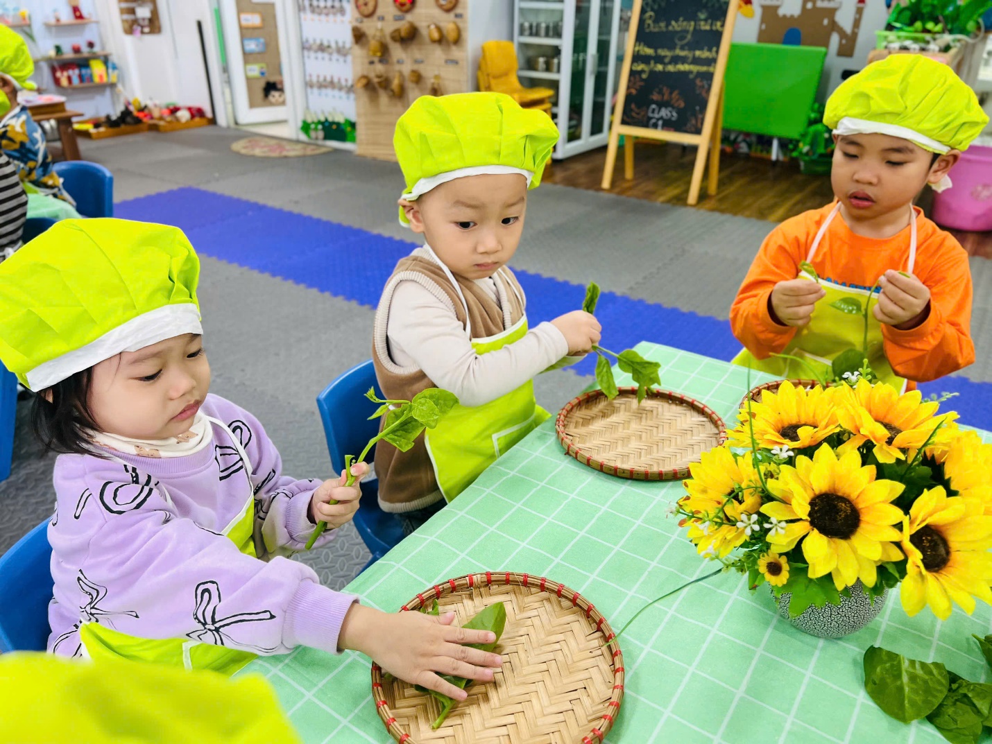 Hôm nay, các bé lớp C1 (3–4 tuổi) đã có một giờ học nội trợ vô cùng đáng yêu và bổ ích với hoạt động “Hướng dẫn bé nhặt rau mồng tơi”.