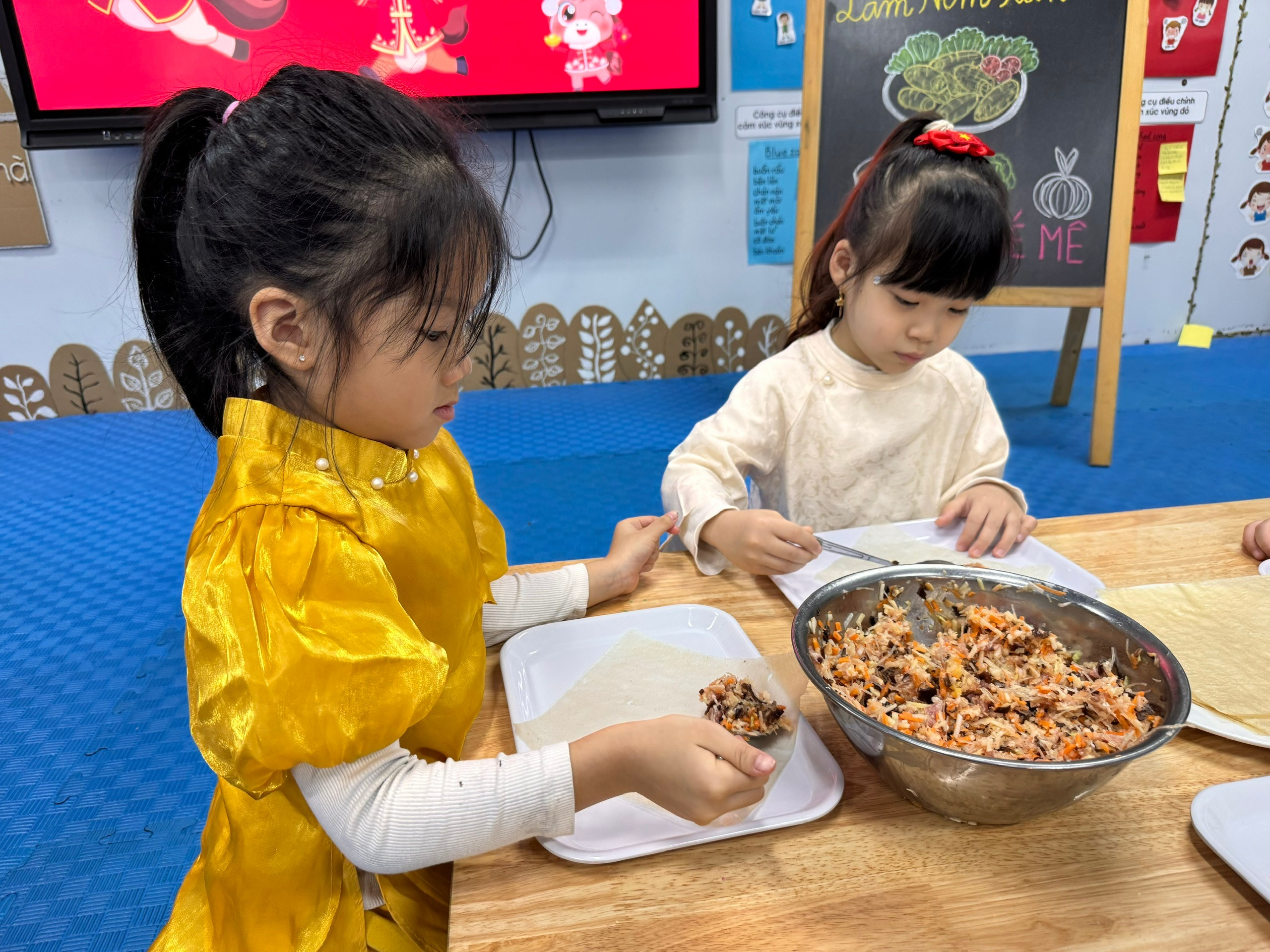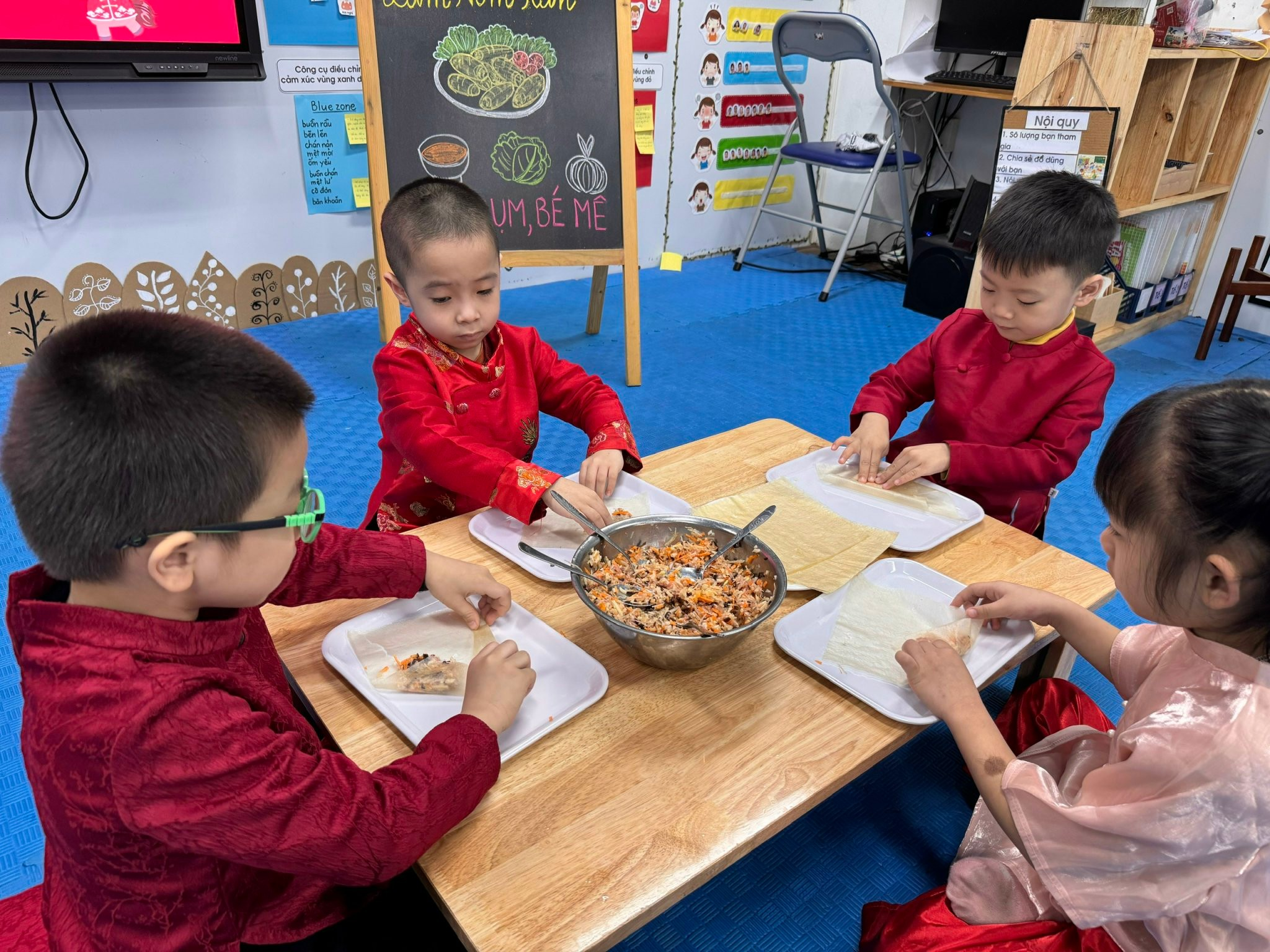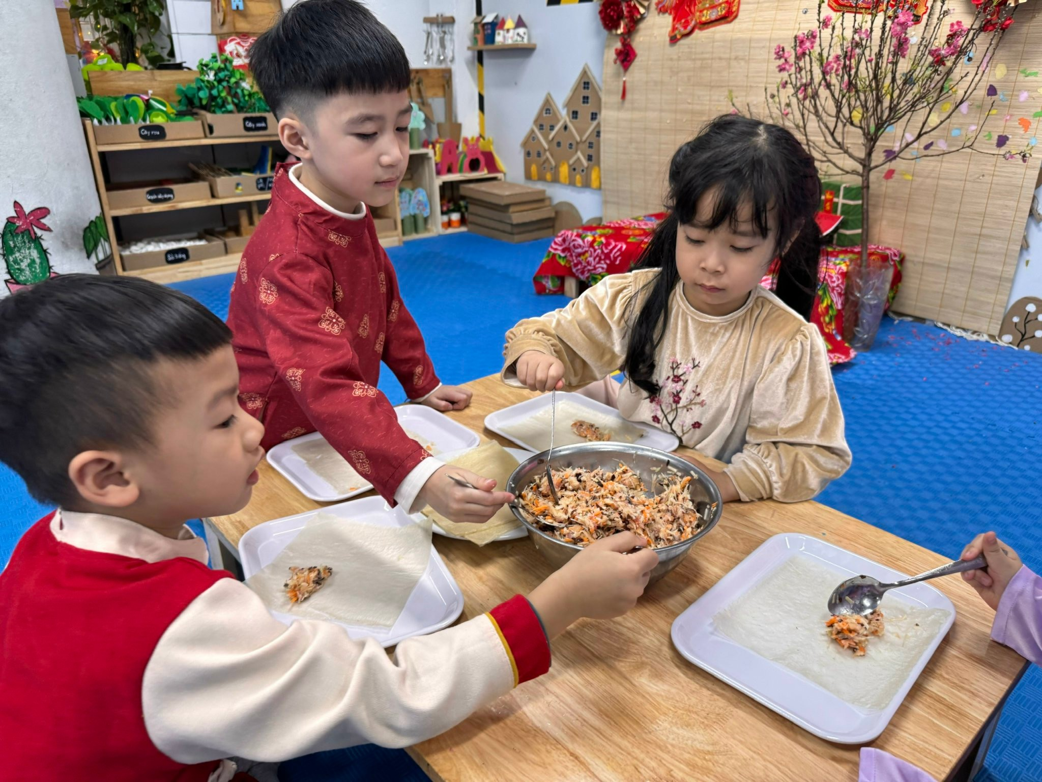 Bên cạnh đó, các trò chơi ngày Tết được tổ chức sôi nổi, giúp các con vừa vận động, vừa gắn kết bạn bè trong tiếng cười giòn tan. Và đặc biệt, hoạt động làm nem rán đã mang đến cho các bé cơ hội được hóa thân thành những “đầu bếp nhí”, tự tay cuốn từng chiếc nem nhỏ xinh, cảm nhận hương vị Tết trong gian bếp ấm cúng.