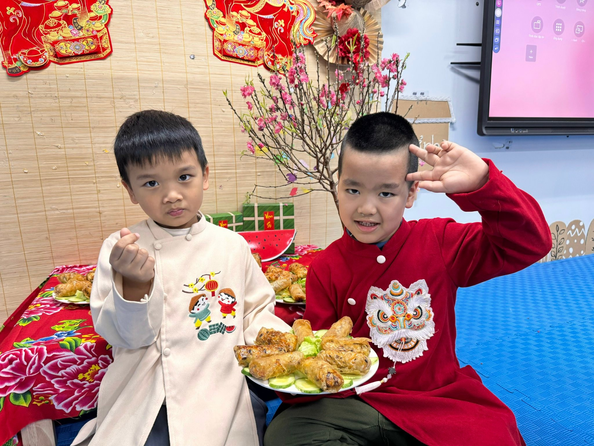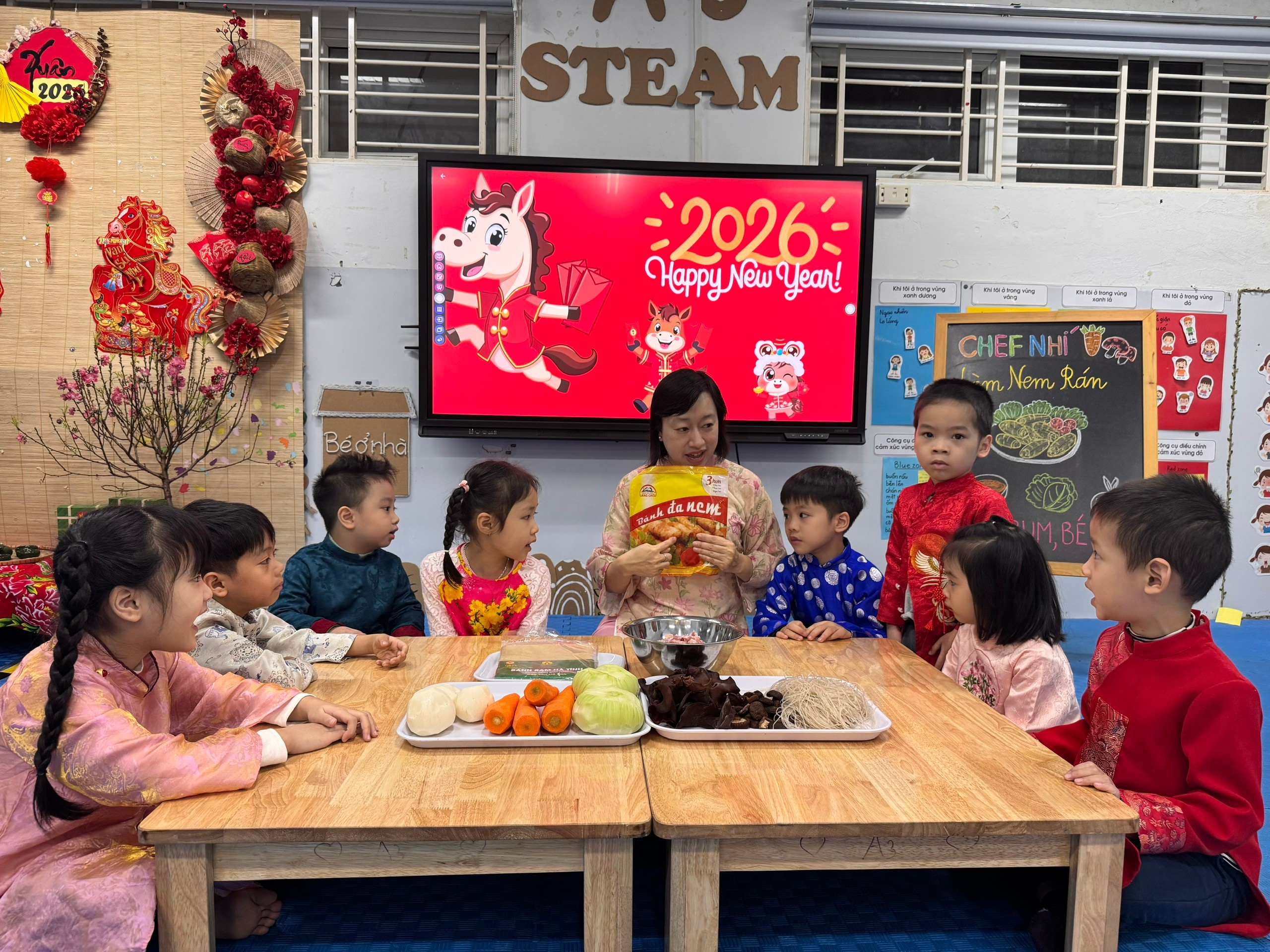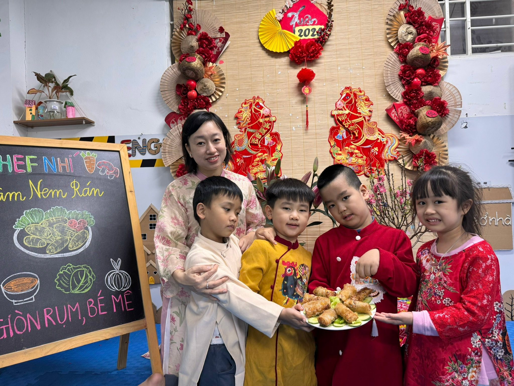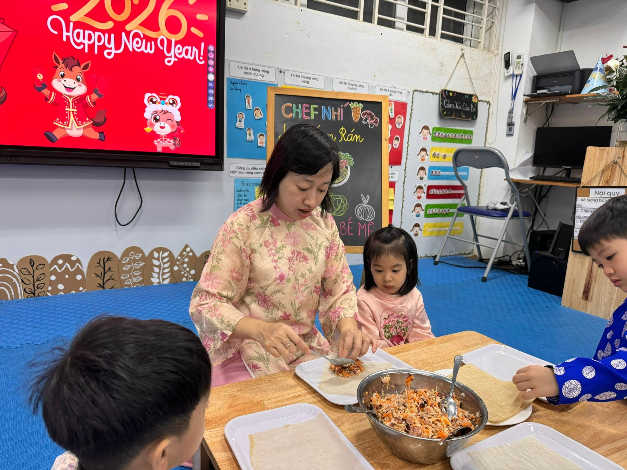 Bên cạnh đó, các trò chơi ngày Tết được tổ chức sôi nổi, giúp các con vừa vận động, vừa gắn kết bạn bè trong tiếng cười giòn tan. Và đặc biệt, hoạt động làm nem rán đã mang đến cho các bé cơ hội được hóa thân thành những “đầu bếp nhí”, tự tay cuốn từng chiếc nem nhỏ xinh, cảm nhận hương vị Tết trong gian bếp ấm cúng.