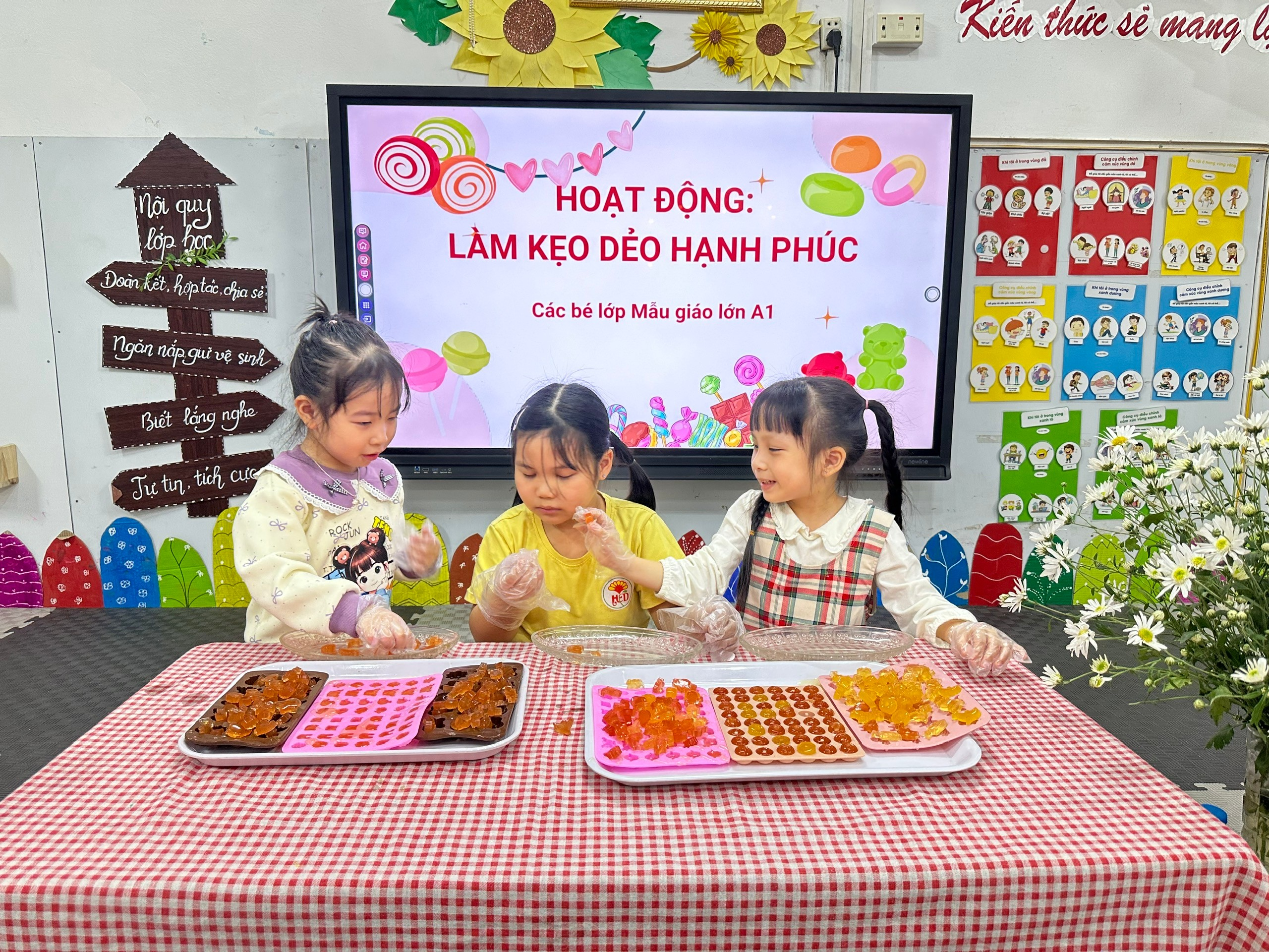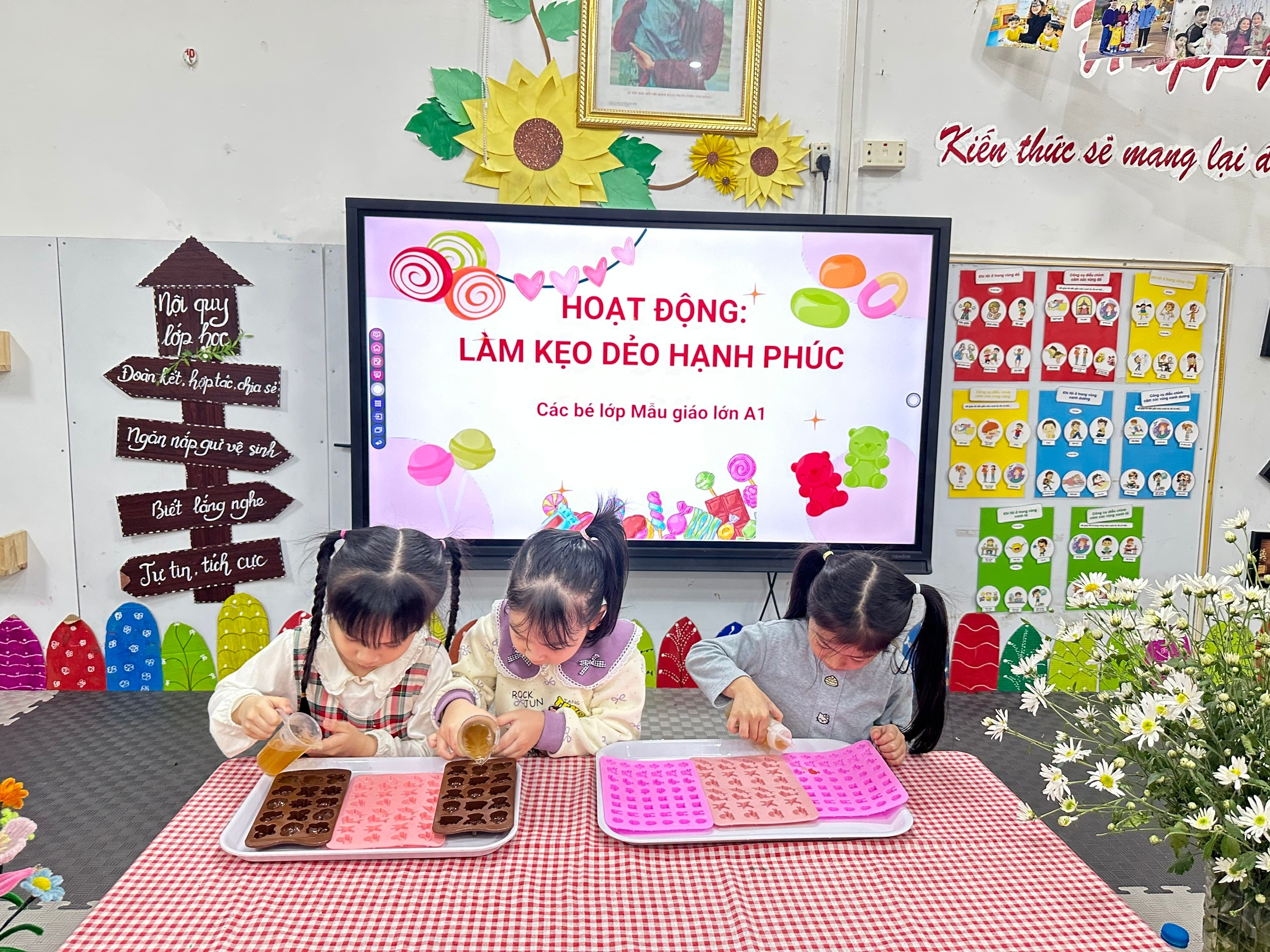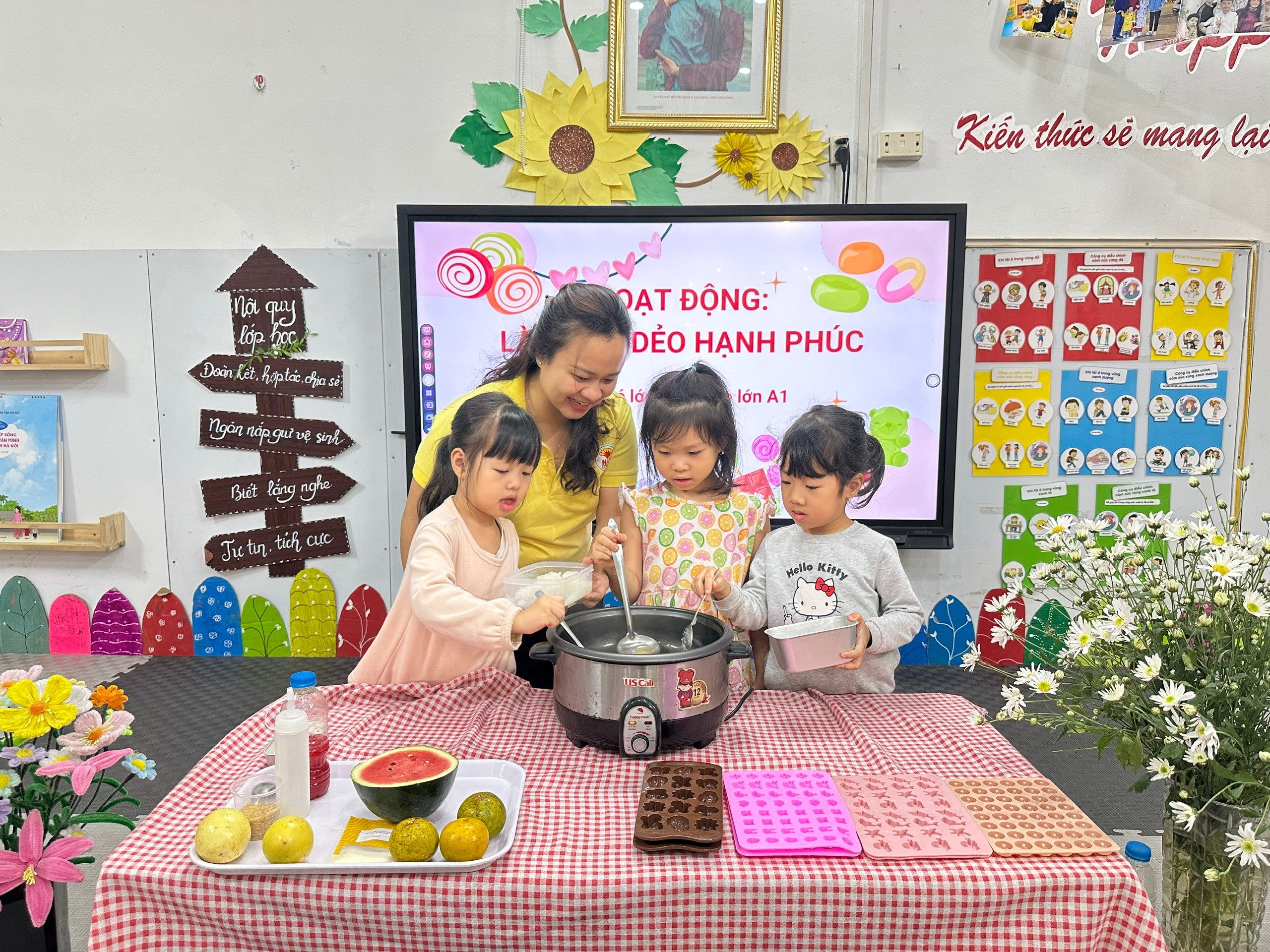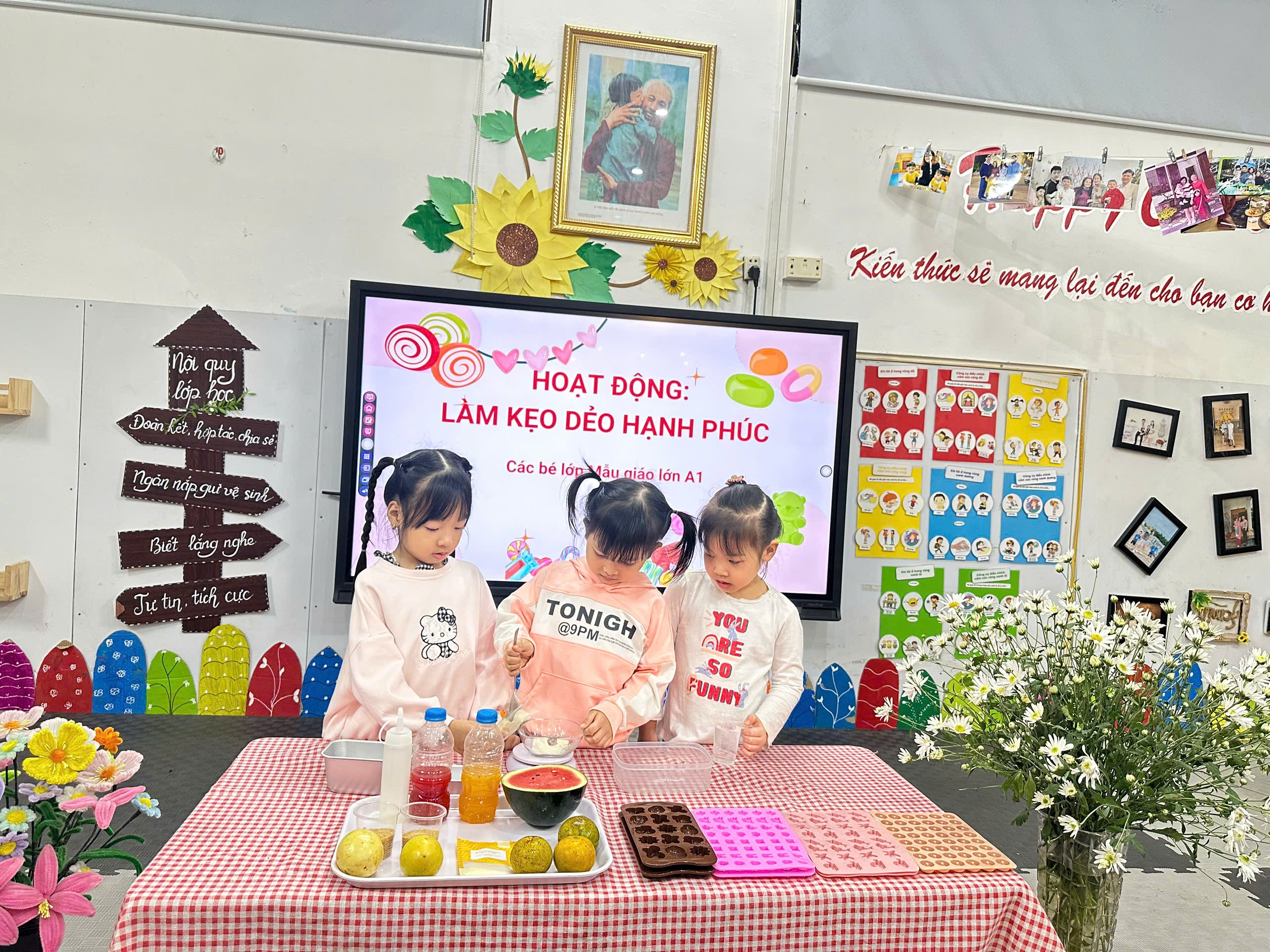 Hoạt động “Kẹo dẻo hạnh phúc” mang đến cho các bé lớp A1 một buổi trải nghiệm rèn được sự khéo léo, tính cẩn thận và cảm nhận được niềm vui khi tự tay làm ra sản phẩm ngọt ngào của chính mình.