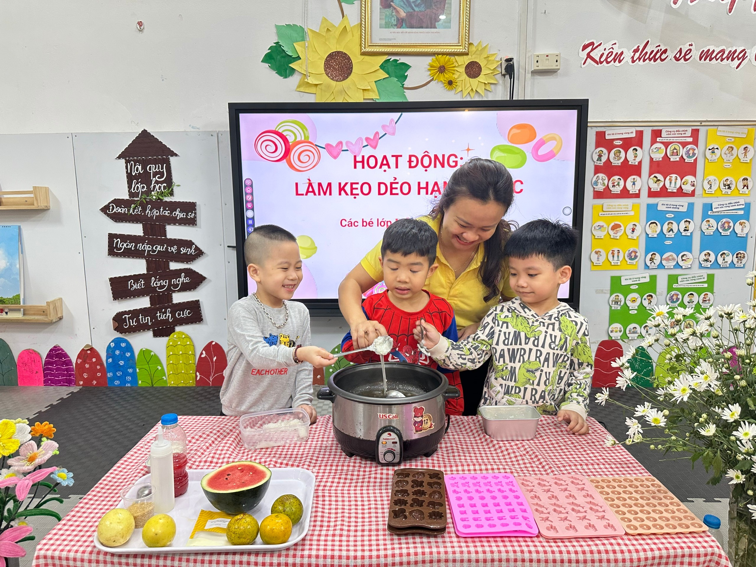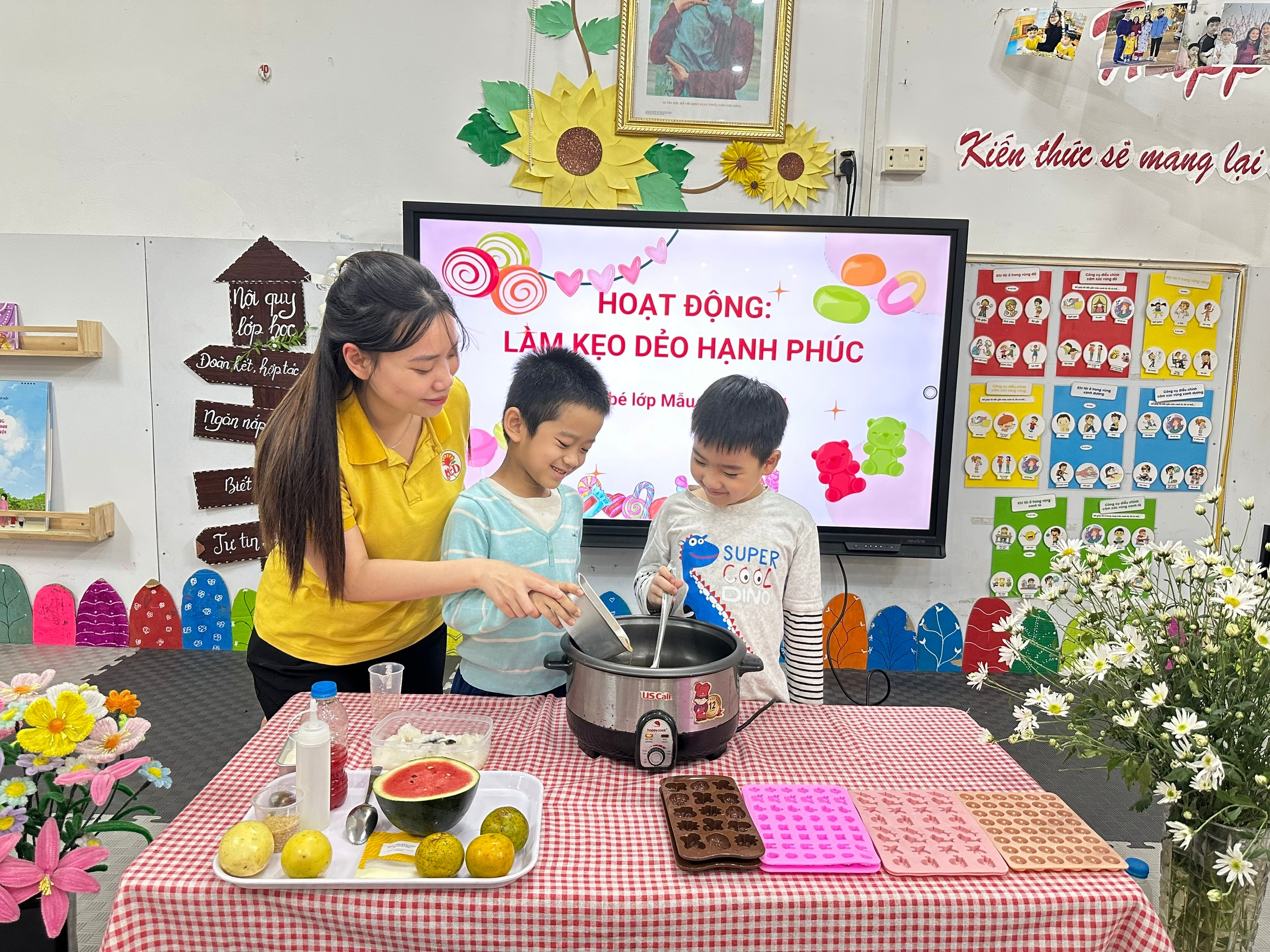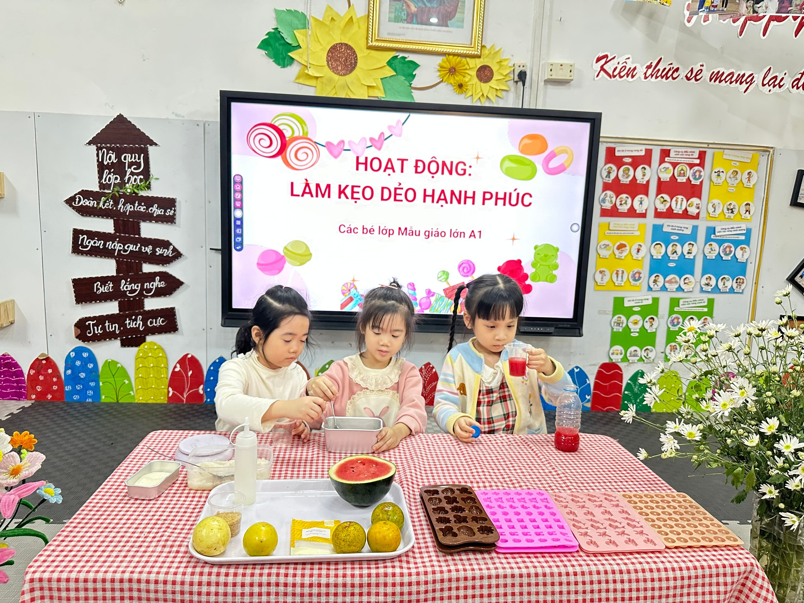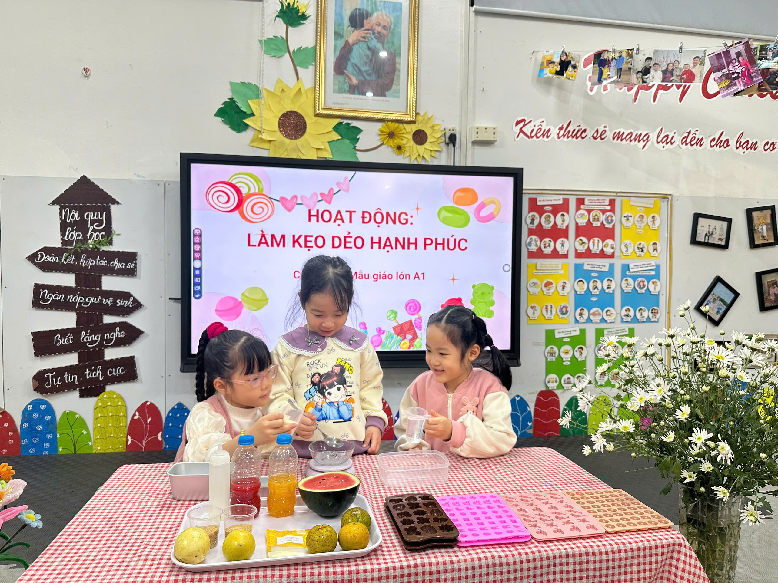 Hoạt động “Kẹo dẻo hạnh phúc” mang đến cho các bé lớp A1 một buổi trải nghiệm rèn được sự khéo léo, tính cẩn thận và cảm nhận được niềm vui khi tự tay làm ra sản phẩm ngọt ngào của chính mình.