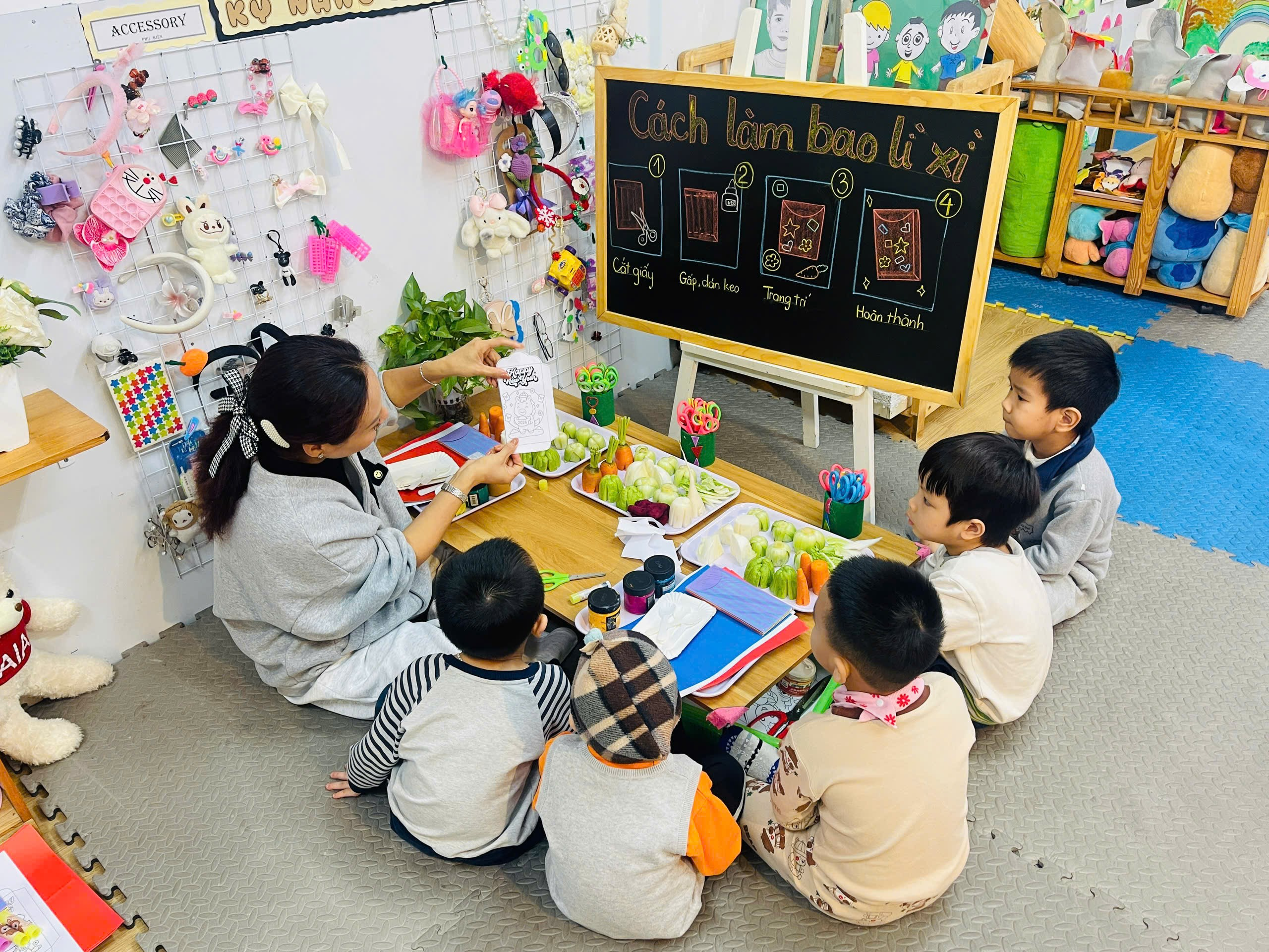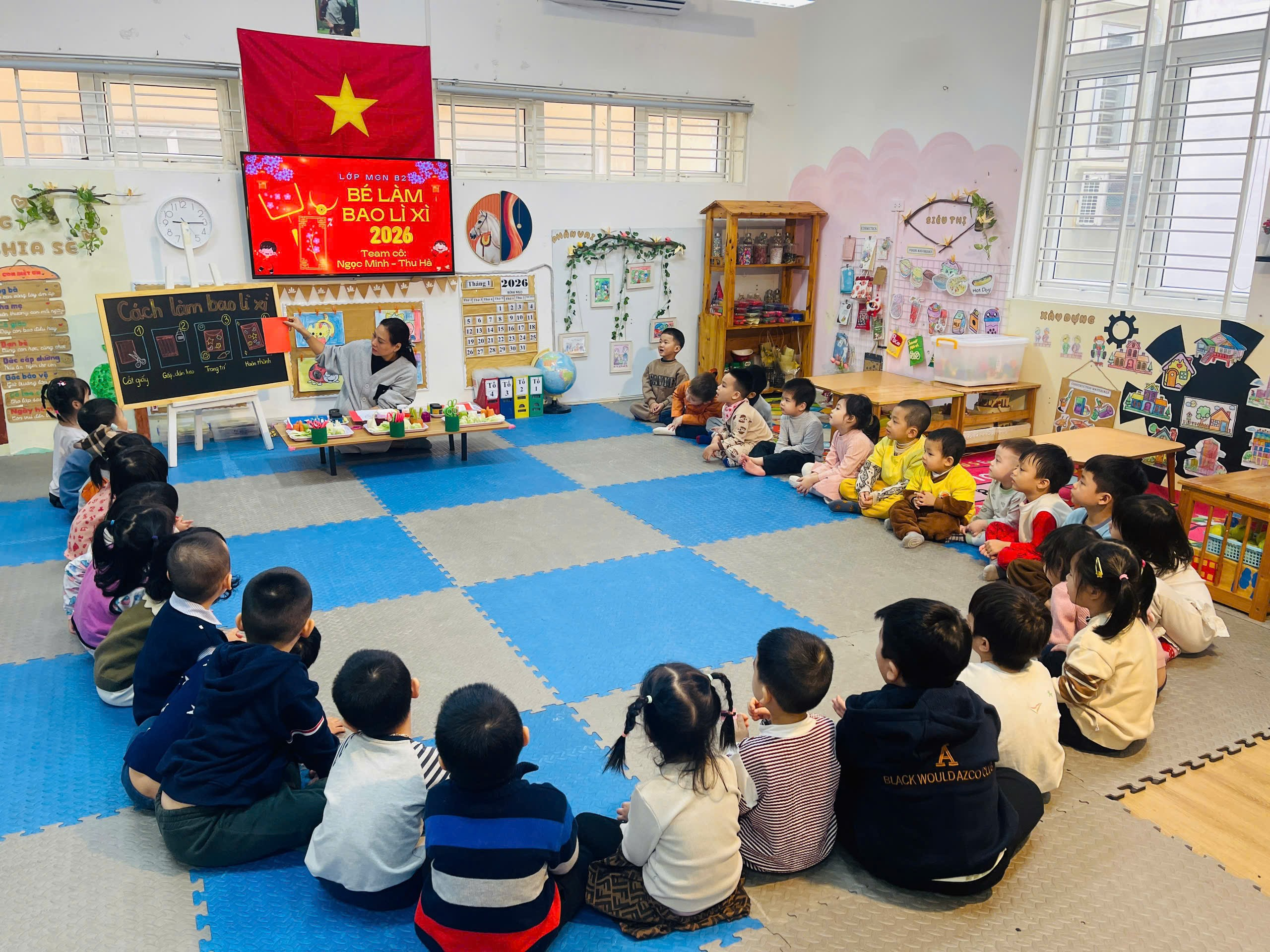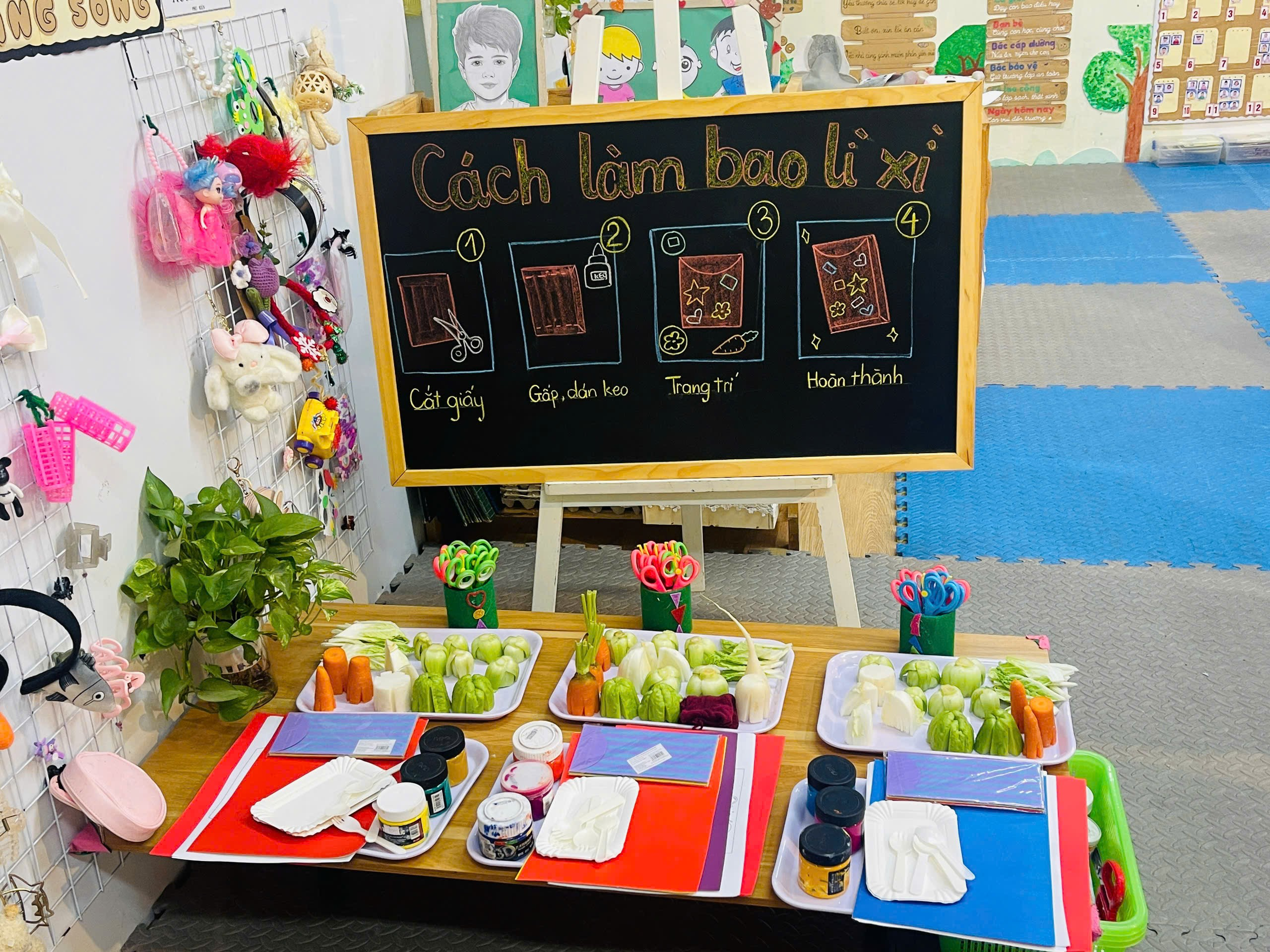 Các con được cô giáo giới thiệu về ý nghĩa của bao lì xì trong ngày Tết cổ truyền – biểu tượng của lời chúc may mắn, bình an và hạnh phúc. Sau đó, các bé tự tay lựa chọn màu sắc, hình dán, họa tiết trang trí để tạo nên những chiếc bao lì xì mang dấu ấn riêng của mình.