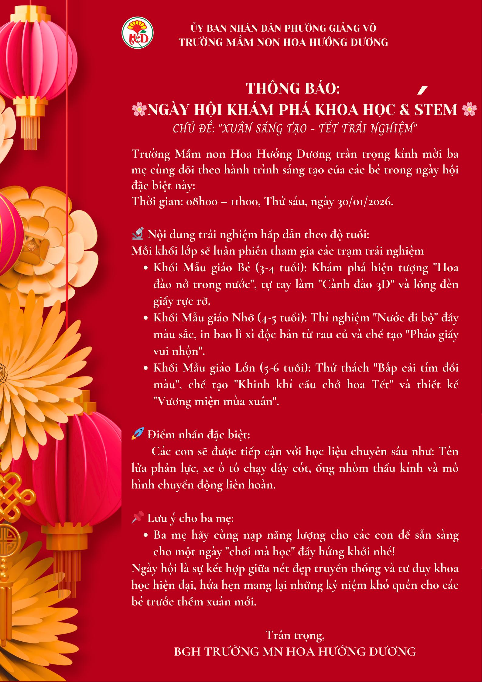 Trường mầm non Hoa Hướng Dương thông báo lịch nghỉ Tết Nguyên Đán 2026