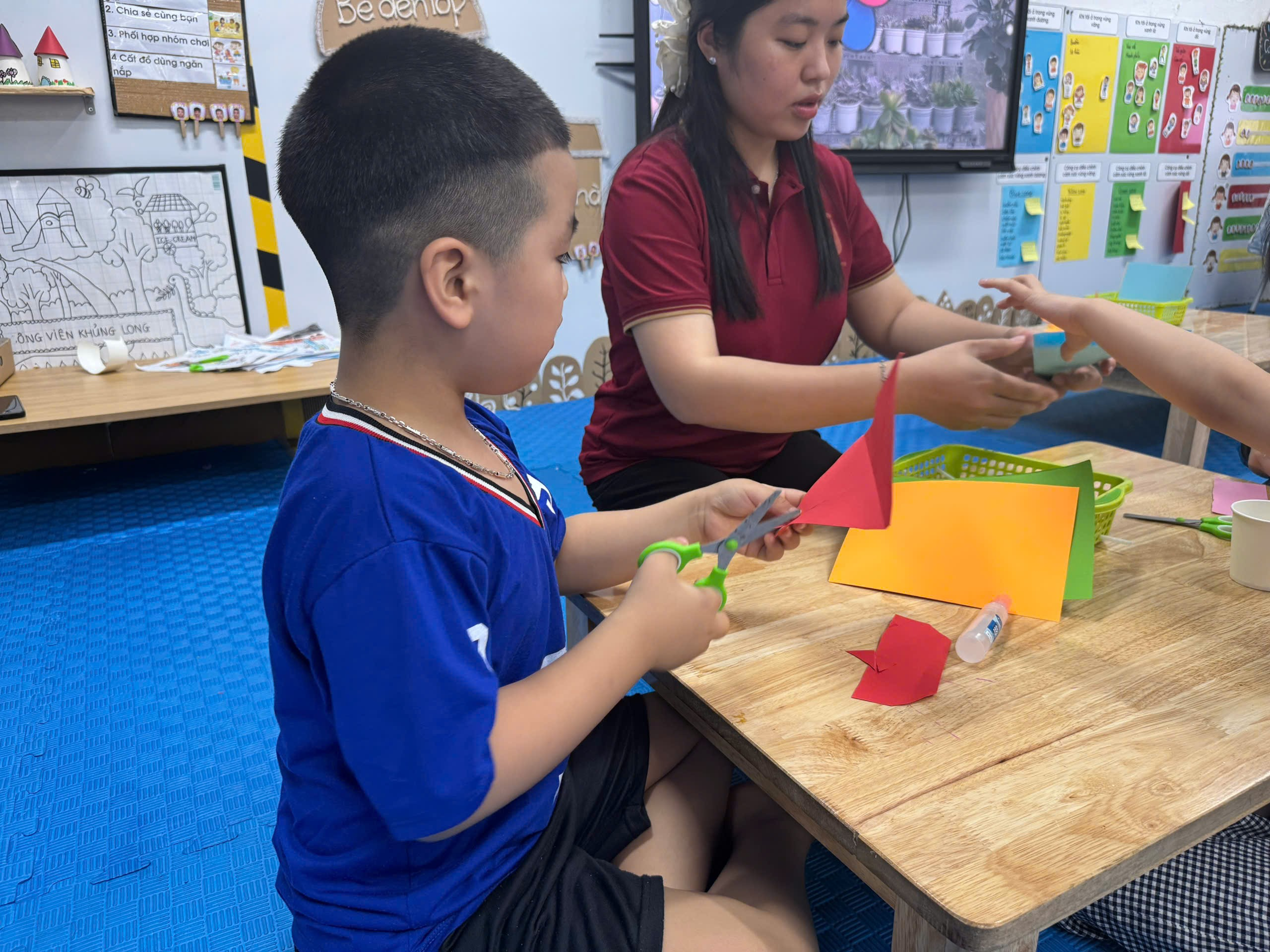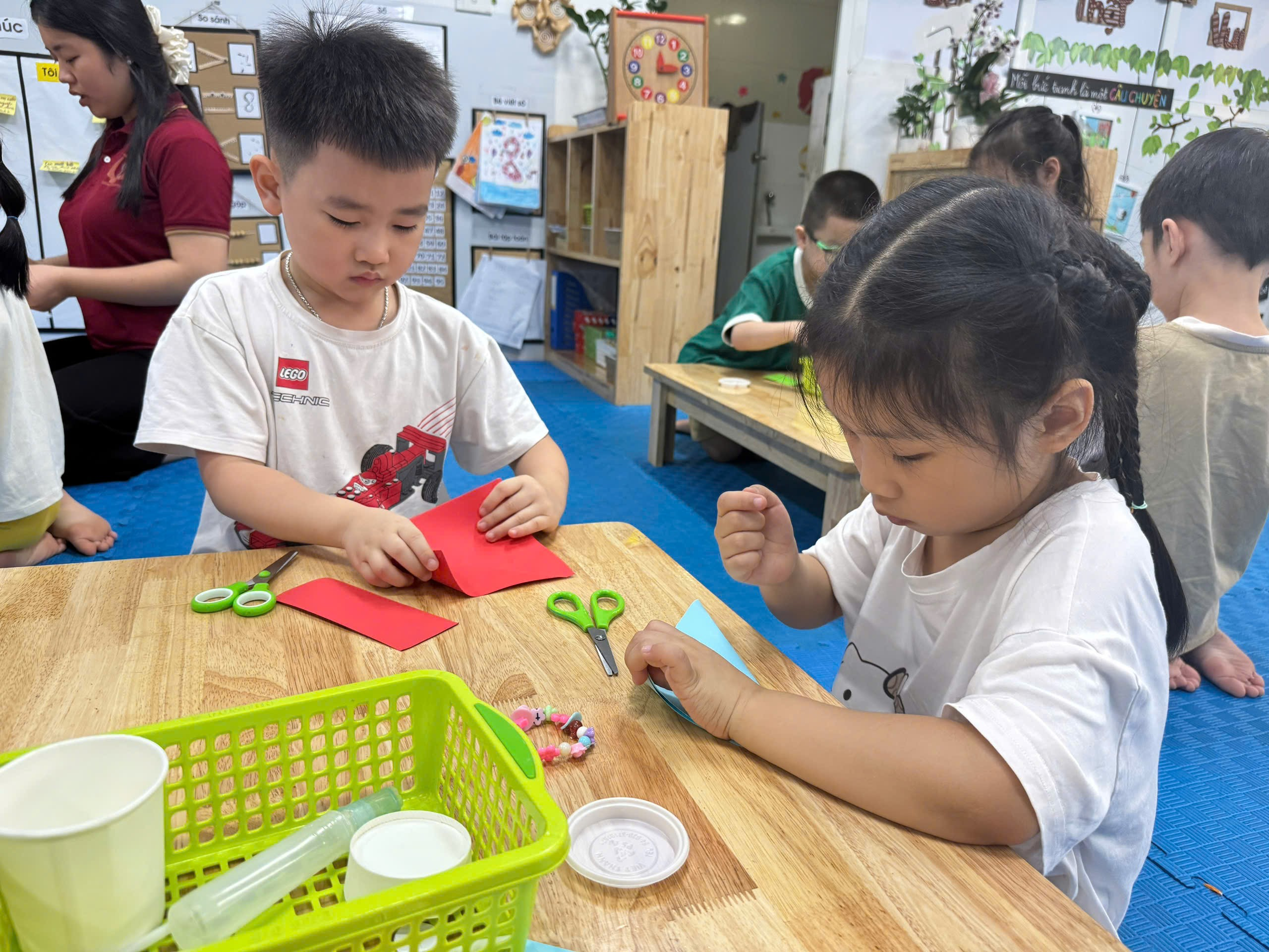 Trong không khí vui tươi của giờ học, các bé lớp A3 hào hứng tham gia hoạt động làm chong chóng. Từ những tờ giấy màu đơn giản, dưới sự hướng dẫn của cô, đôi bàn tay nhỏ nhắn đã tỉ mỉ gấp, cắt và ghép thành những cánh chong chóng xinh xắn.