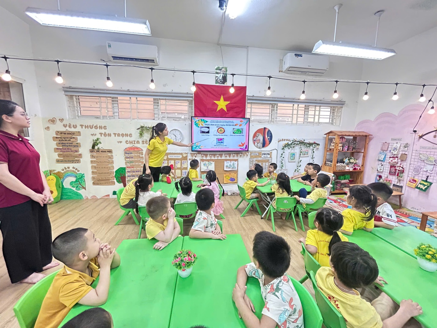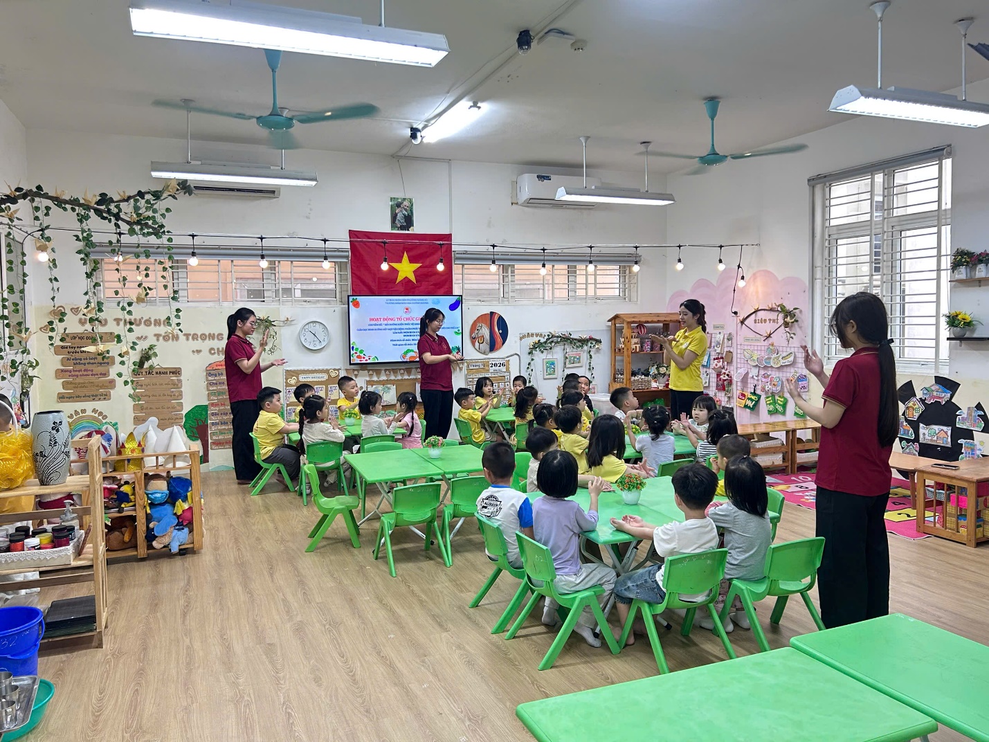 Ngay từ đầu giờ, các bé đã rất hào hứng khi được gặp gỡ những người bạn mới. Không gian lớp học trở nên rộn ràng với tiếng cười nói vui vẻ. Các con được sắp xếp ngồi xen kẽ giữa hai lớp, cùng nhau trò chuyện, làm quen và chia sẻ những câu chuyện nhỏ của mình.