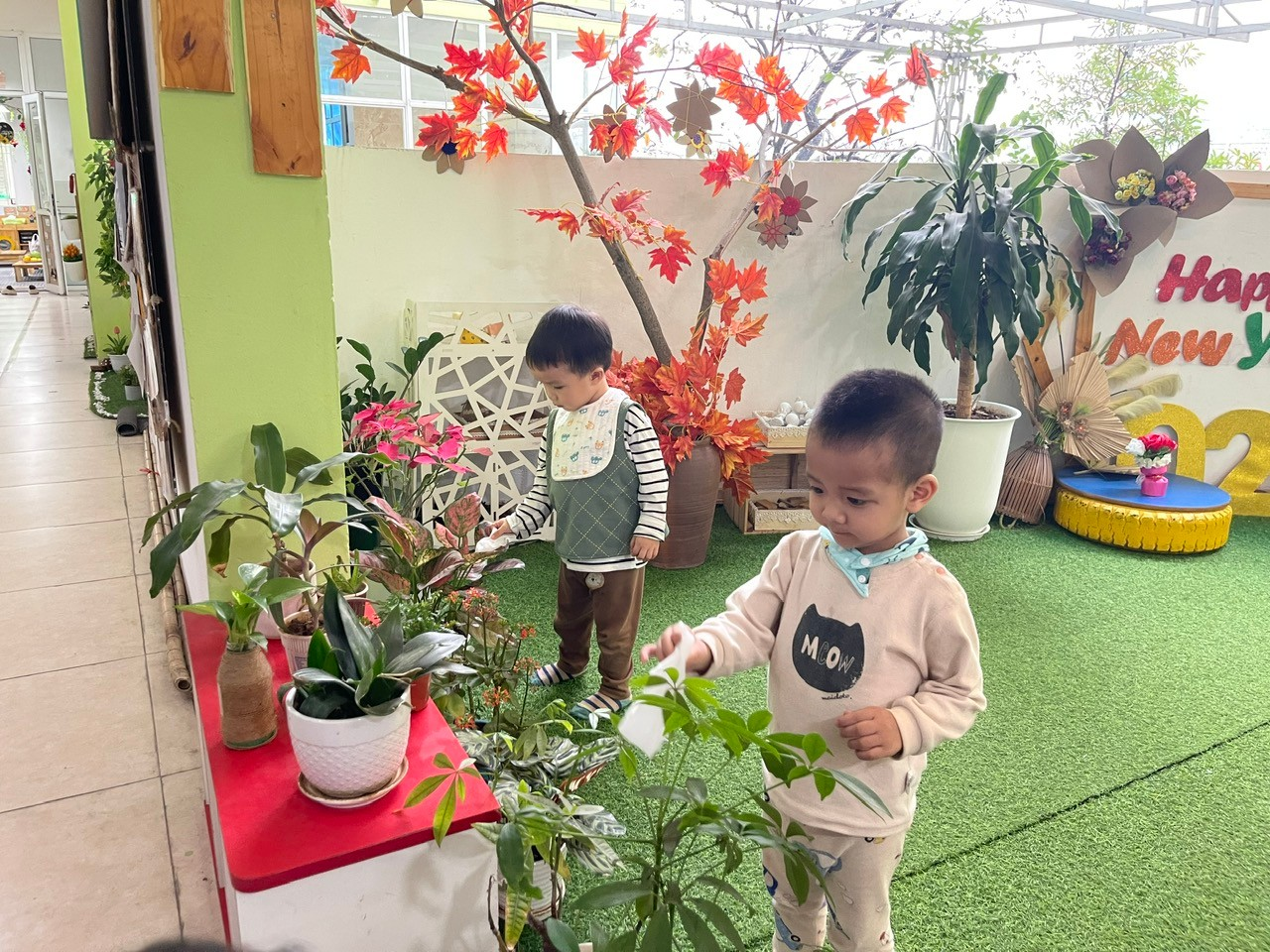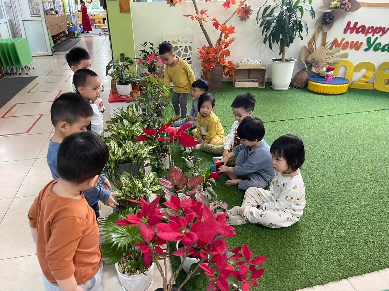 Trong hoạt động, các bé được cô giáo giới thiệu về lợi ích của cây xanh đối với cuộc sống như tạo bóng mát, làm đẹp môi trường và mang lại không khí trong lành. Dưới sự hướng dẫn nhẹ nhàng của cô, trẻ được trải nghiệm những thao tác đơn giản phù hợp với lứa tuổi như xúc đất, đặt cây vào chậu, tưới nước cho cây. Những đôi tay nhỏ xinh tuy còn vụng về nhưng tràn đầy sự thích thú và khám phá.