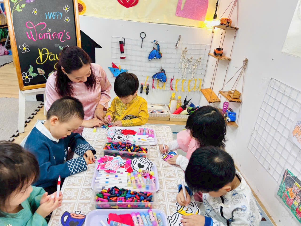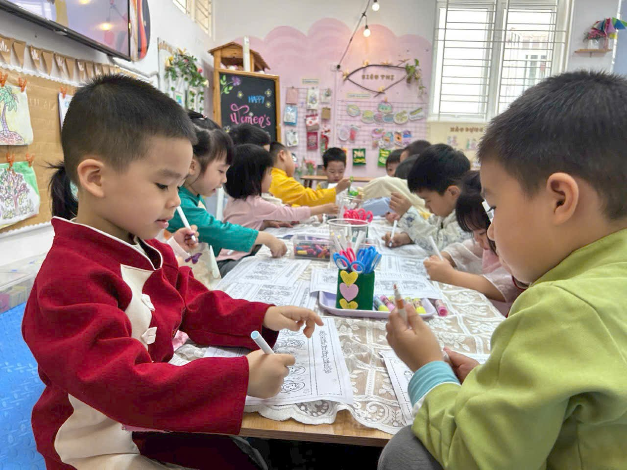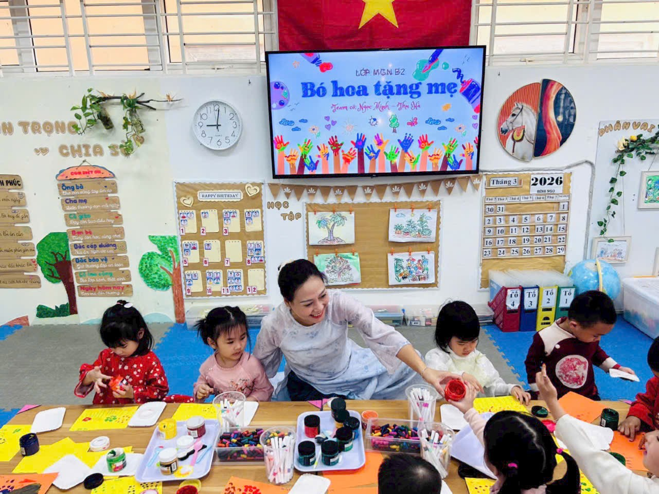 Không khí lớp học trở nên rộn ràng và ấm áp khi các bé hào hứng chia sẻ về mẹ, về cô giáo của mình. Mỗi sản phẩm tuy đơn giản nhưng chứa đựng tình yêu thương lớn lao, thể hiện sự quan tâm và sự trưởng thành trong cảm xúc của trẻ.