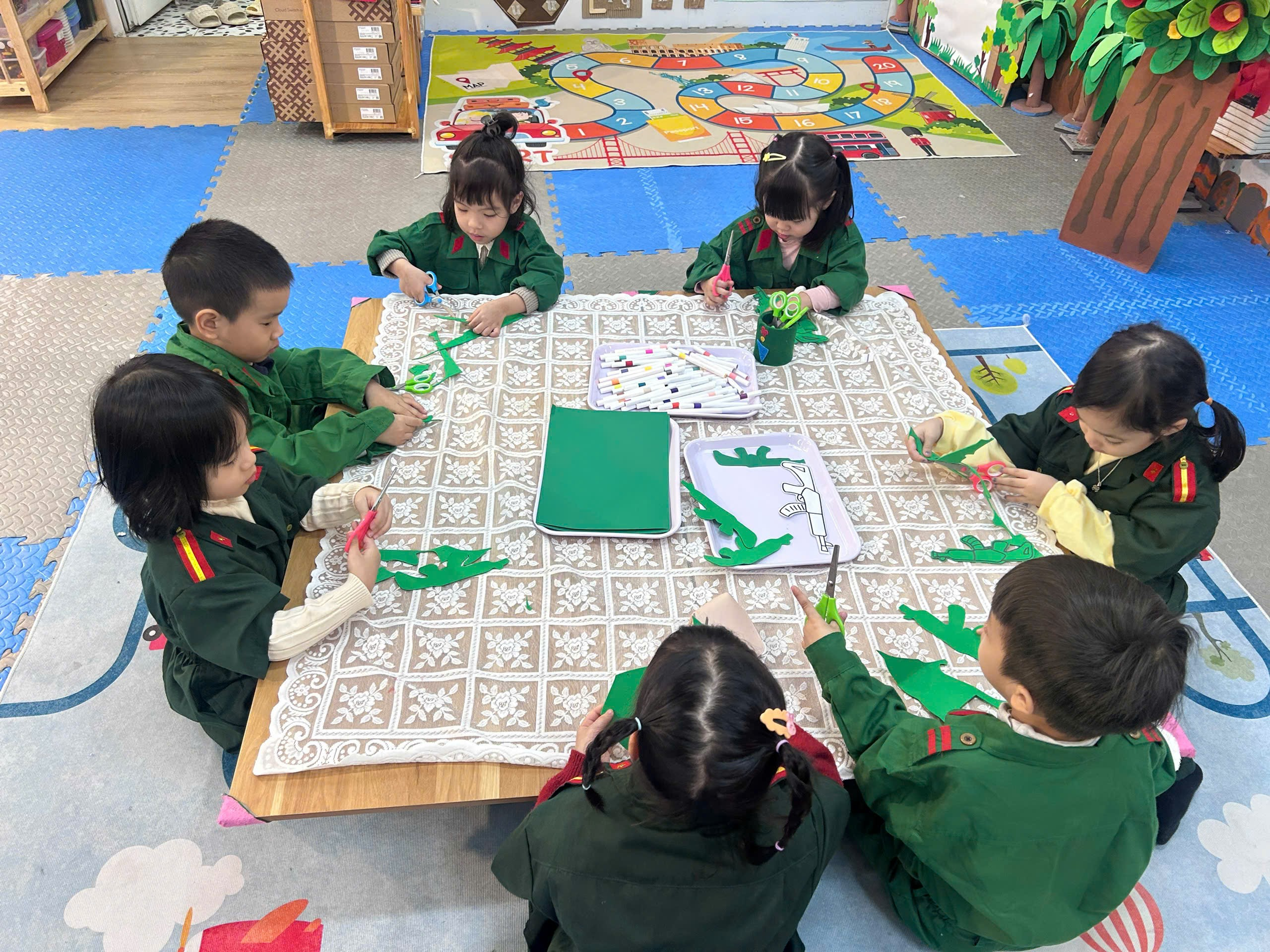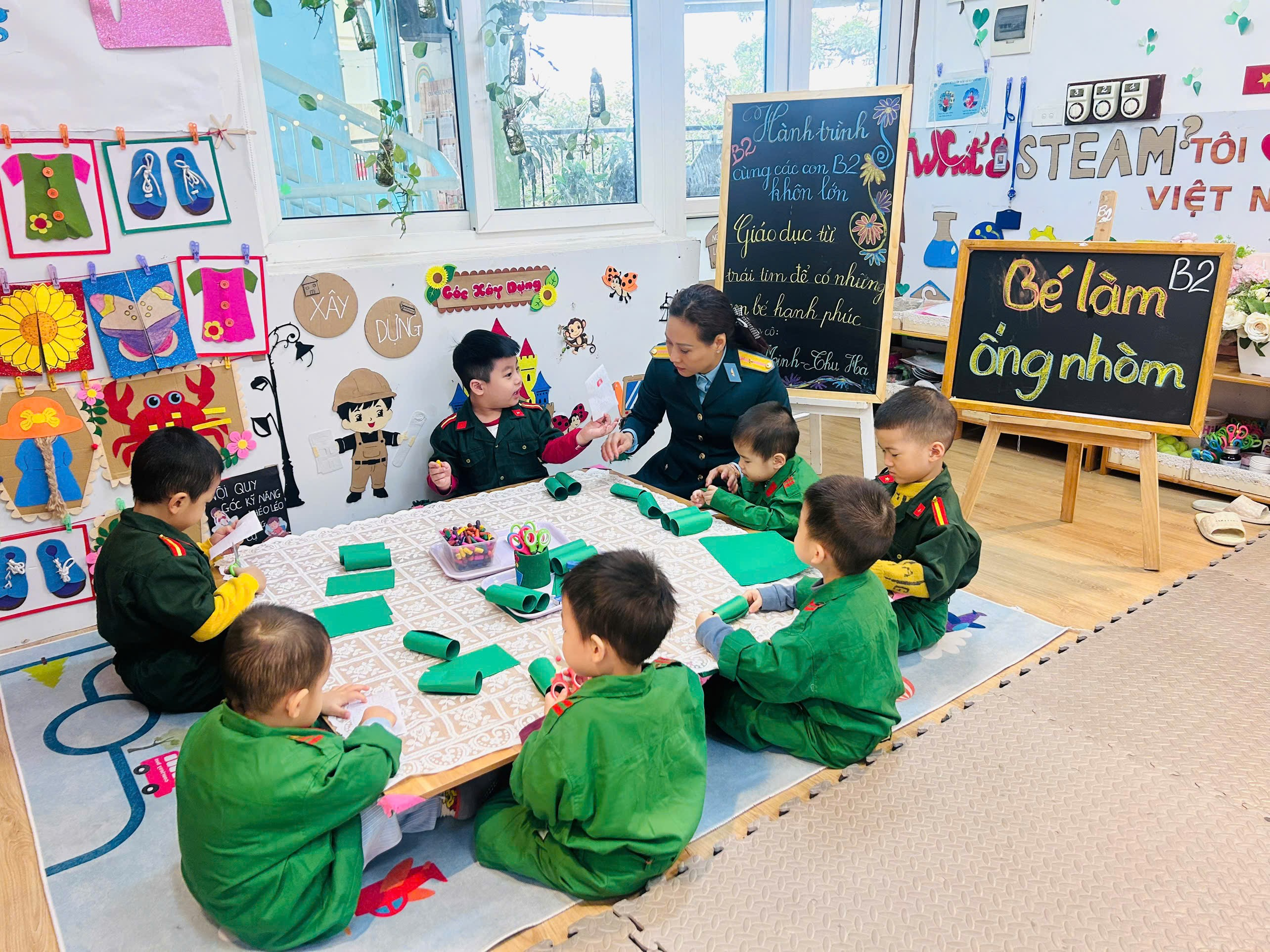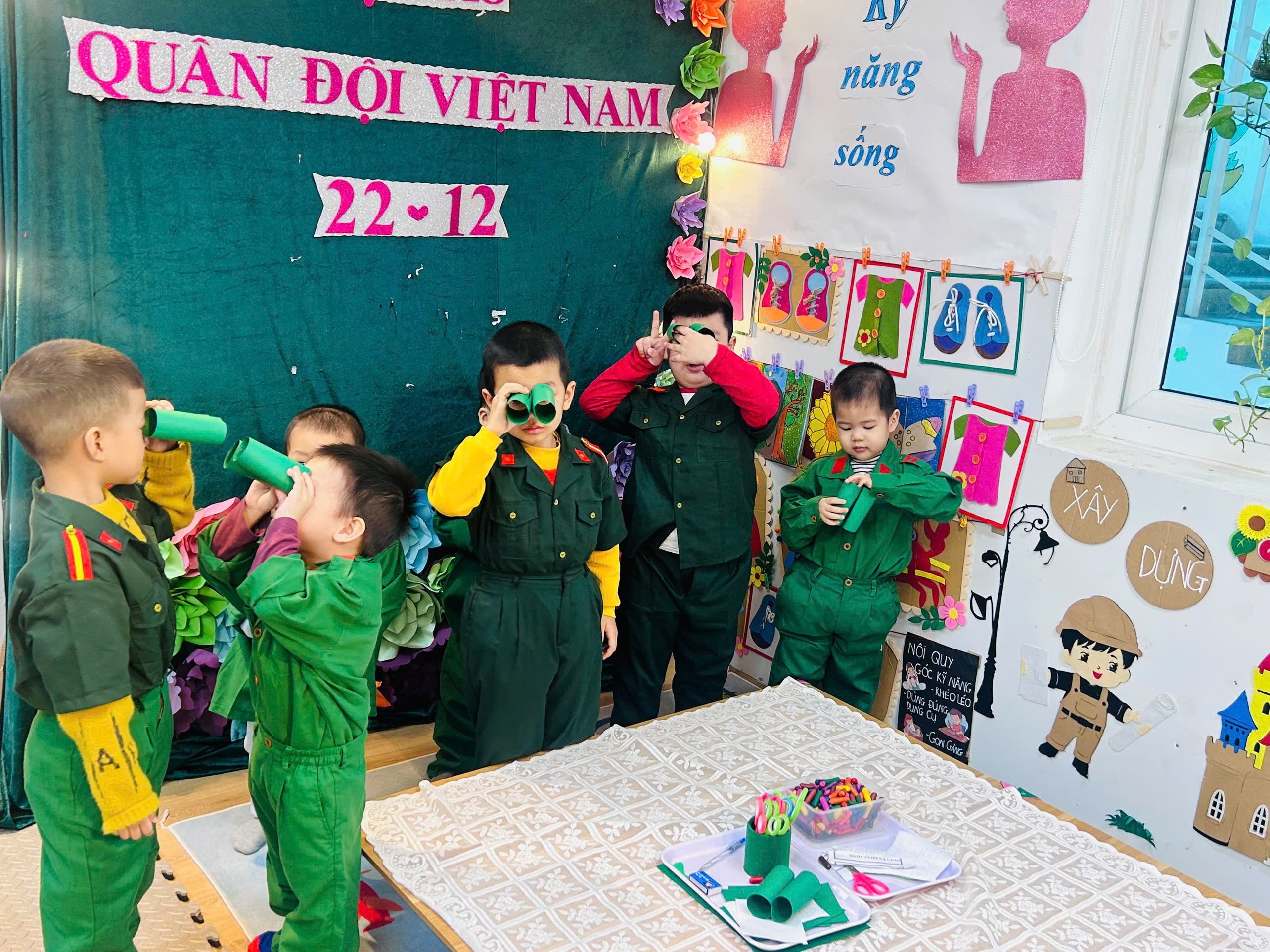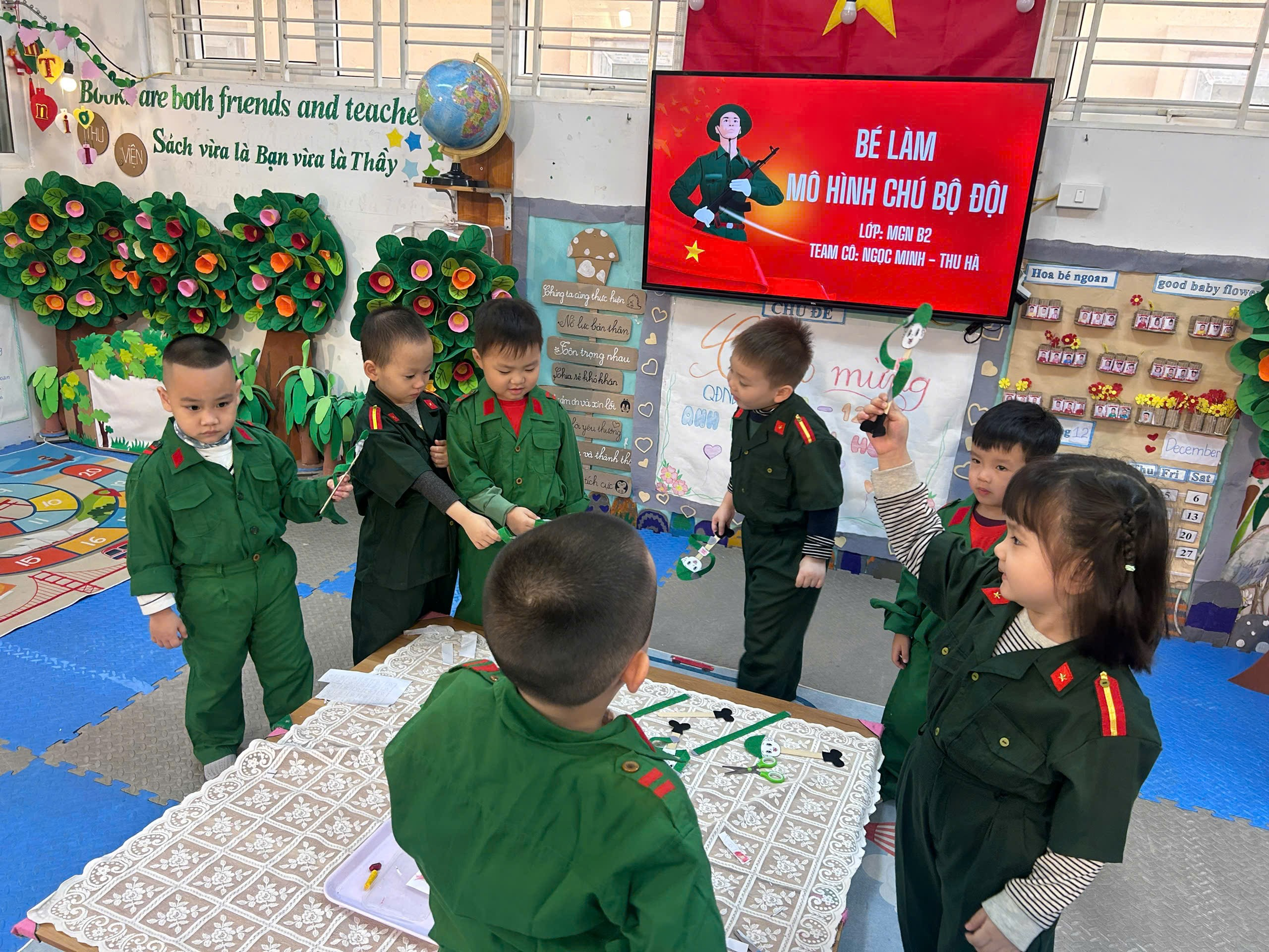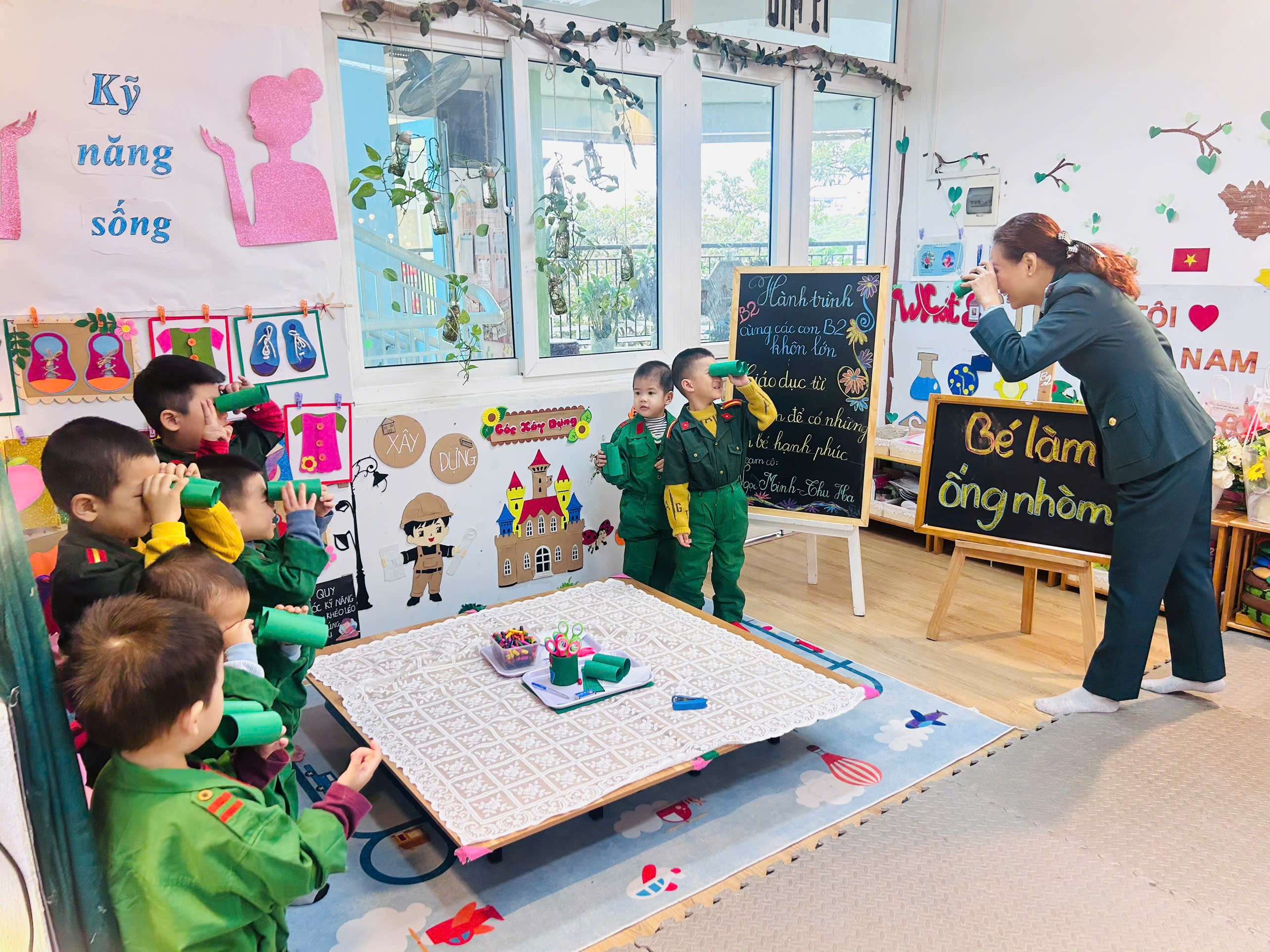 Các con còn được tạo hình mô hình chú bộ đội, phối hợp cùng bạn để hoàn thiện sản phẩm, từ đó phát triển tư duy sáng tạo và kỹ năng làm việc nhóm. Đặc biệt, hoạt động làm ống nhòm mang đến trải nghiệm thú vị khi các bé hóa thân thành những “chú bộ đội nhỏ”, giúp giờ học trở nên sinh động và tràn ngập tiếng cười.