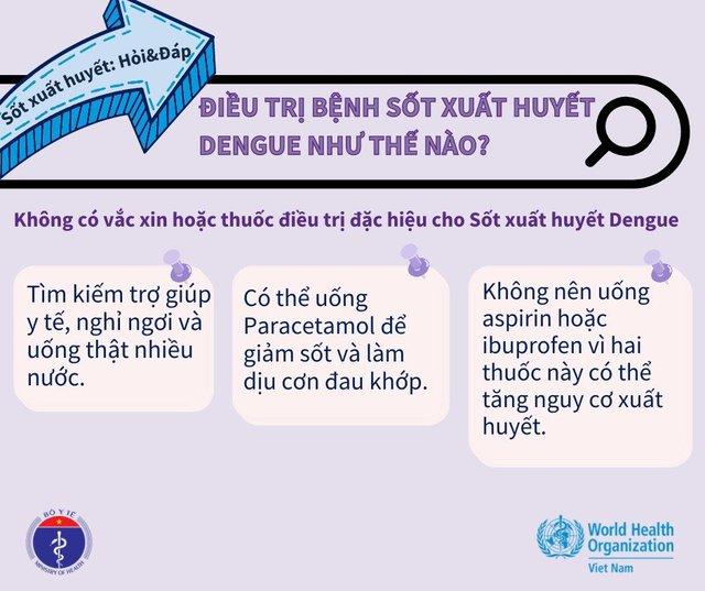 Theo tài liệu Hỏi - Đáp về bệnh sốt xuất huyết Dengue do Tổ chức Y tế Thế giới cập nhật ngày 2/6/2022, hiện chưa có vaccine hoặc thuốc điều trị đặc hiệu bệnh sốt xuất huyết Dengue.