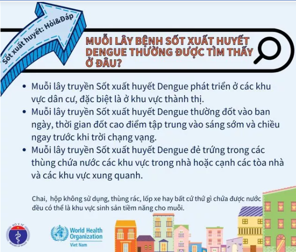 Muỗi Dengue đẻ trứng ở các lu/vại/thùng chứa nước bên trong nhà và các khu vực xung quanh nơi ở (bao gồm chai lọ, lọ hoa, thùng/xô/chậu/bình, rác thải, lốp hỏng, vv… chứa nước đọng).