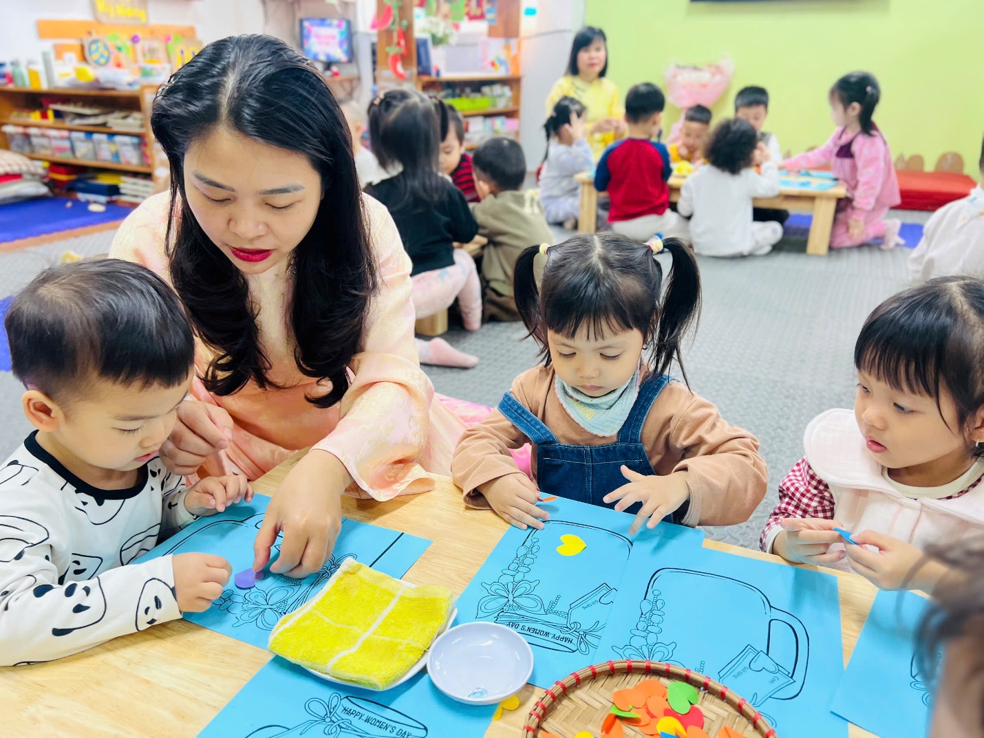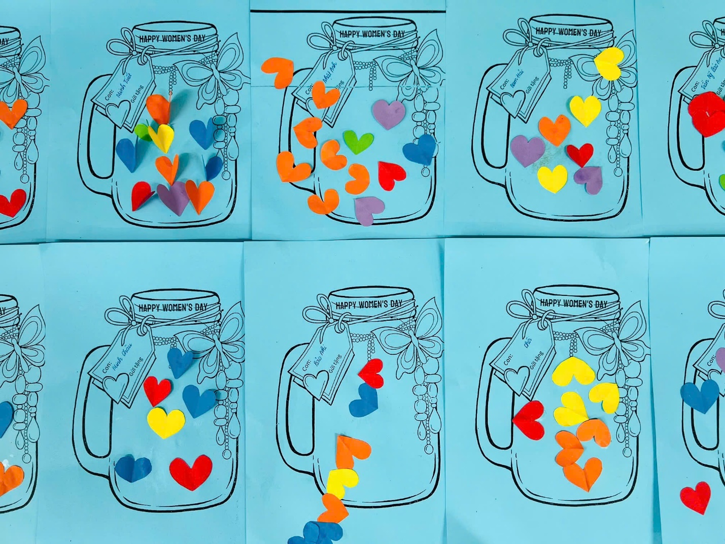 Trong không khí vui tươi chào mừng "Quốc tế phụ nữ 8/3" các bé vô cùng hào hứng khi được tự tay lựa chọn màu sắc, hình dán, bông hoa nhỏ xinh để trang trí cho chiếc bình của mình. Dưới sự hướng dẫn tận tình của các cô giáo, từng đôi bàn tay bé xíu cẩn thận phết hồ, dán hoa, tô màu… Mỗi sản phẩm là một ý tưởng sáng tạo riêng, không chiếc nào giống chiếc nào, Điều đáng yêu nhất là ở mỗi “chiếc bình”, các con không chỉ thể hiện sự khéo léo mà còn gửi vào đó tình cảm yêu thương của các bé.