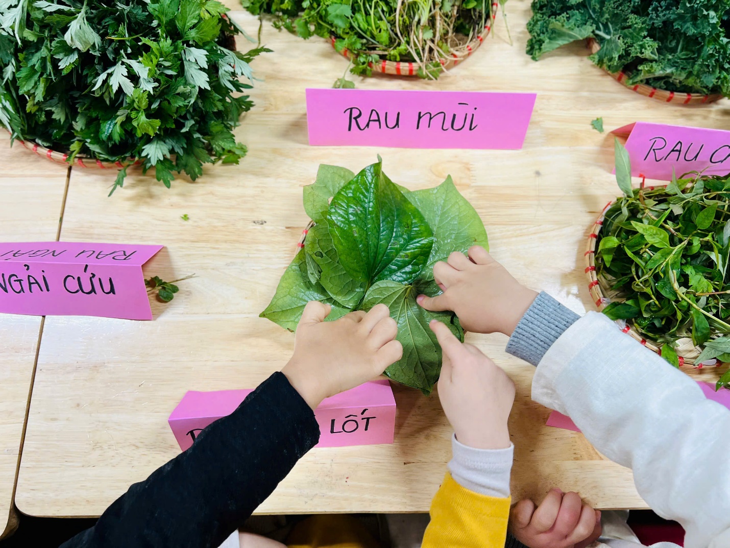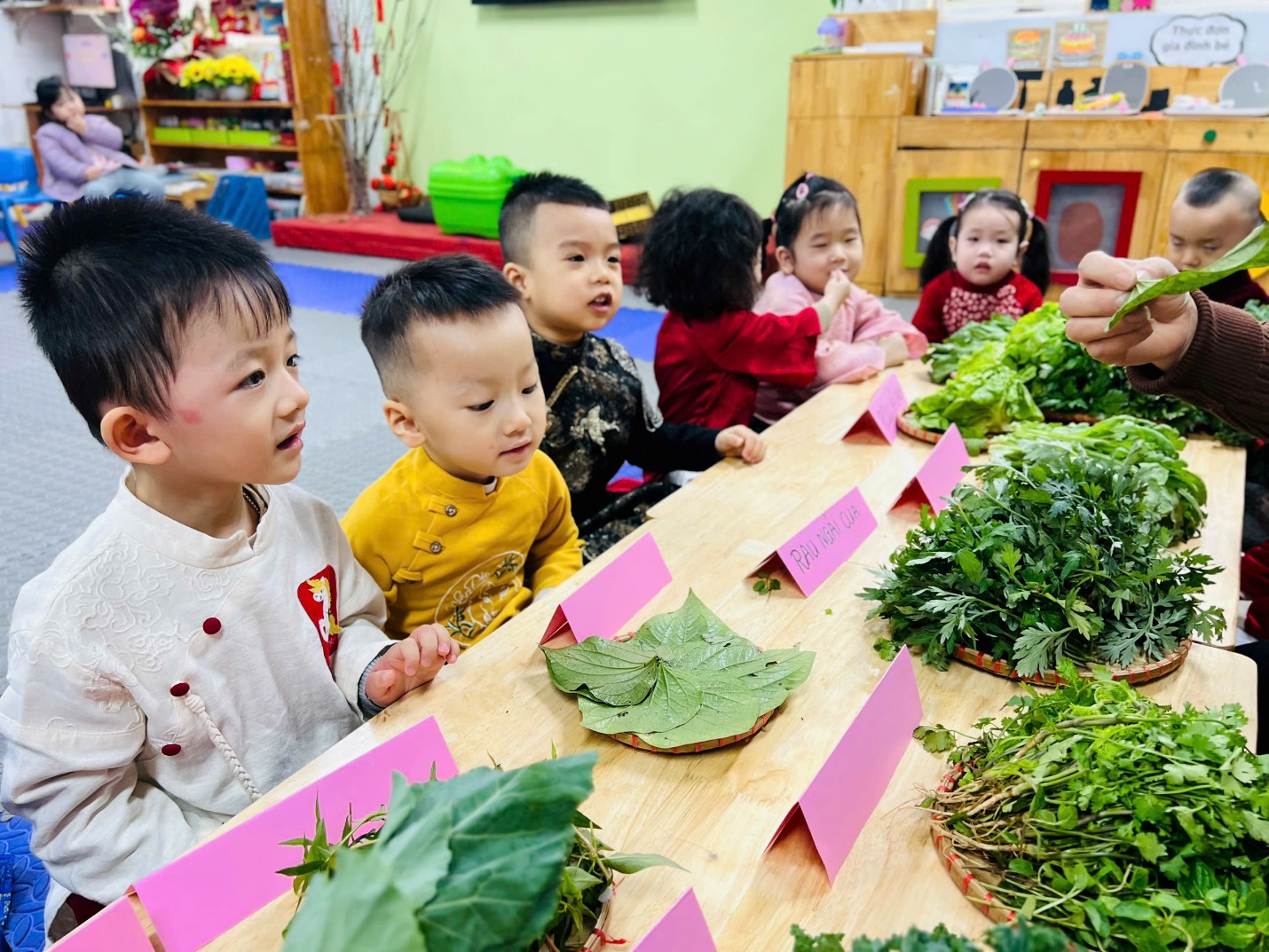Ngay từ đầu hoạt động, cô giáo mang đến “gian hàng rau củ” đầy màu sắc: rau mùi, su hào, rau cải kale, rau xà lách, lá lốt, cà chua,… Các bé được sờ – ngửi – quan sát để cảm nhận đặc điểm của từng loại: màu sắc, hình dáng, mùi hương, vỏ nhẵn hay sần, cứng hay mềm…đã thu hút sự tò mò, thích thú của các bé.