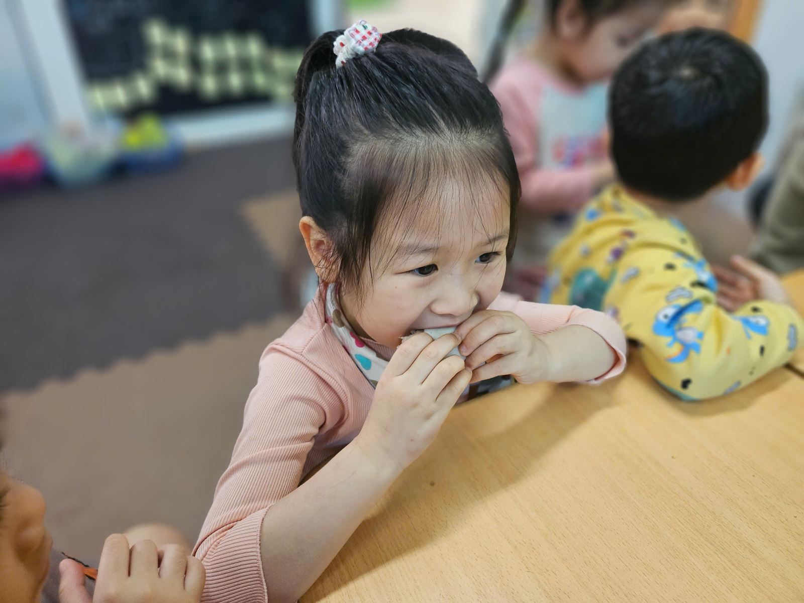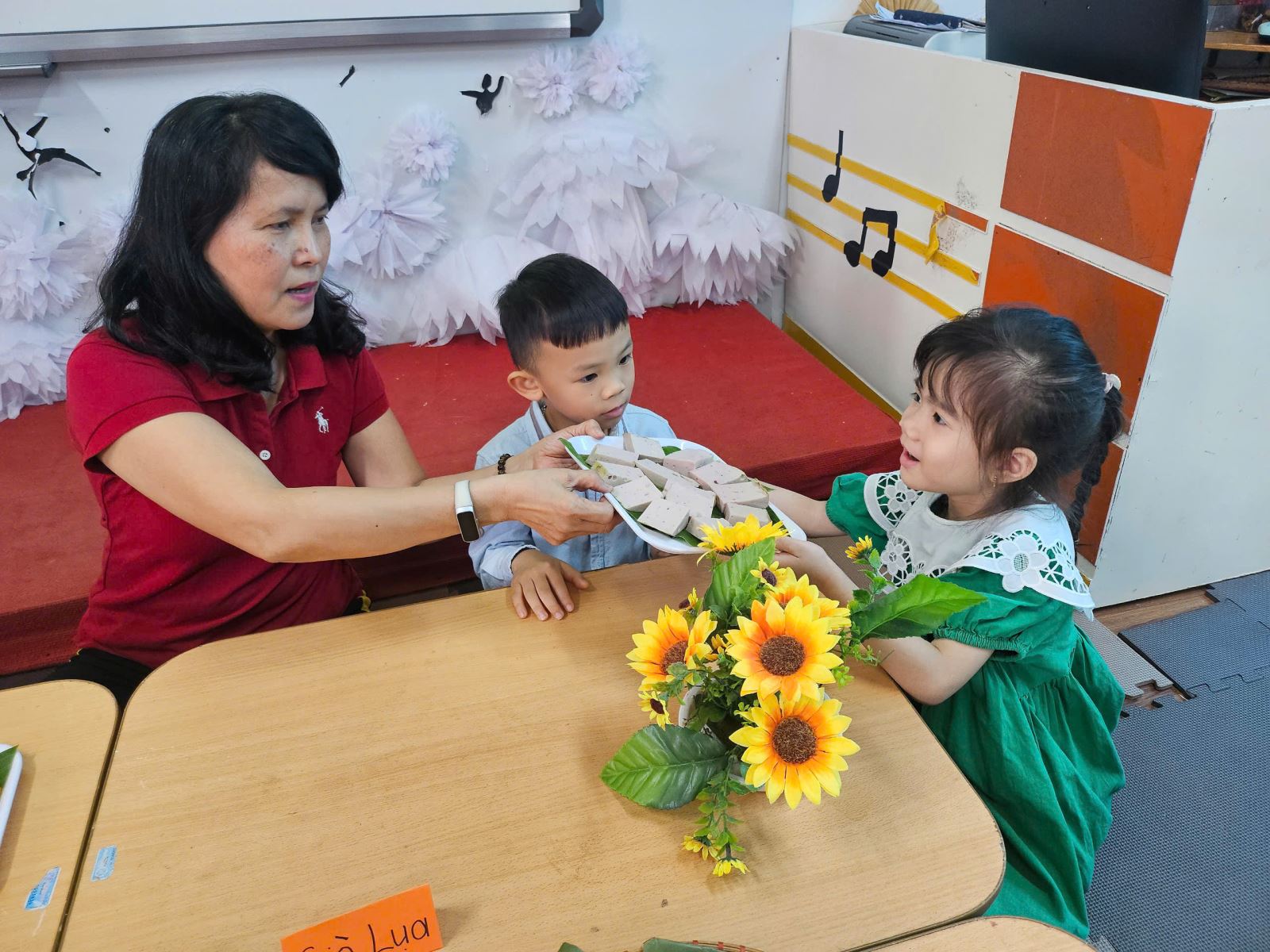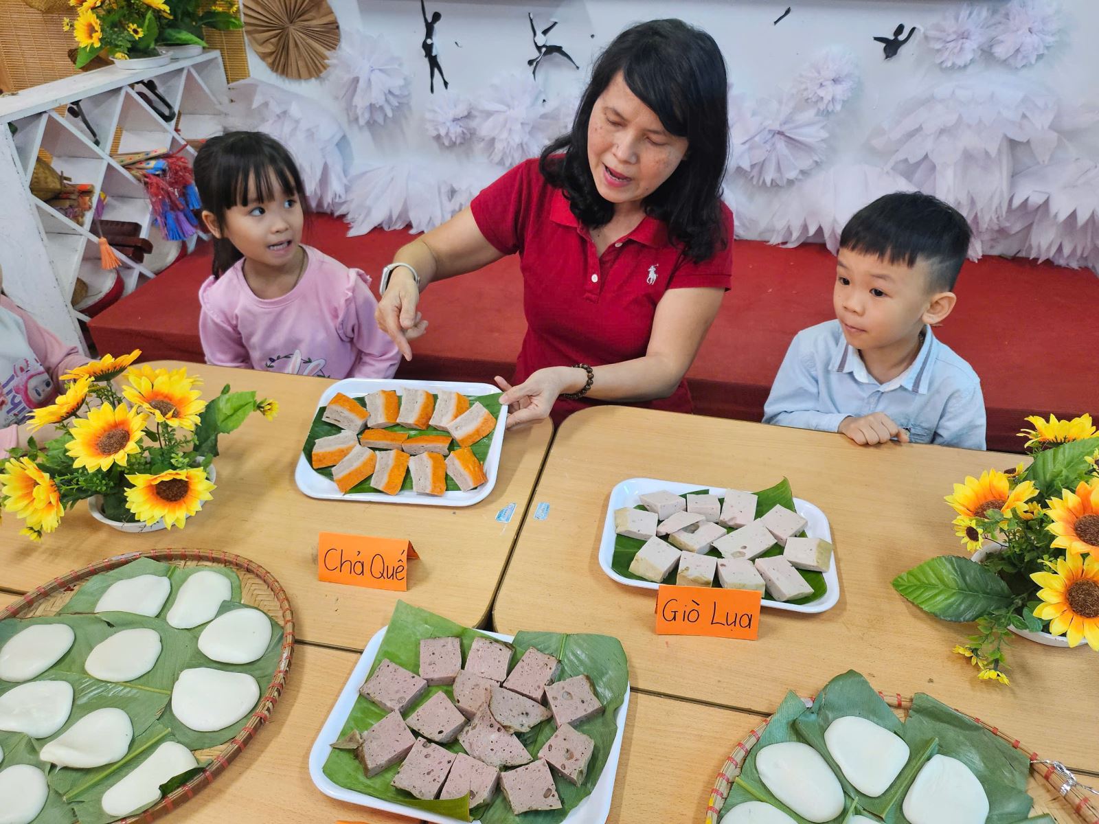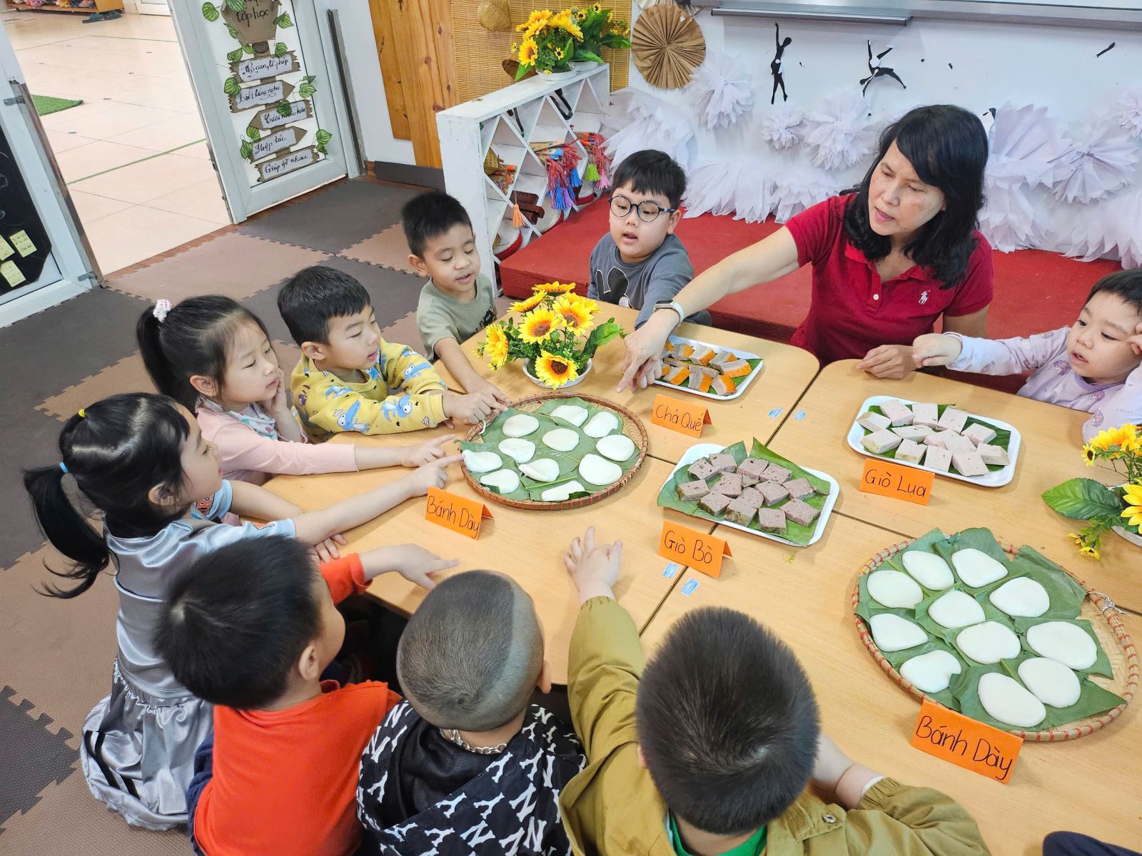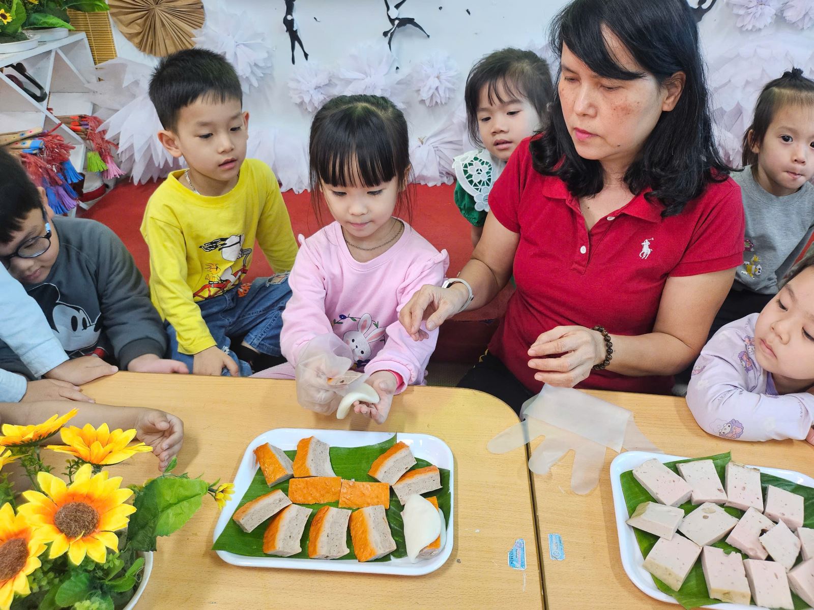 Không chỉ vậy, các bé còn được tham gia vào các hoạt động trải nghiệm thực tế như khám phá các nguyên vật liệu, quy trình làm chiếc bánh dày và được thưởng thức những chiếc bánh dày trắng tròn, thơm ngon.