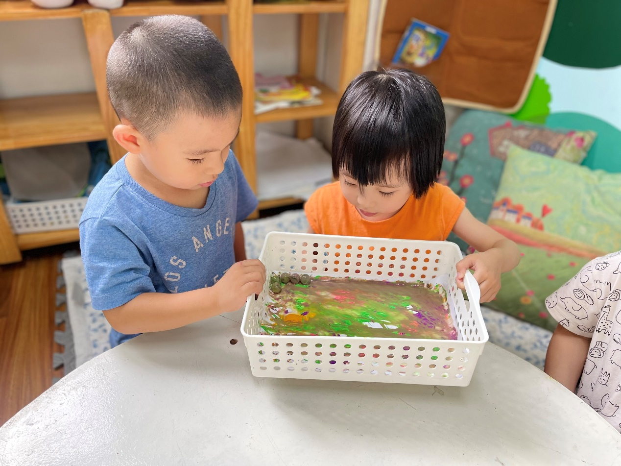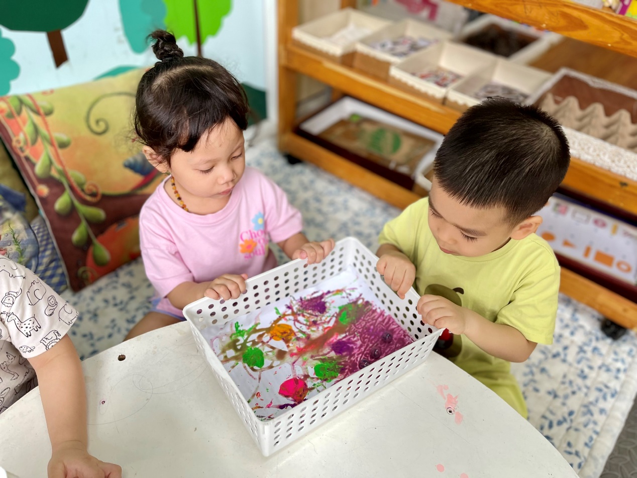 🔸 Vẽ tranh lăn bóng: Chỉ cần vài giọt màu nước và vài viên bi lăn trong hộp giấy, các bé đã tạo ra những tác phẩm đầy ngẫu hứng, thể hiện sự pha trộn kỳ diệu của màu