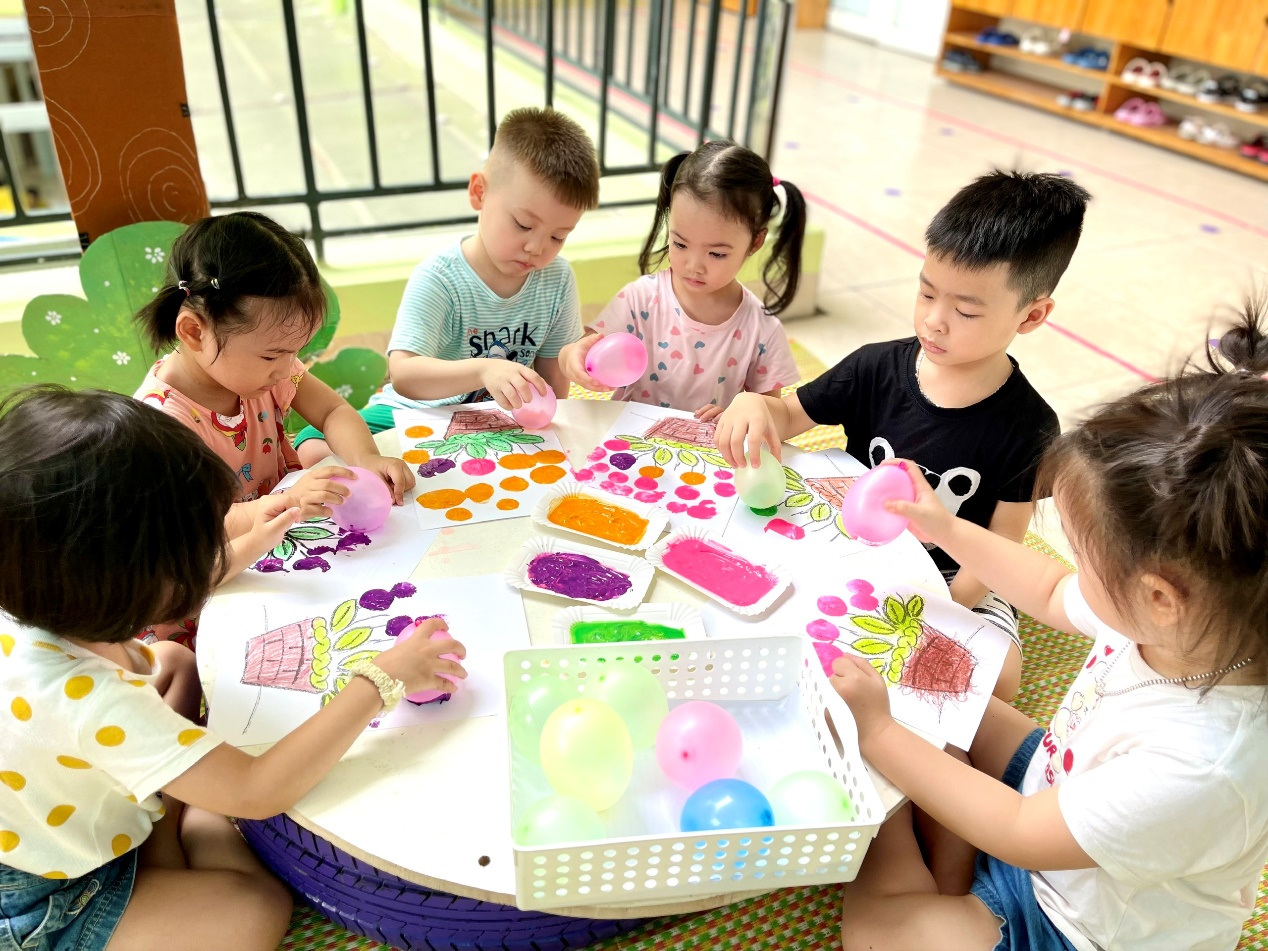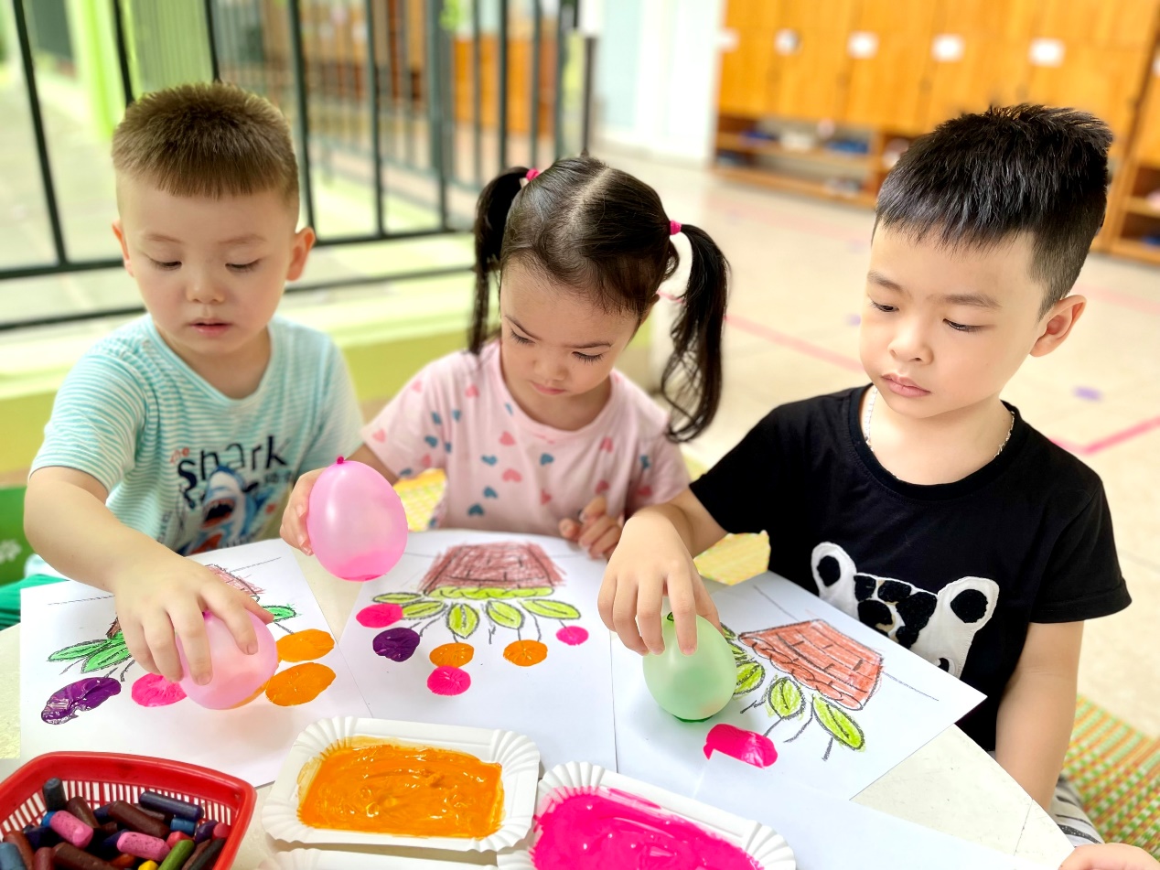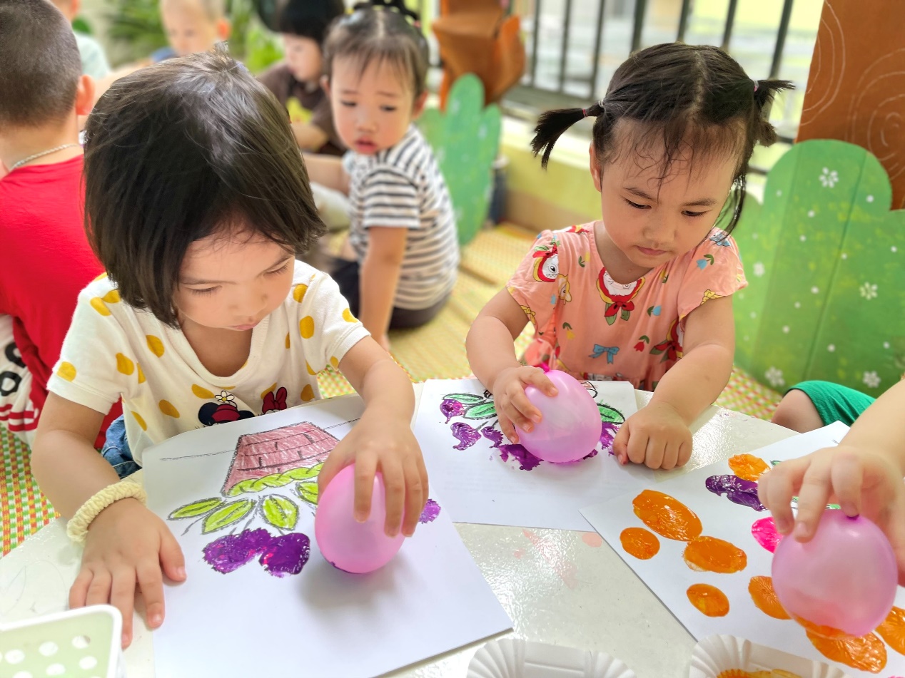 🔸 In hình nghệ thuật với bóng bay: Những quả bóng nhỏ được nhúng vào khay màu rồi in lên giấy khổ lớn, tạo nên những bức tranh tập thể rực rỡ sắc màu như một khu vườn mùa xuân.